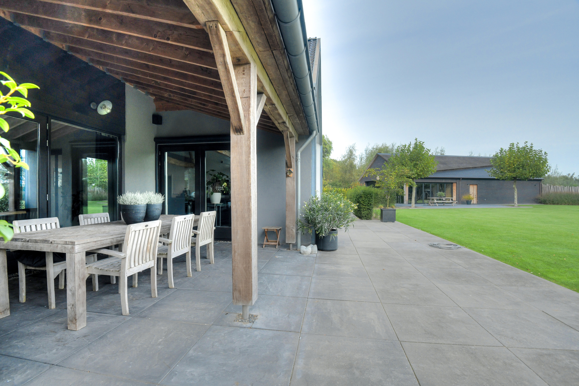 Openslaande deuren bieden toegang tot de veranda. Ook vanuit deze veranda, waar een buitenhaard geplaatst is, heeft u prachtig zicht op de tuin en het achterliggend gebied.