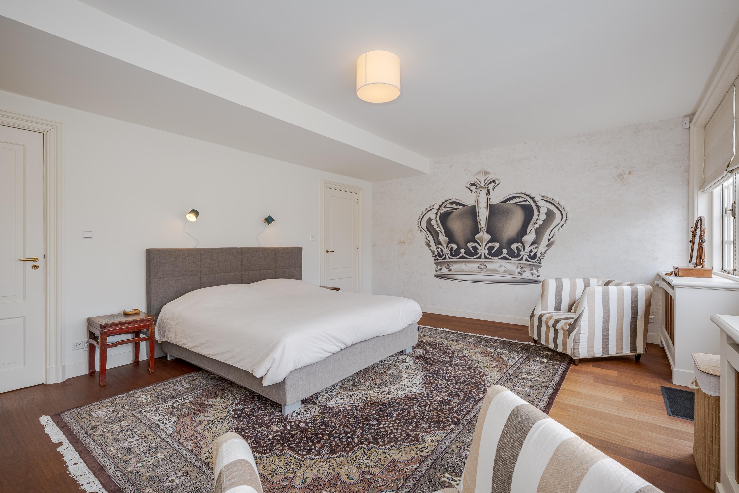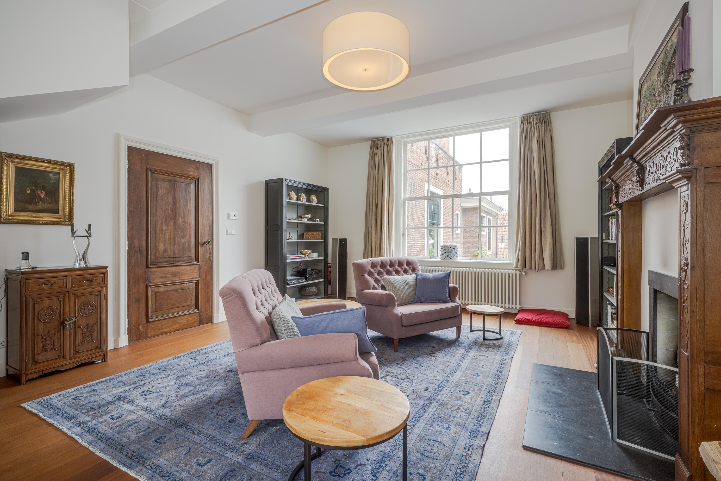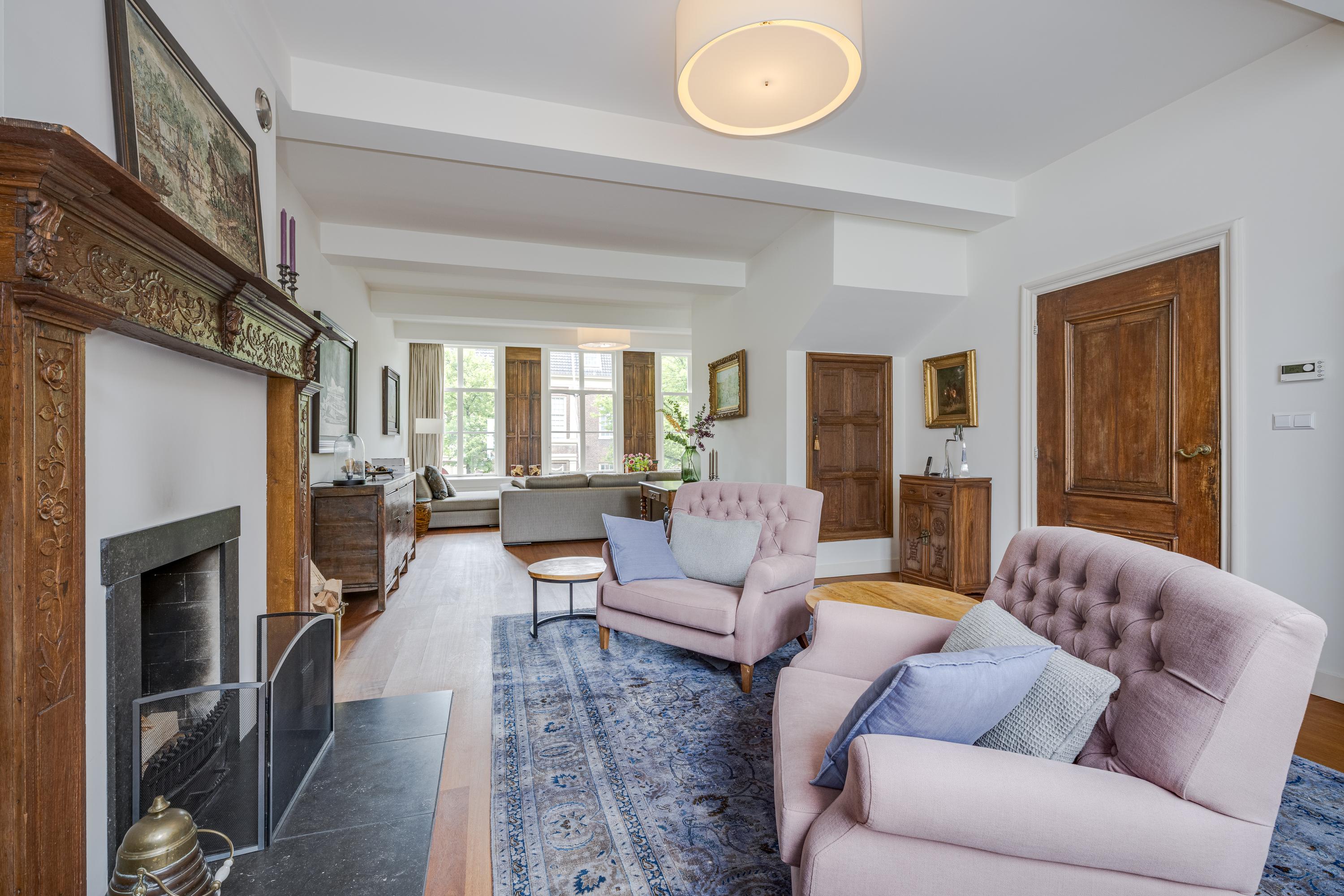 Een monumentale trap leidt naar de eerste verdieping. In het achterhuis bevindt zich een separaat toilet en een slaapkamer met moderne badkamer en suite. In het voorhuis treft u de zeer ruime en lichte woonkamer met aan de tuinzijde een zitkamer rondom de haardpartij en aan de voorzijde (3 ramen breed) een fijne lichte woonkamer met prachtig uitzicht op de gracht en de stad.