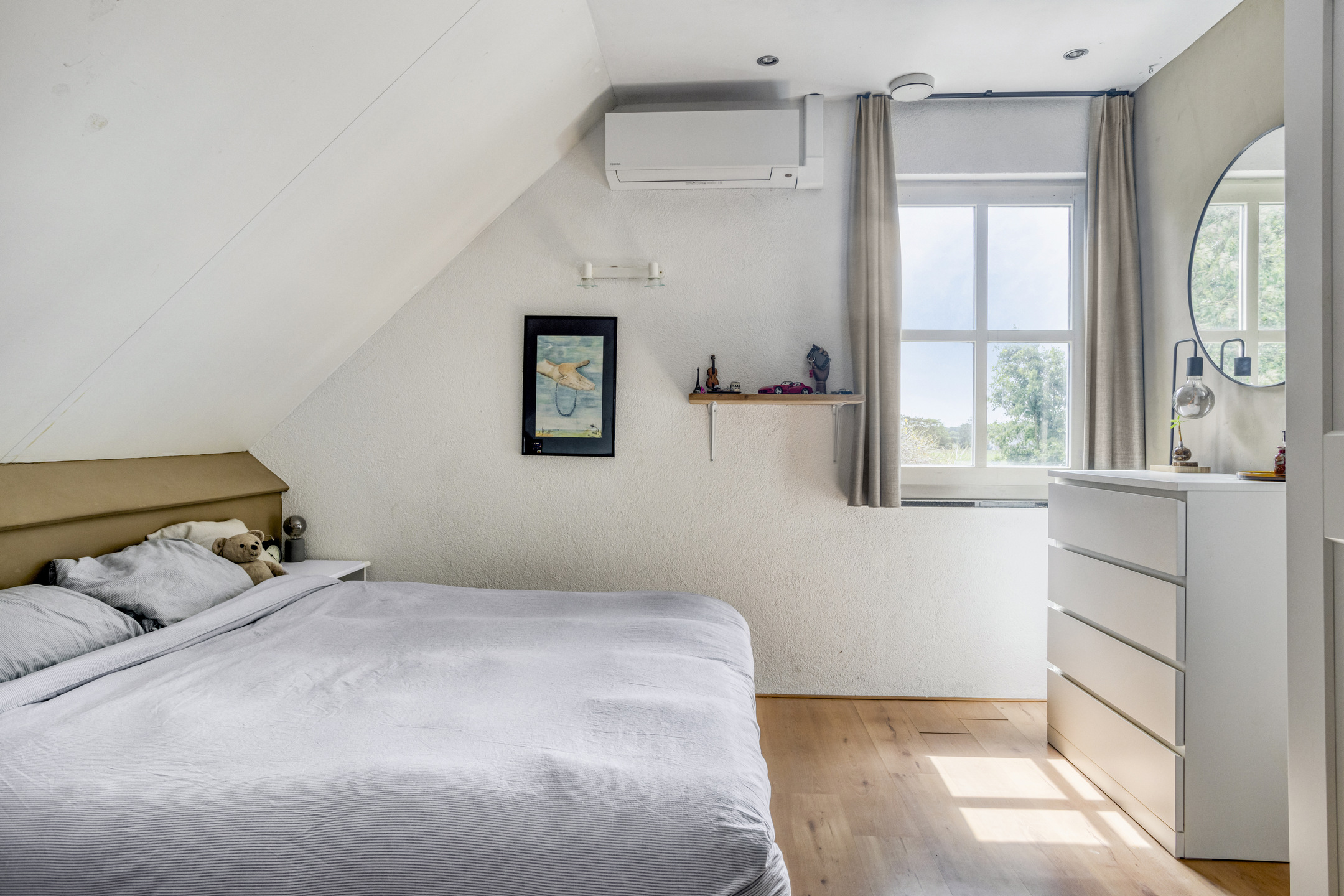 slaapkamer links voor (ca. 16 m²) met airco-installatie, wandafwerking sierpleister en stucwerk, vloer afgewerkt met laminaat, schuurwerk plafond;