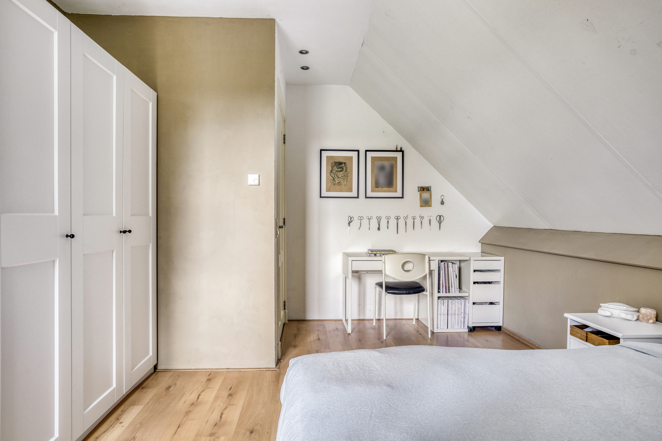 slaapkamer links achter (ca. 16,5 m²) met een dakkapel en airco-installatie, wandafwerking sierpleister, vloer afgewerkt met laminaat, schuurwerk plafond;