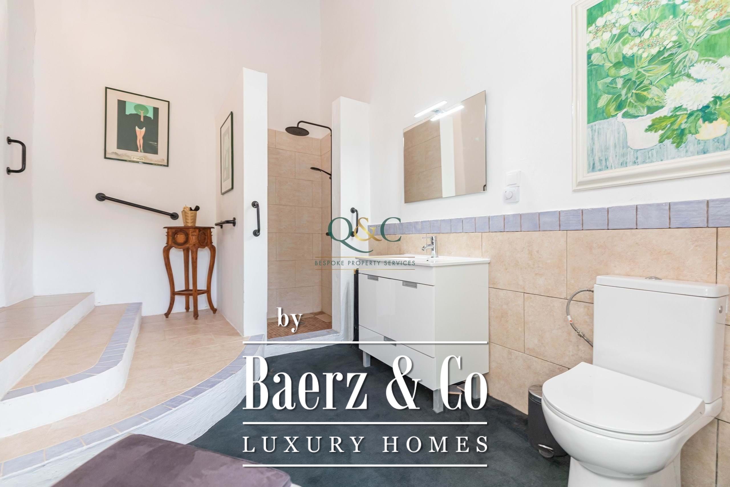 Een smeedijzeren wenteltrap leidt naar het dakterras, waar panoramisch uitzicht op bergen en omringend landschap een serene sfeer creëert. Buitenruimtes nodigen uit tot slow living met een zwembad, douche, BBQ, eet- en zithoeken, alles omgeven door volgroeide tuinen en de beslotenheid van oude bomen. Privéparkeergelegenheid is aanwezig bij de entree en praktische voorzieningen zoals een voorraadkamer, geboorde waterput, septic tank en waterreservoir vergroten de zekerheid en zelfstandigheid.