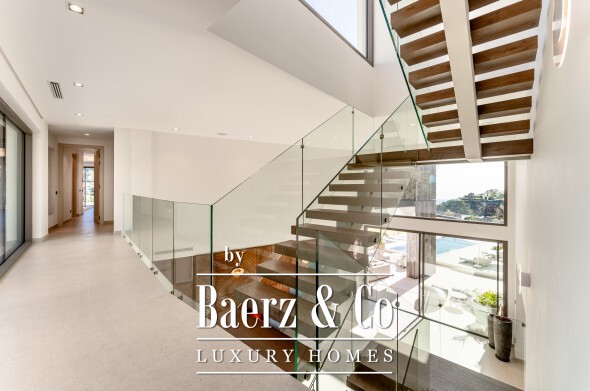 De bovenverdieping biedt privacy en perspectief. De mastersuite beschikt over twee badkamers, gescheiden kleedkamers en brede glaspartijen die het landschap omlijsten. Twee aanvullende gastensuites, waarvan één met privéterras, maken dit toevluchtsoord compleet. Op de benedenverdieping wacht een wellnessruimte met verwarmd binnenzwembad, sauna, fitness en stoombad, aangevuld met een entertainmentlounge, klimaatgereguleerde wijnkelder en een medewerkersappartement met eigen keuken. Vier auto's staan veilig in de garage; gastparkeerplaatsen zijn er voor zes voertuigen.