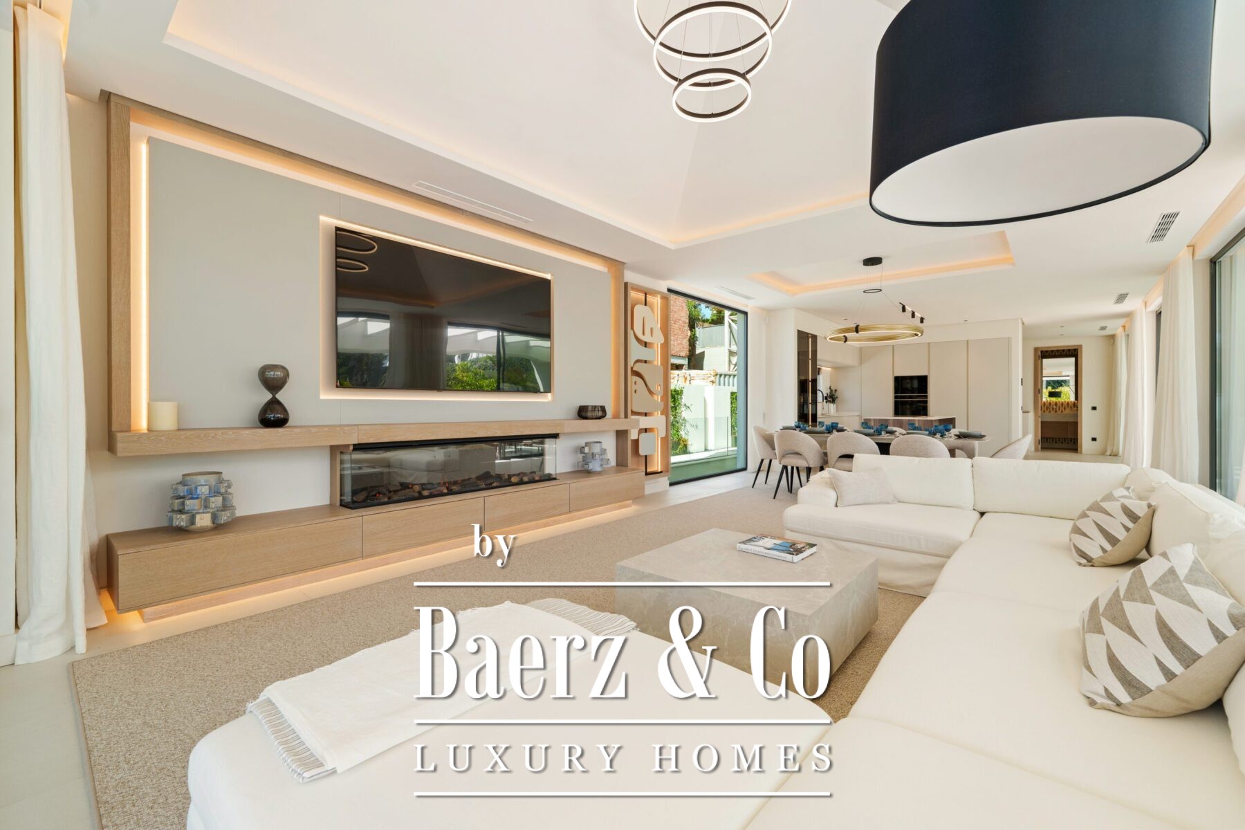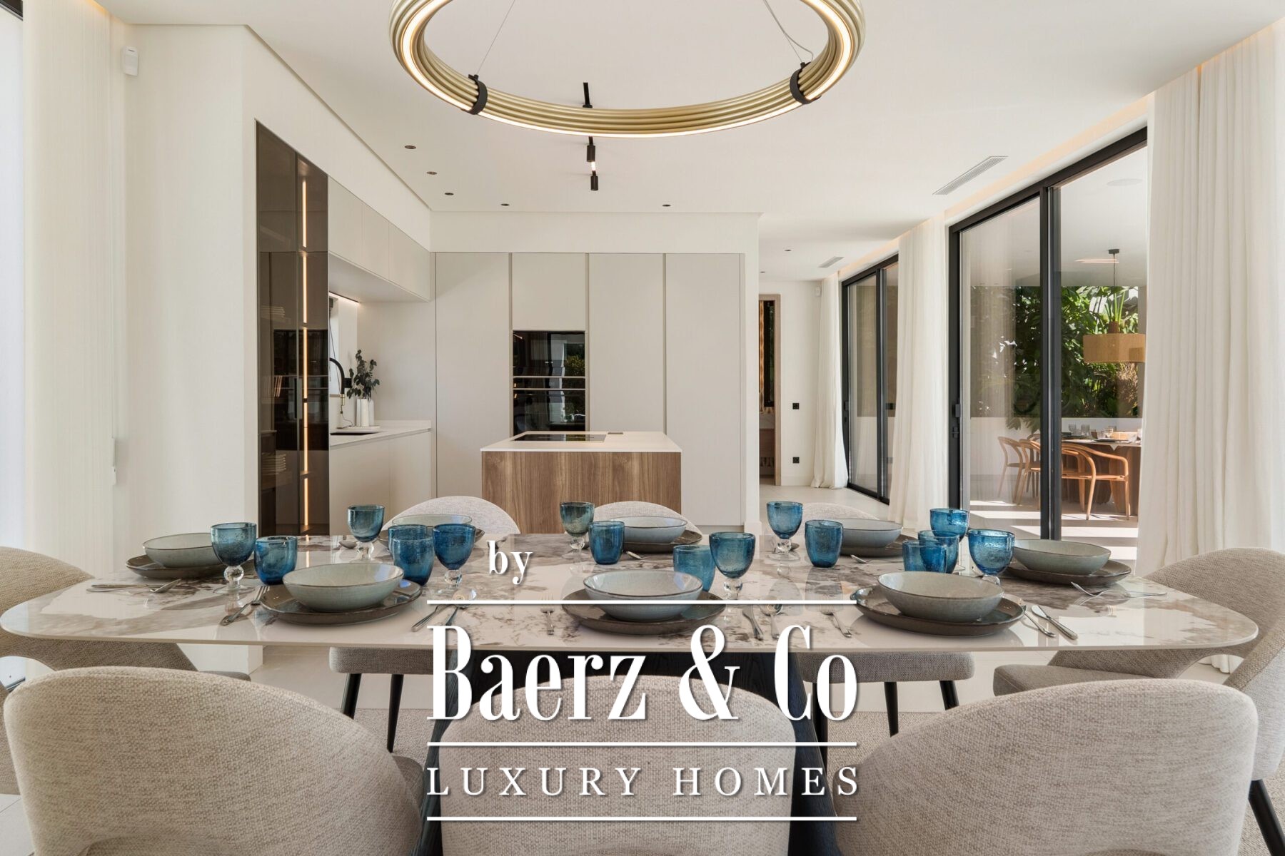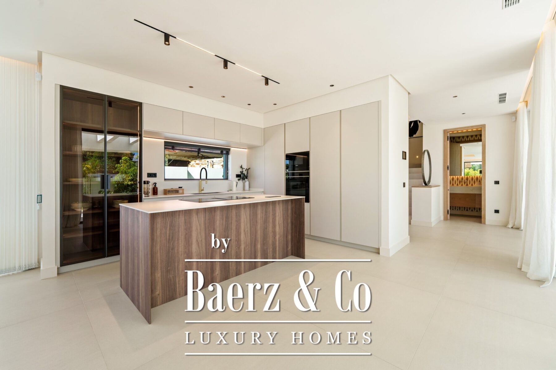 Het interieur ademt licht en sereniteit, met zachte neutrale tinten, subtiele inbouwverlichting en royale raampartijen van vloer tot plafond die het Andalusische licht binnenlaten. De open leef- en eetruimte, voorzien van een op maat gemaakte entertainmentwand en moderne afwerking, loopt naadloos over in de hoogwaardige keuken waar een houten kookeiland en geïntegreerde apparatuur samengaan met strak vormgegeven kasten. Deze vloeiende ruimte-ervaring zet zich voort in de eetkamer, ideaal voor betekenisvolle samenzijn.