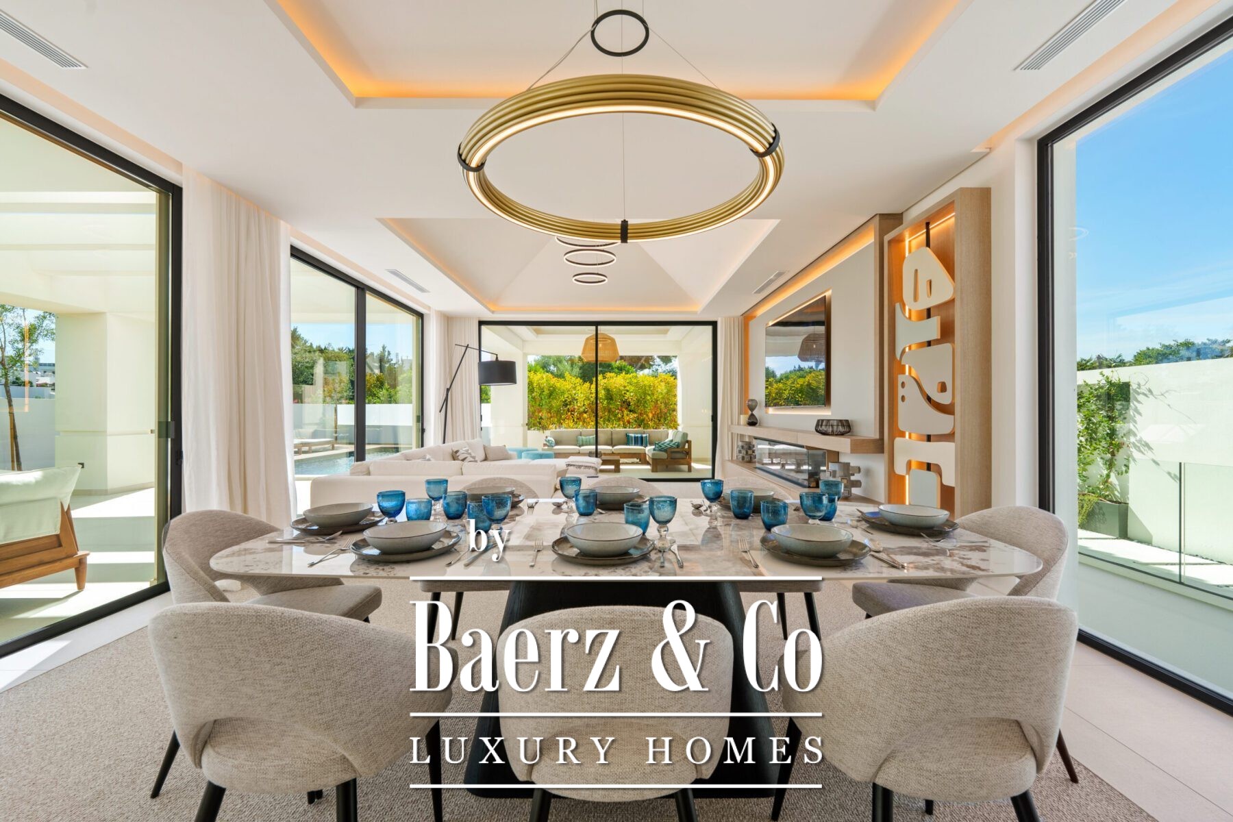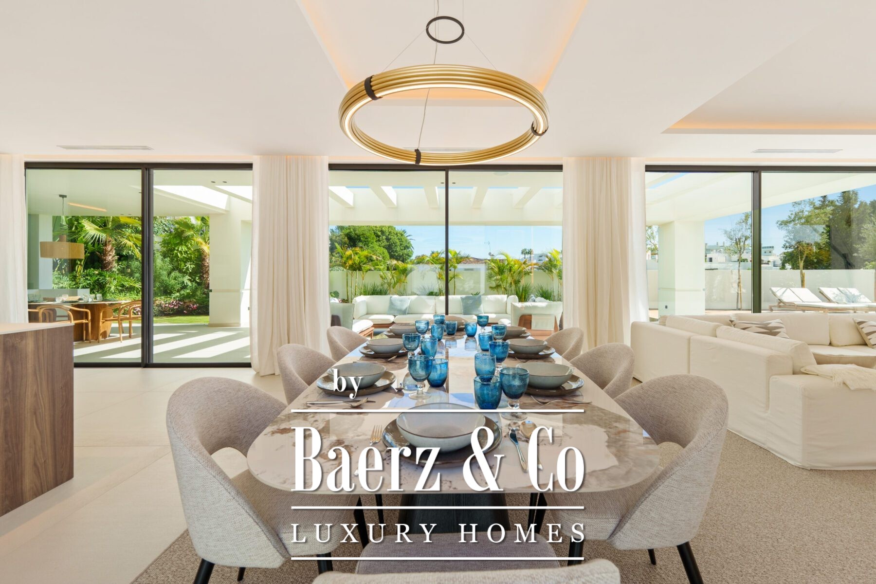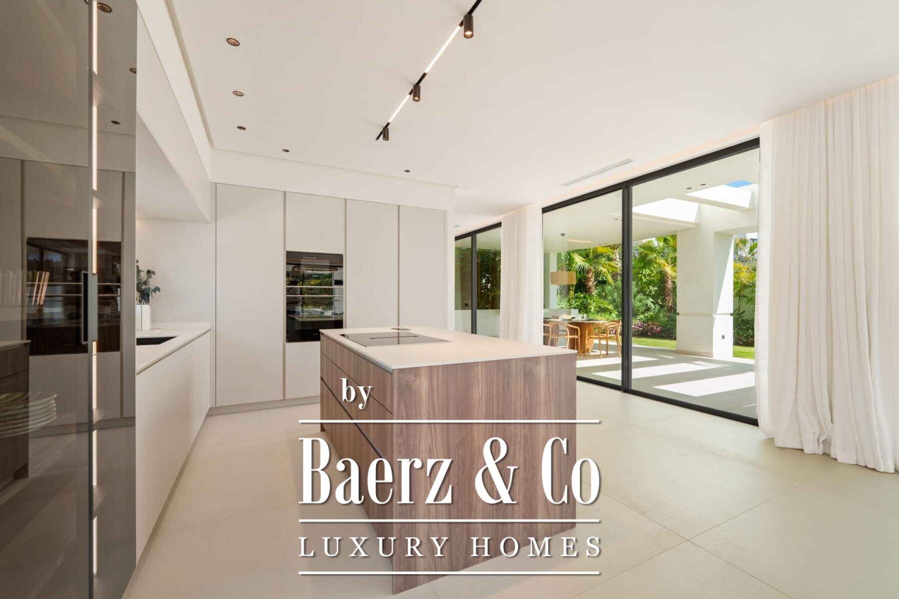 Het interieur ademt licht en sereniteit, met zachte neutrale tinten, subtiele inbouwverlichting en royale raampartijen van vloer tot plafond die het Andalusische licht binnenlaten. De open leef- en eetruimte, voorzien van een op maat gemaakte entertainmentwand en moderne afwerking, loopt naadloos over in de hoogwaardige keuken waar een houten kookeiland en geïntegreerde apparatuur samengaan met strak vormgegeven kasten. Deze vloeiende ruimte-ervaring zet zich voort in de eetkamer, ideaal voor betekenisvolle samenzijn.