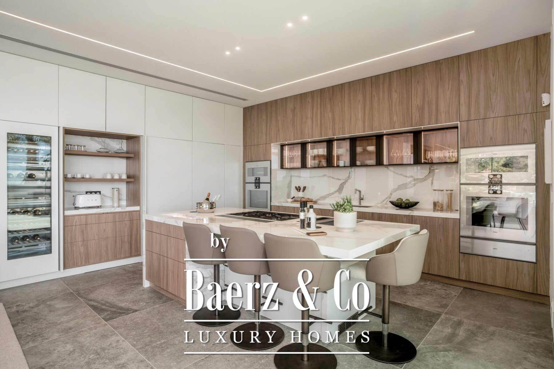 De keuken voldoet aan alle hedendaagse eisen, uitgerust met Gaggenau-apparatuur en Danespan-keukenkasten, terwijl het aangrenzende thuiskantoor zorgt voor een rustige werkplek. De villa bevindt zich in een beveiligde community met 24-uurs bewaking, een alarmsysteem en is gunstig gelegen nabij golfbanen, voorzieningen en de kust. Elk detail getuigt van ingetogen weelde en een moeiteloze verbinding met het kustlandschap van Marbella.