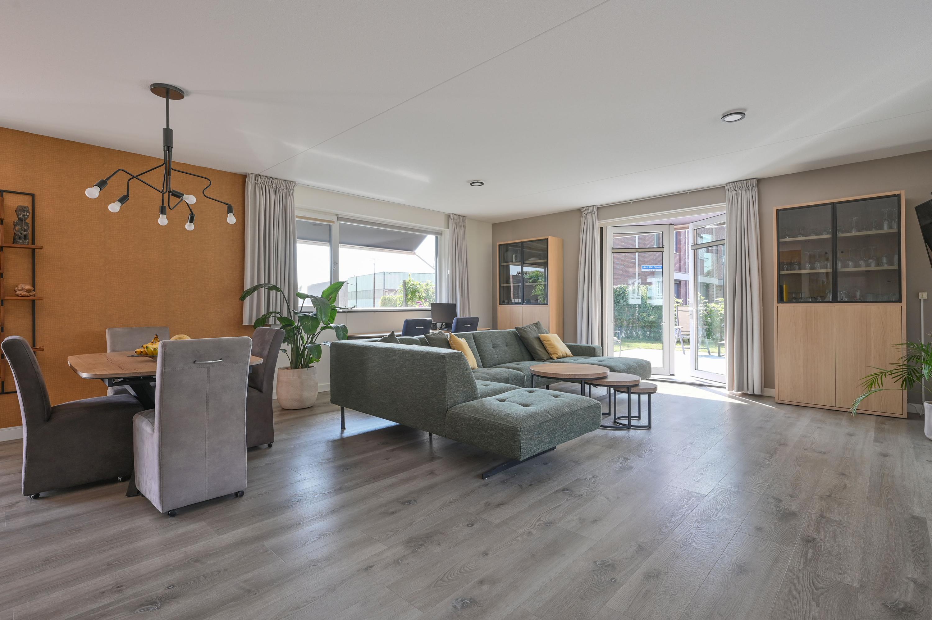 Aan het einde van de hal betreedt u via een paneeldeur met melkglas en extra zijraam de royale woonkamer met open keuken. Grote ramen rondom, voorzien van handmatig en elektrisch bedienbare zonneschermen, zorgen voor een prachtig lichtspel en een weids uitzicht. De moderne keuken in antracietgrijs heeft een stijlvol kunststof werkblad, een ruim eiland met lades en een gezellige zitbar. Hoogwaardige Siemens-inbouwapparatuur – waaronder vaatwasser, inductiekookplaat met geïntegreerde afzuiging, combi-stoomoven en koel-/vriescombinatie – maken koken hier een genot. De woonkamer is ruim opgezet en biedt de mogelijkheid om diverse zithoeken te creëren of af en toe de zithoek te veranderen van opzet. Via openslaande deuren in de keuken stapt u de achtertuin in, waar een elektrisch zonnescherm voor schaduw zorgt op zonnige dagen. De eetkamer sluit naadloos aan op de keuken, met daarachter de sfeervolle zithoek. Ook vanuit hier leiden openslaande deuren naar de zonnige zijtuin op het zuiden. De gehele begane grond is voorzien van een onderhoudsvriendelijke pvc-vloer in warme houtlook met comfortabele vloerverwarming. Alle ramen en buitendeuren zijn uitgerust met horren – een detail dat bijdraagt aan het wooncomfort.