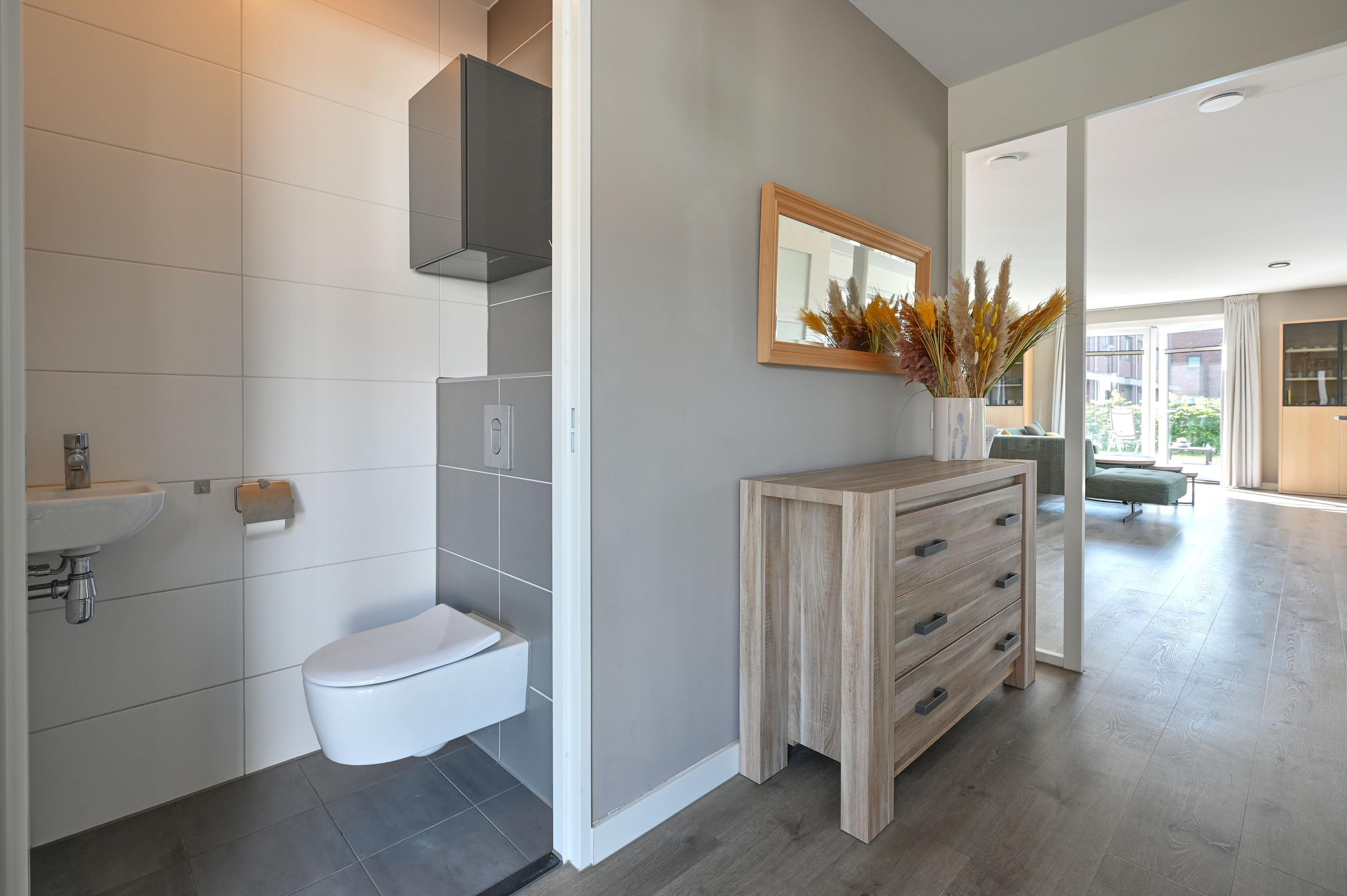 Via de royale oprit van antraciet grind, met plaats voor twee auto’s en een eigen laadpaal, bereikt u de stijlvolle entree van deze villa. Al bij binnenkomst in de ruime en representatieve hal valt het grote hoekraam naast de voordeur op waardoor het daglicht rijkelijk binnenstroomt. Vanuit de hal heeft u toegang tot diverse vertrekken én de vaste trapopgang naar de eerste verdieping. Links van de voordeur bevindt zich een veelzijdige ruimte die nu dienst doet als werkkamer, maar ook ideaal is als inpandige berging of hobbykamer. Deze ruimte heeft bovendien een eigen ingang vanaf de voorzijde. Naast gelegen vindt u de meterkast met glasvezelaansluiting, gevolgd door het modern afgewerkte toilet in grijs-wit tinten met fontein. Onder de trap is een praktische opbergkast en er is ruim plek voor een garderobe.