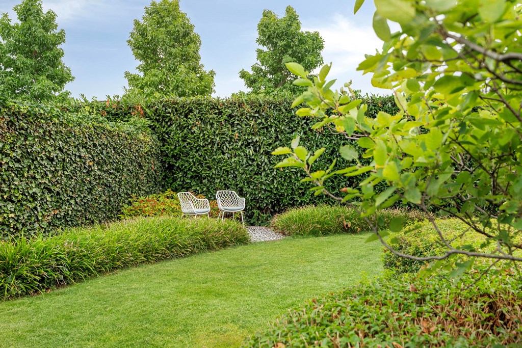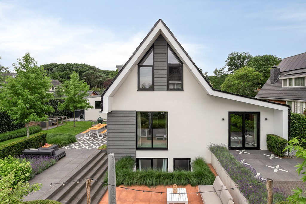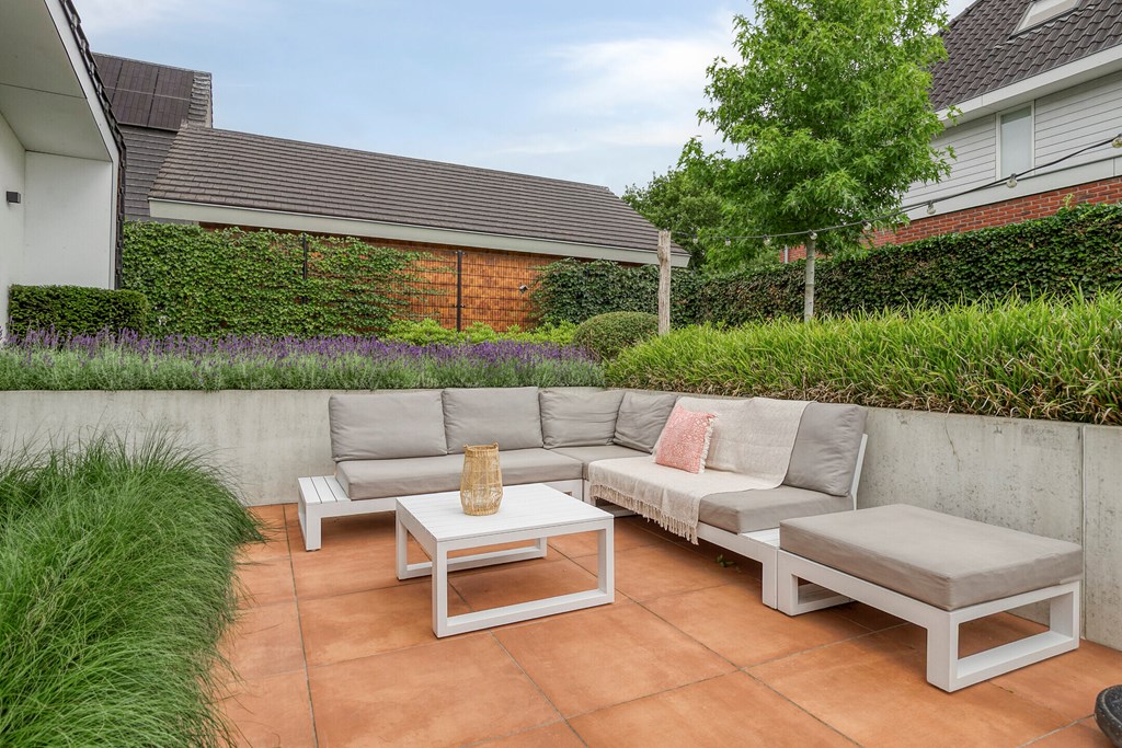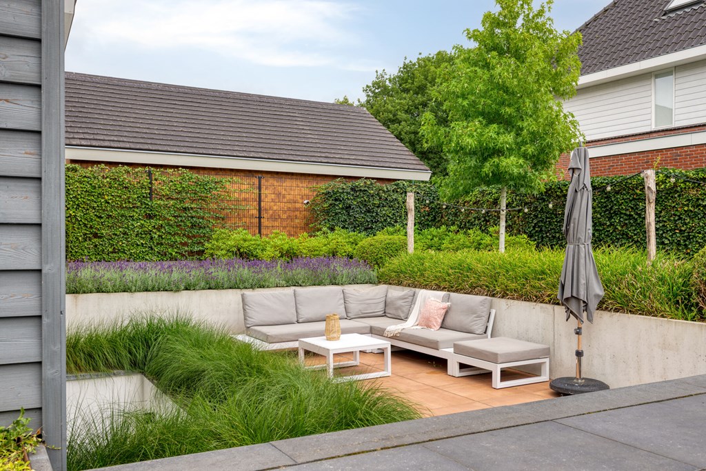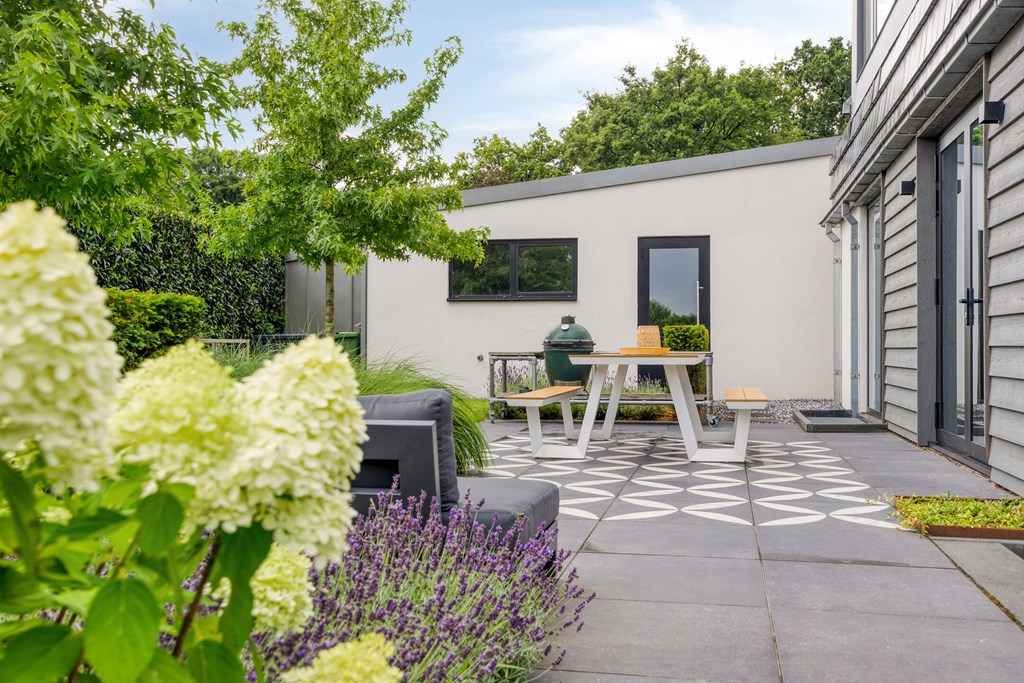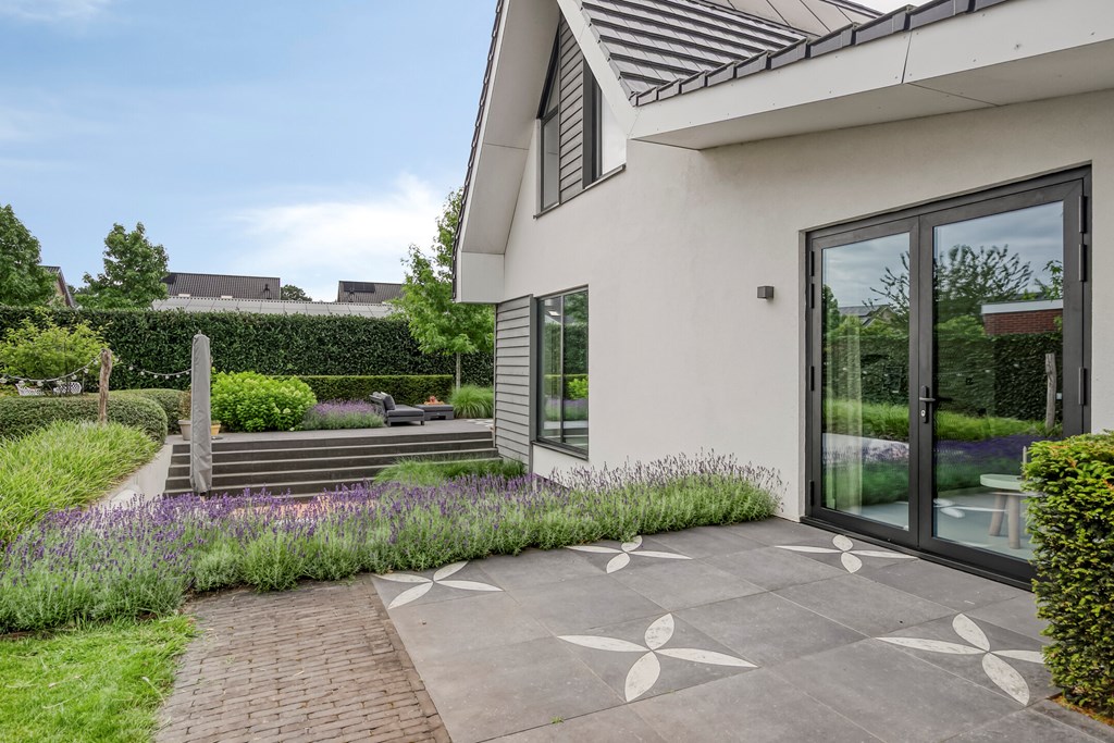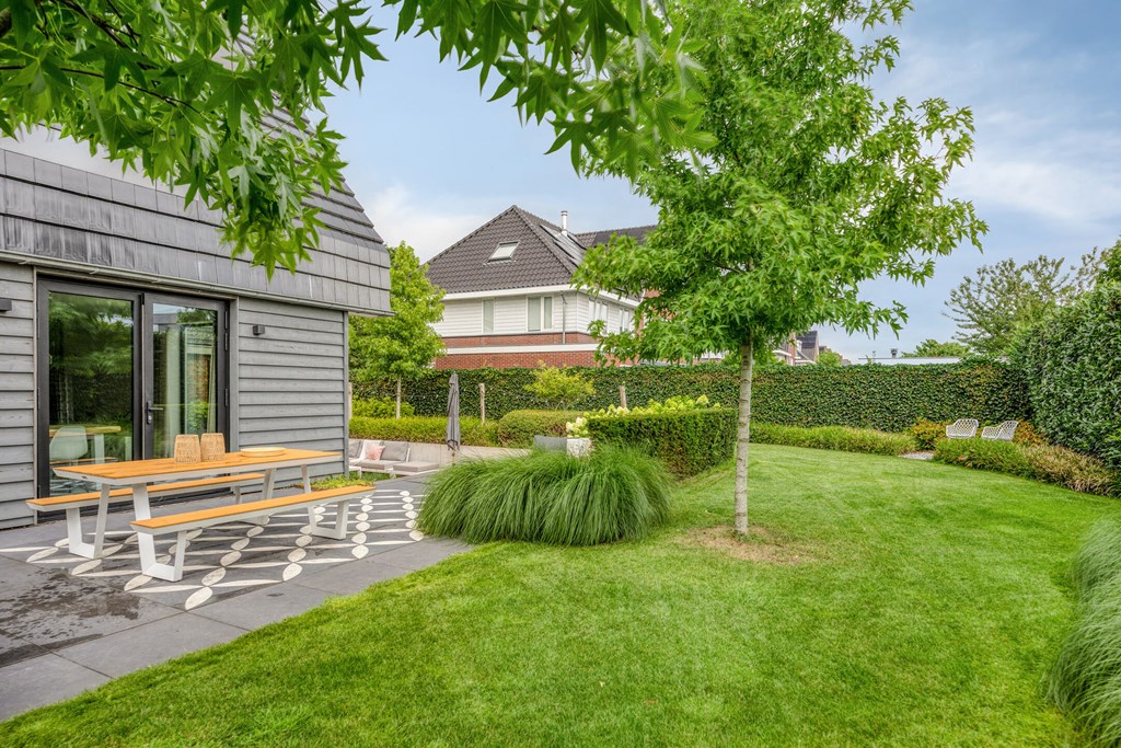 Rondom de woning ligt een fraai aangelegde L-vormige tuin, die maximale privacy en rust biedt. Vanuit de woonkamer en de eetkamer loopt u zo naar buiten, waar u op diverse terrassen geniet van de zon. Een sfeervolle zitkuil en de slimme indeling zorgen ervoor dat u op elk moment van de dag een perfecte plek vindt om te ontspannen. De tuin is met zorg onderhouden en vormt een waar verlengstuk van het woonplezier dat deze woning biedt.