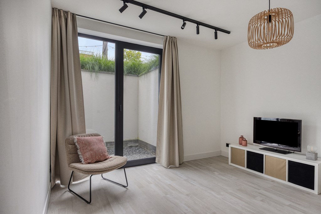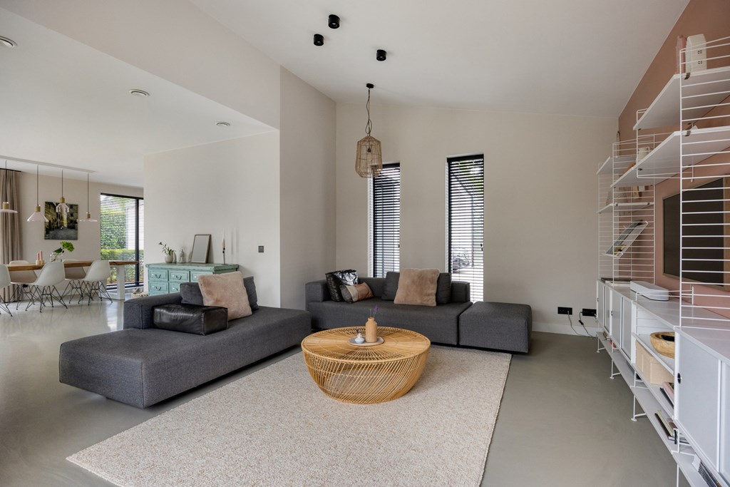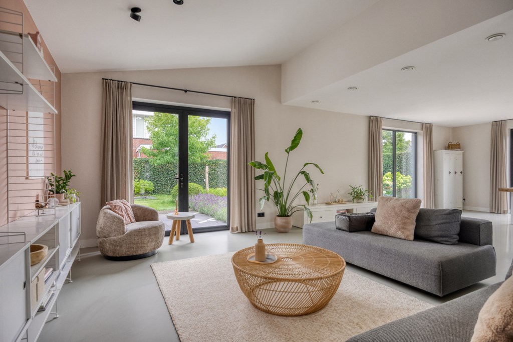 Een aangename verrassing is de royale woonkamer, die dankzij grote raampartijen baadt in natuurlijk daglicht. De open indeling geeft u alle vrijheid om een comfortabele zithoek én een uitnodigende ontvangstplek te creëren. Openslaande deuren verbinden binnen moeiteloos met buiten, waardoor de tuin als vanzelf een verlengstuk van uw leefruimte wordt.