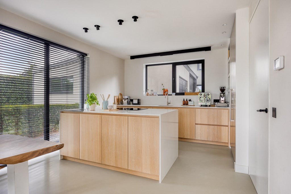 Deze moderne leefkeuken vormt het kloppend hart van de woning. Dankzij het lange aanrechtblad en het kookeiland is koken hier een waar genoegen. De keuken is volledig uitgerust met een inductiekookplaat inclusief geïntegreerde afzuiging, een oven, een vaatwasmachine, een ruime koelkast, een aparte vriezer en een spoelbak. De hoogwaardige afwerking, gecombineerd met praktische opbergruimte in lades en kastjes, geeft de keuken een luxe uitstraling.