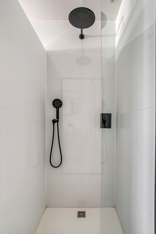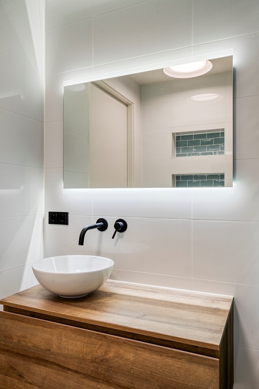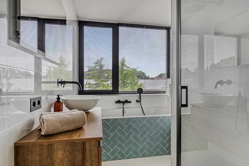 Aan de overloop grenst de modern afgewerkte badkamer. Deze is volledig betegeld en voorzien van een ligbad een ruime inloopdouche met glazen deur, een zwevend toilet en een stijlvol wastafelmeubel. De strakke afwerking draagt bij aan een luxe en verzorgde uitstraling.