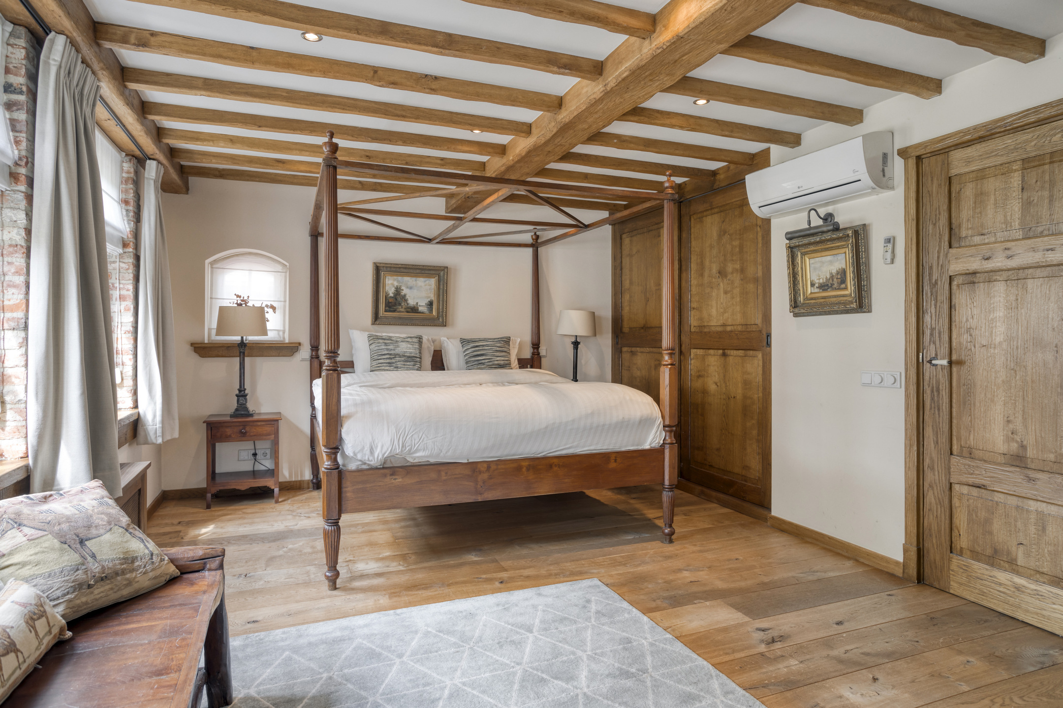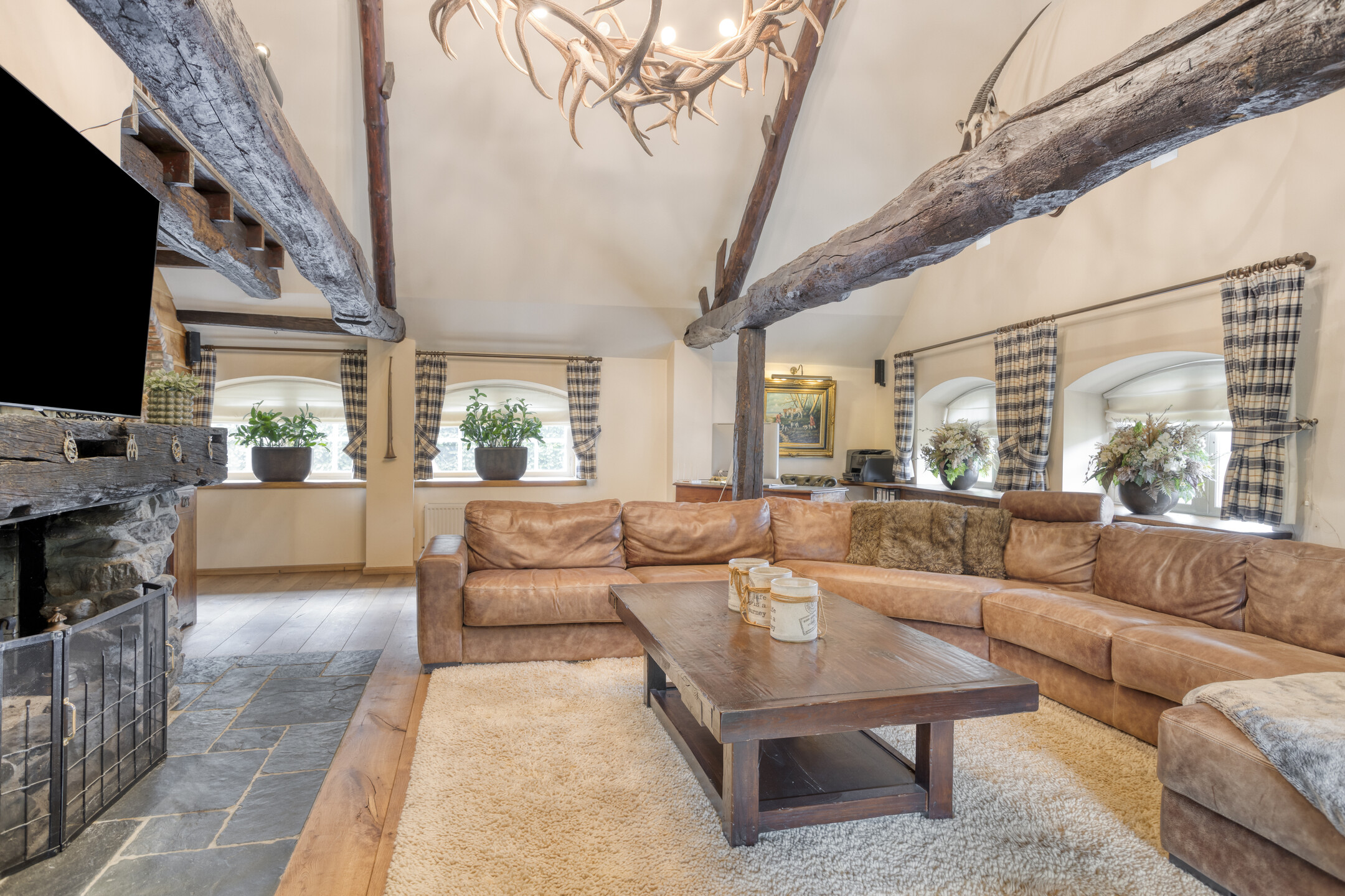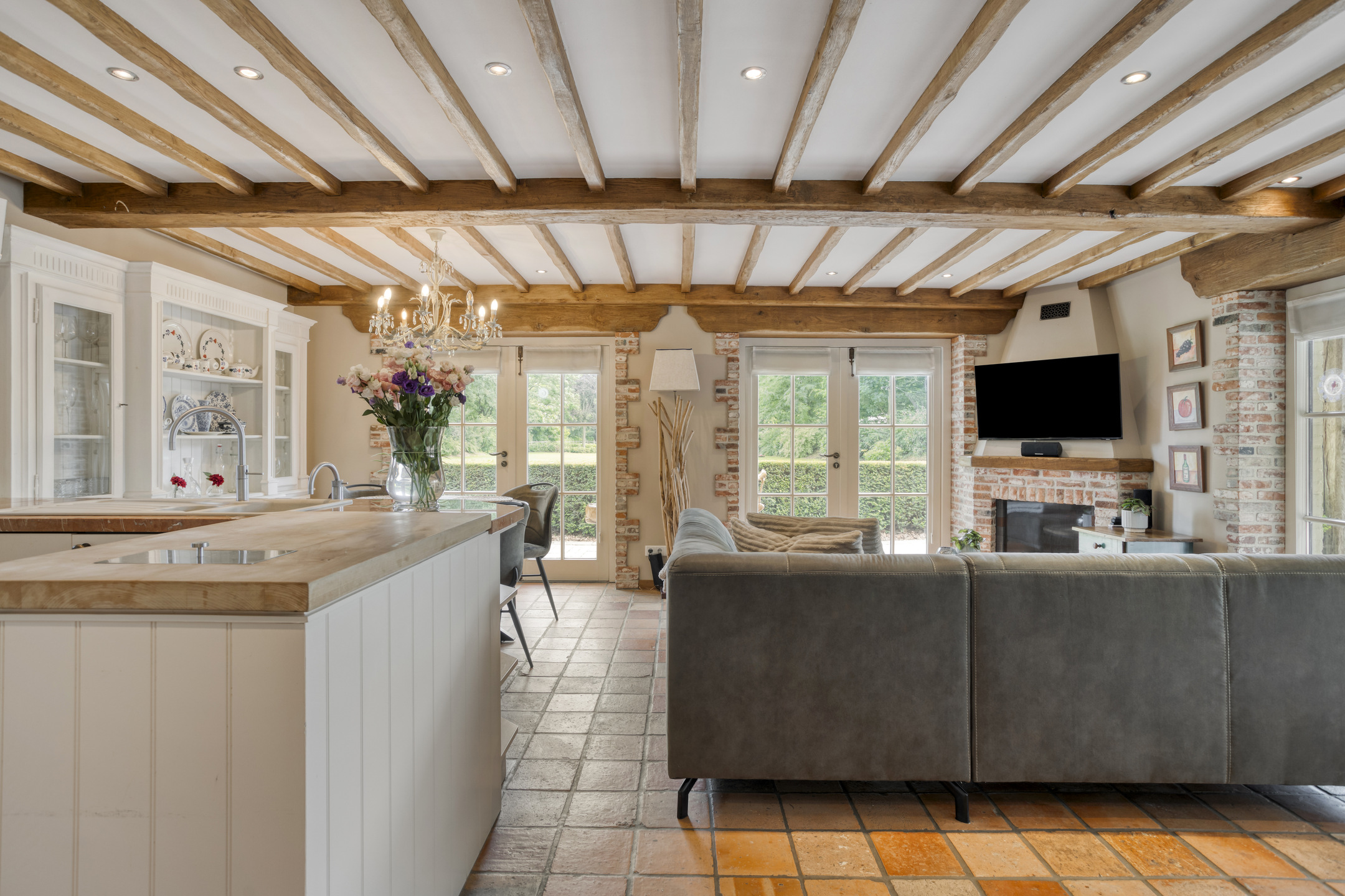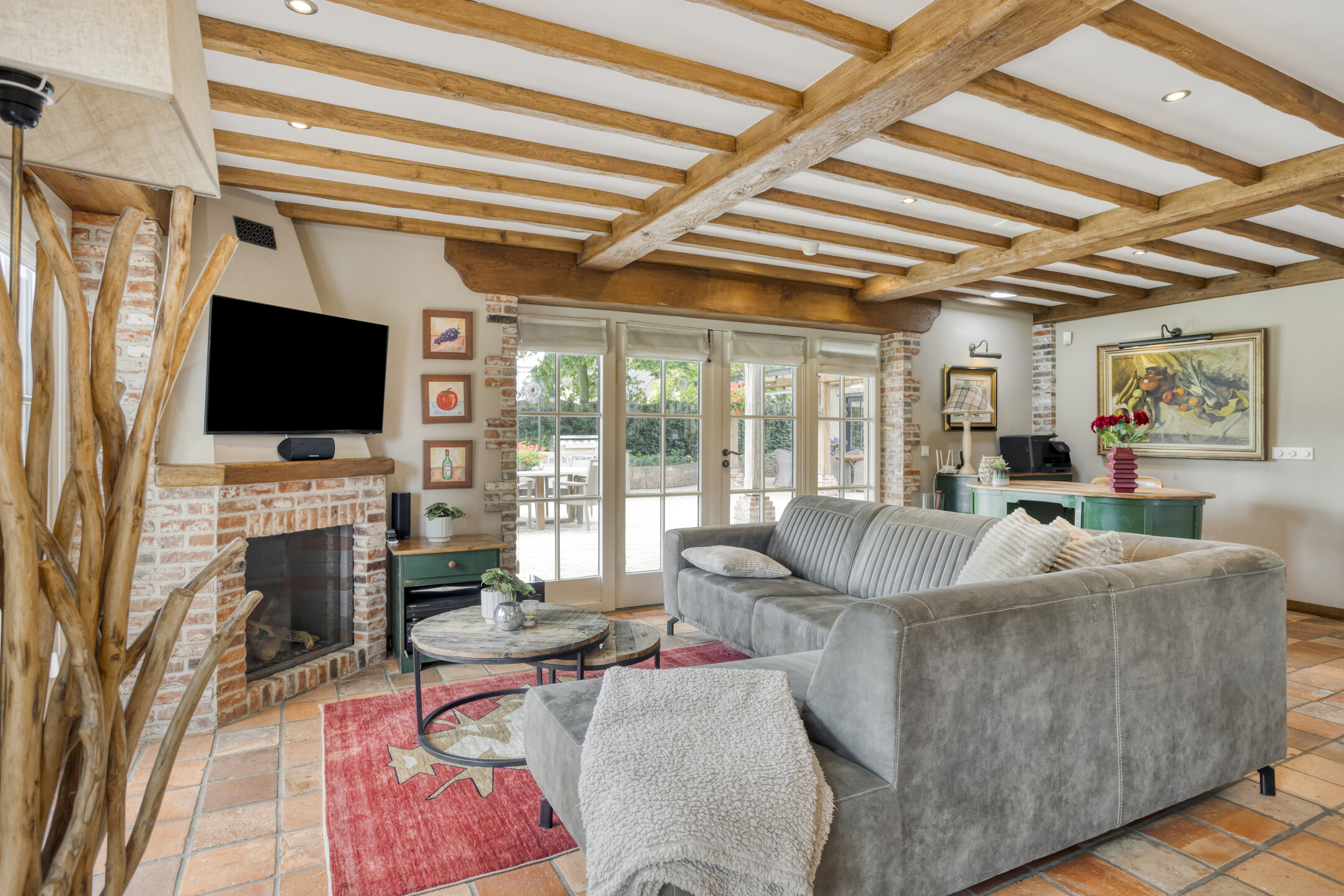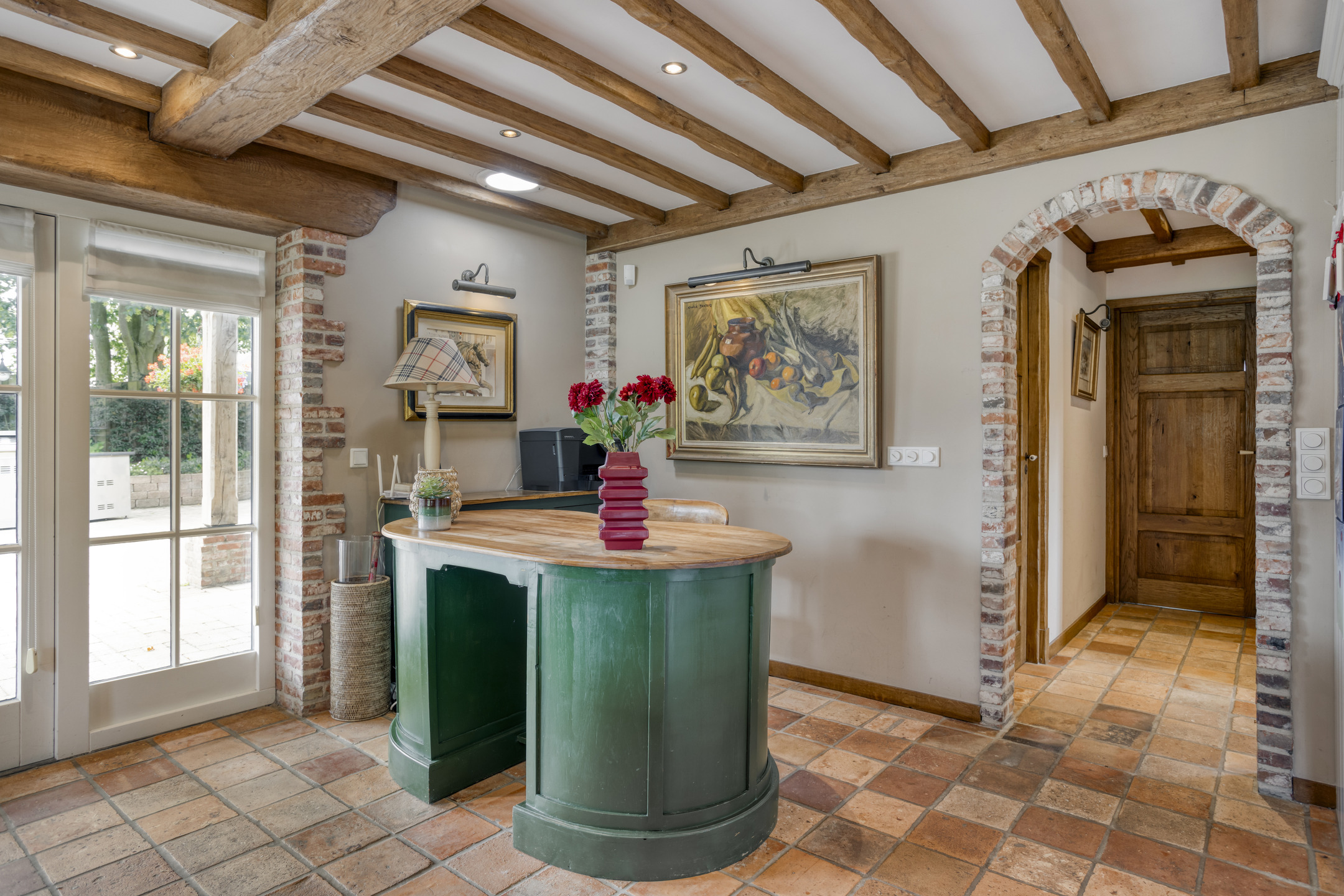 - De woonboerderij en bijgebouw beschikken over hoge plafonds met prachtige balkenconstructie en karakteristieke