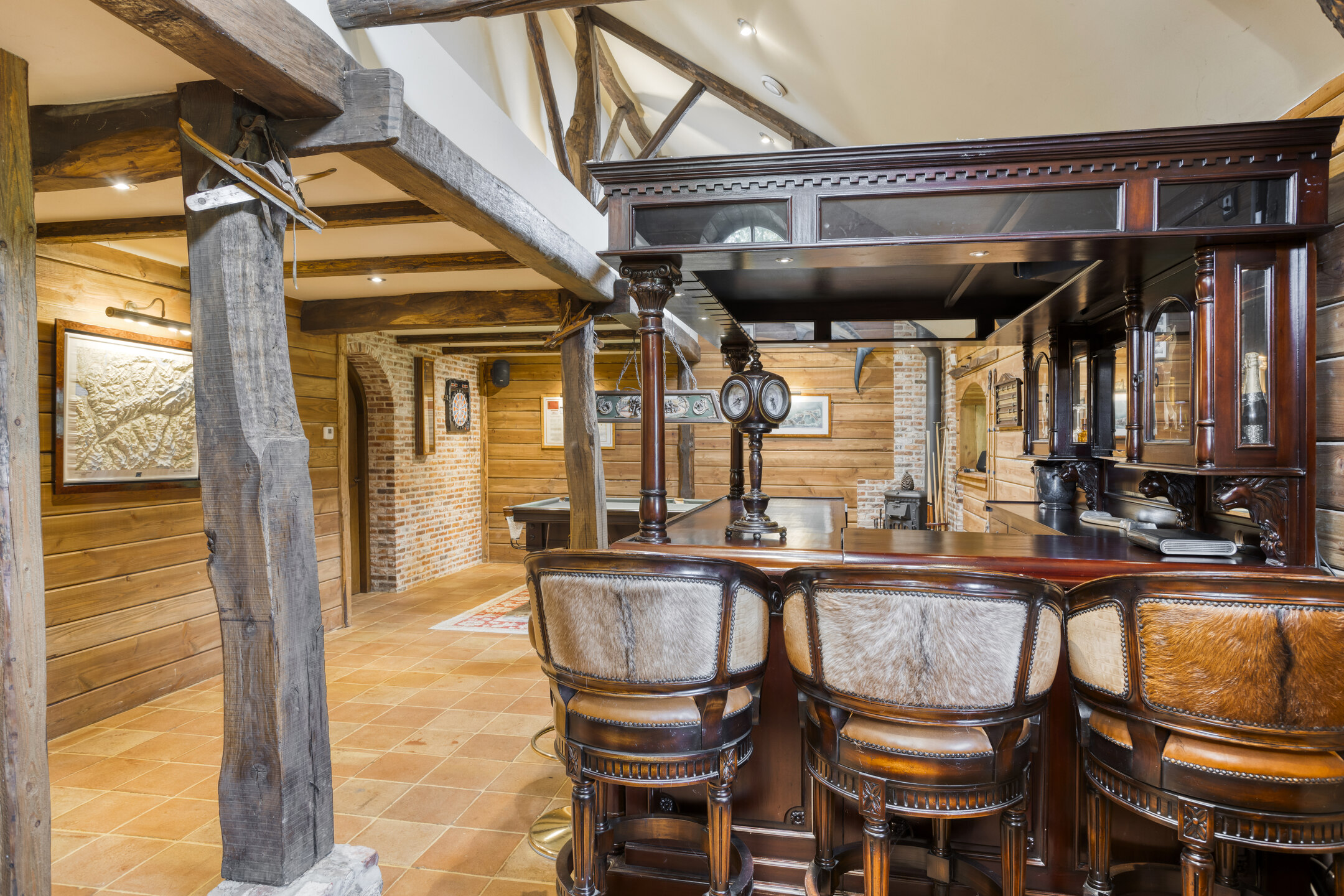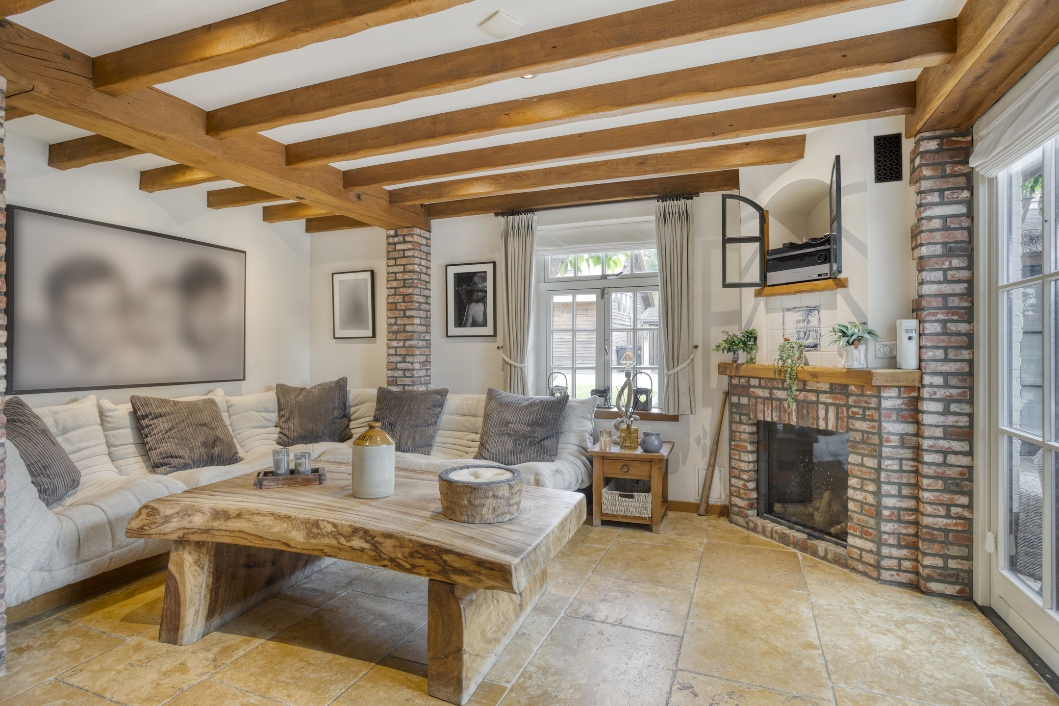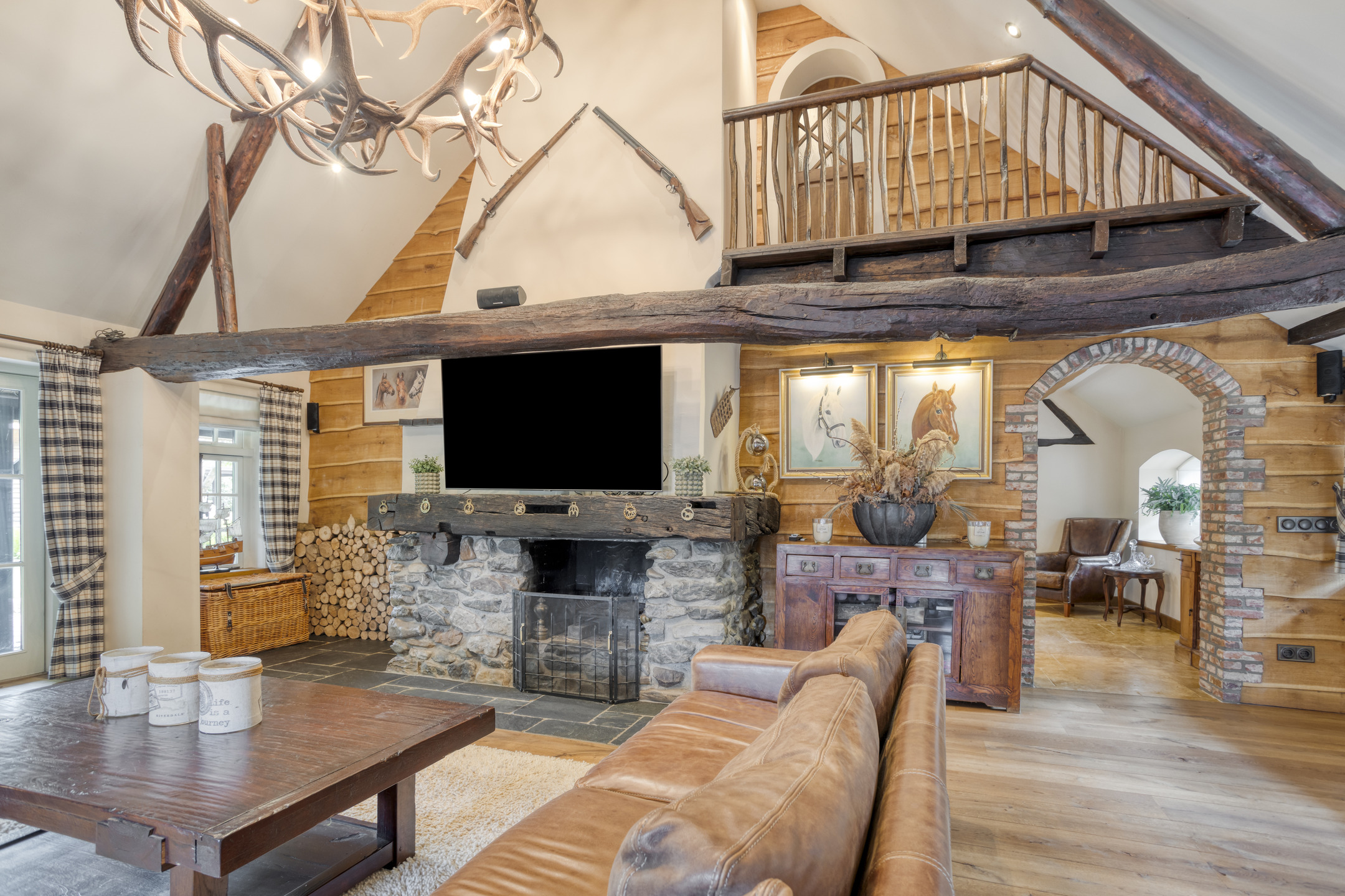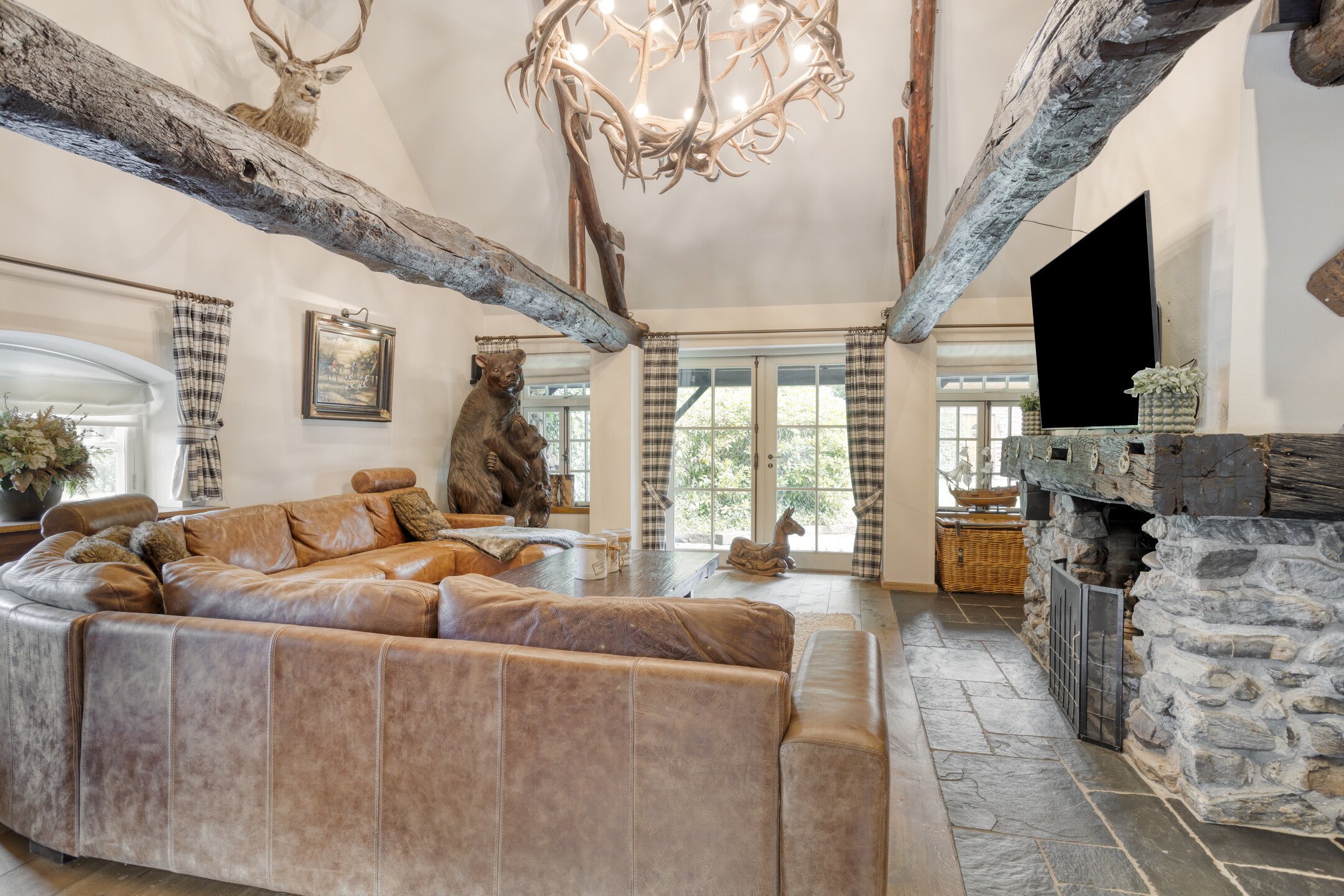 - De woonboerderij en bijgebouw beschikken over hoge plafonds met prachtige balkenconstructie en karakteristieke