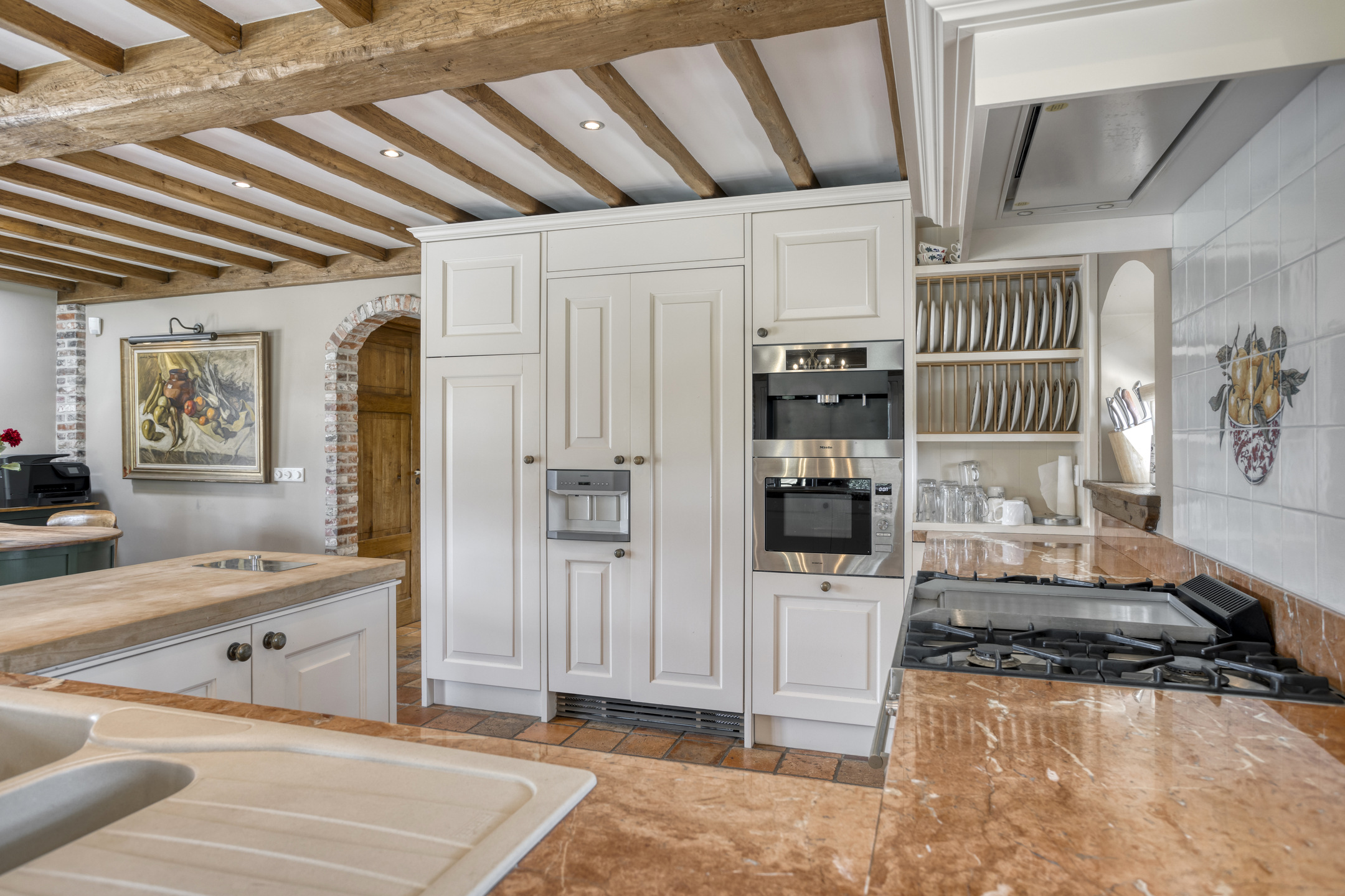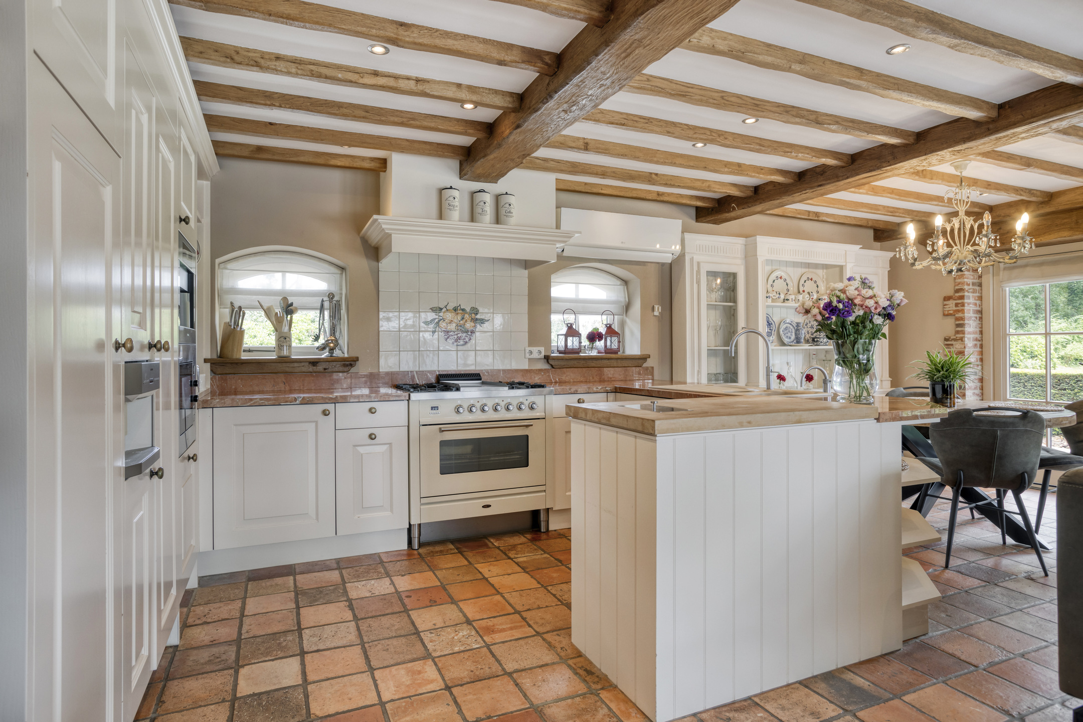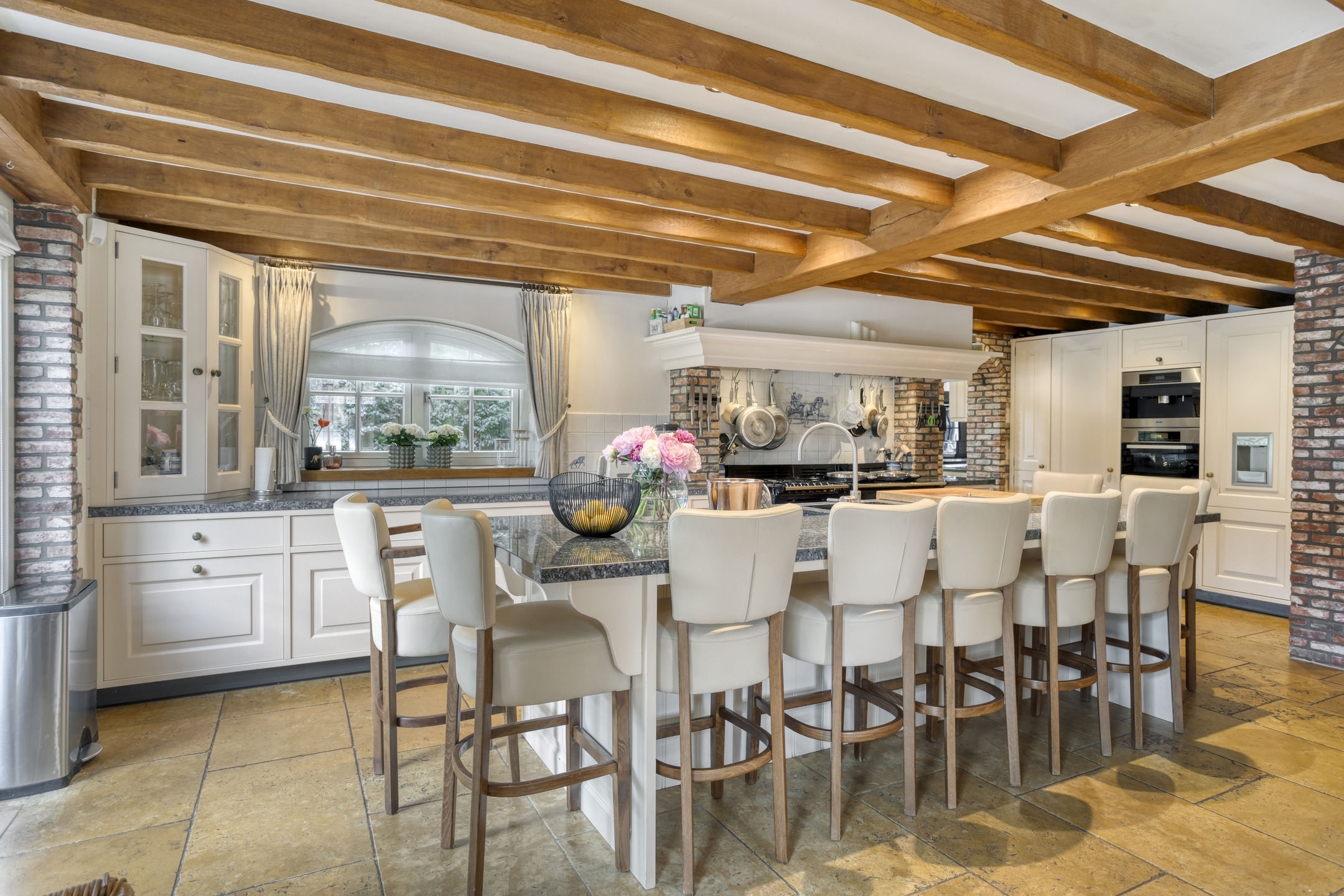 Royale entree met marmeren vloer, toiletruimte, meterkast en fraaie hardhouten trapopgang naar de eerste verdieping. De hal biedt toegang tot de eetkamer en tot een gang die leidt naar de woonkeuken, slaapkamers en badkamer. Toiletruimte met marmeren vloer- en wandbetegeling, vrij hangend closet en fonteintje. Royale, sfeervolle eetkamer met marmeren vloer, balkenplafond en volop ruimte voor een grote eettafel. Vanuit de eetkamer is er toegang tot de woonkamer. Ruime, stijlvolle woonkamer met houten vloer, grote openhaardpartij (hout), een zeer hoog plafond met een unieke balkenconstructie en een prachtige vide die toegang biedt tot een van de slaapkamers. De grote en sfeervolle woonkeuken is voorzien van een marmeren vloer, balkenplafond met inbouwspots en twee dubbele openslaande deuren naar het overdekte terras. De woonkeuken beschikt aan de tuinzijde over een ruime en gezellige zithoek met open haardpartij (gas). De keuken bestaat uit een wandopstelling met een aanrechtblad met kookgedeelte, een grote kastenwand en een spoeleiland met bargedeelte. De keukeninrichting bestaat uit een marmeren aanrechtblad met diverse kasten en lades, een groot AGA fornuis met diverse soorten ovens, een gasfornuis, twee kookplaten en een afzuigkap. De ‘kastenwand’ bestaat uit een grote koelkast, vriezer met ijsblokjesfunctie, koffiemachine, combi-oven/magnetron, stoomoven en diverse kasten. Het spoeleiland, voorzien van een marmeren blad met dubbele spoelbak en een bar met maar liefst negen zitplaatsen, vormt de centrale plek in de woonkeuken. Het eiland beschikt verder over een vaatwasmachine en diverse kasten.