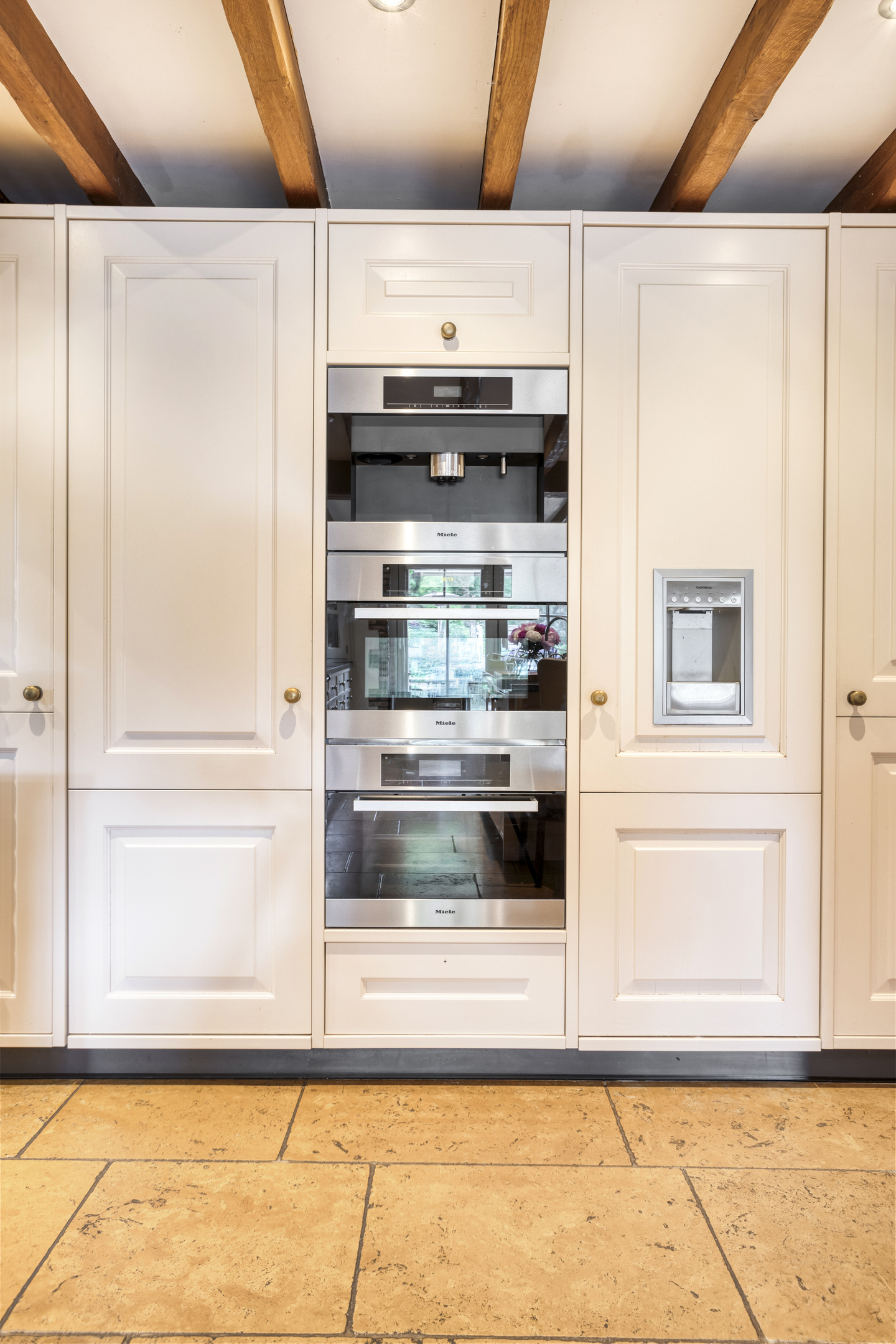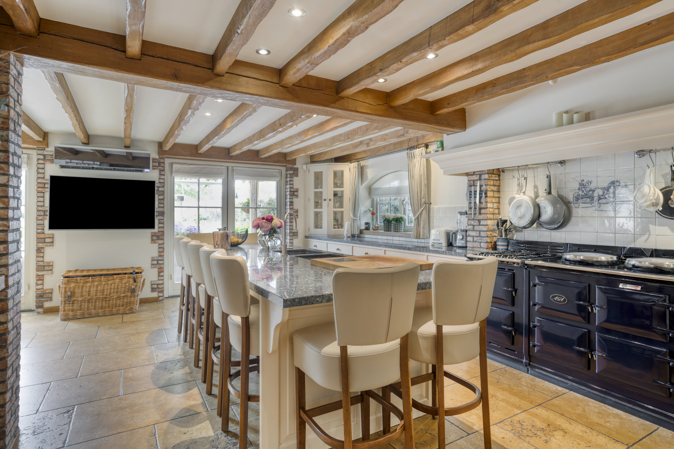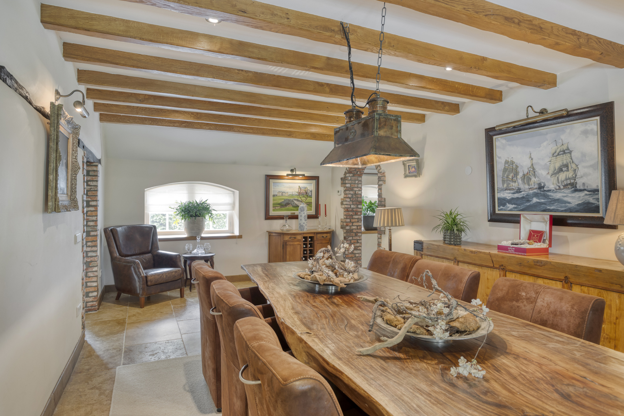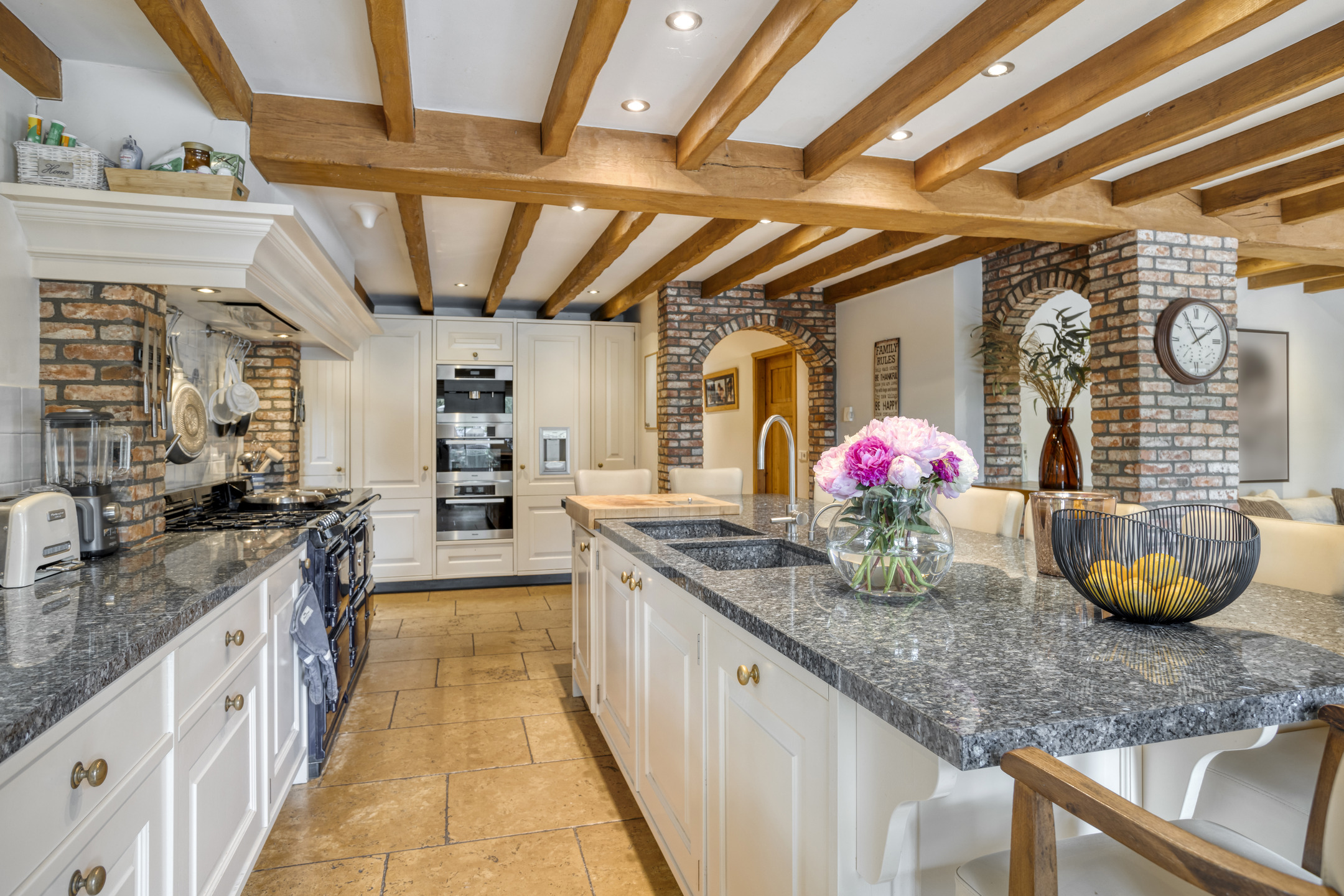 Royale entree met marmeren vloer, toiletruimte, meterkast en fraaie hardhouten trapopgang naar de eerste verdieping. De hal biedt toegang tot de eetkamer en tot een gang die leidt naar de woonkeuken, slaapkamers en badkamer. Toiletruimte met marmeren vloer- en wandbetegeling, vrij hangend closet en fonteintje. Royale, sfeervolle eetkamer met marmeren vloer, balkenplafond en volop ruimte voor een grote eettafel. Vanuit de eetkamer is er toegang tot de woonkamer. Ruime, stijlvolle woonkamer met houten vloer, grote openhaardpartij (hout), een zeer hoog plafond met een unieke balkenconstructie en een prachtige vide die toegang biedt tot een van de slaapkamers. De grote en sfeervolle woonkeuken is voorzien van een marmeren vloer, balkenplafond met inbouwspots en twee dubbele openslaande deuren naar het overdekte terras. De woonkeuken beschikt aan de tuinzijde over een ruime en gezellige zithoek met open haardpartij (gas). De keuken bestaat uit een wandopstelling met een aanrechtblad met kookgedeelte, een grote kastenwand en een spoeleiland met bargedeelte. De keukeninrichting bestaat uit een marmeren aanrechtblad met diverse kasten en lades, een groot AGA fornuis met diverse soorten ovens, een gasfornuis, twee kookplaten en een afzuigkap. De ‘kastenwand’ bestaat uit een grote koelkast, vriezer met ijsblokjesfunctie, koffiemachine, combi-oven/magnetron, stoomoven en diverse kasten. Het spoeleiland, voorzien van een marmeren blad met dubbele spoelbak en een bar met maar liefst negen zitplaatsen, vormt de centrale plek in de woonkeuken. Het eiland beschikt verder over een vaatwasmachine en diverse kasten.