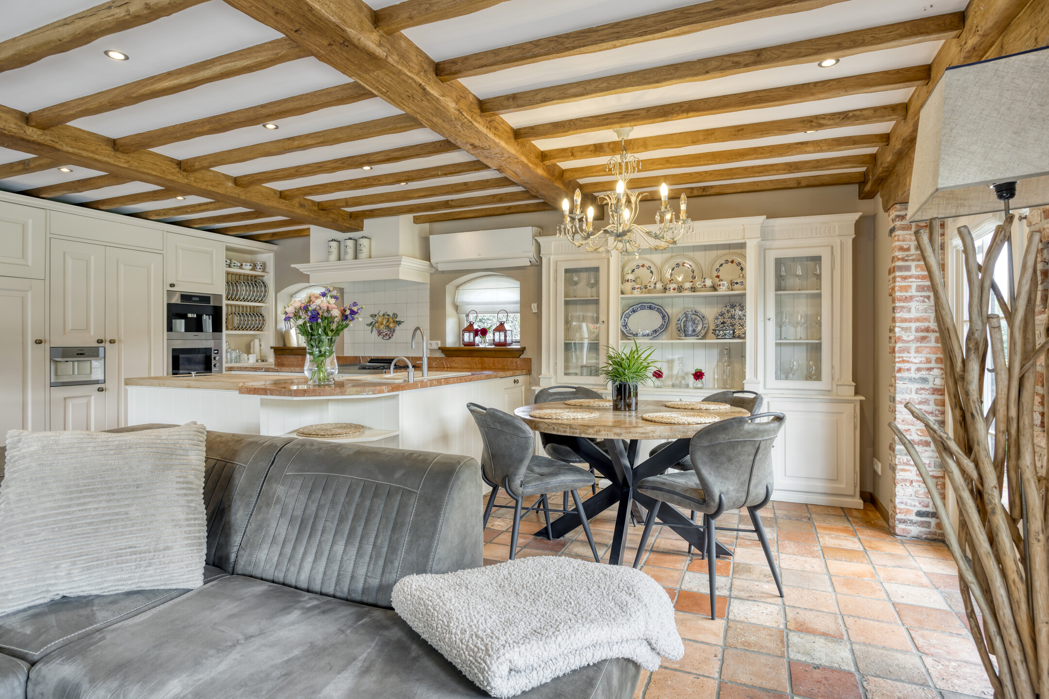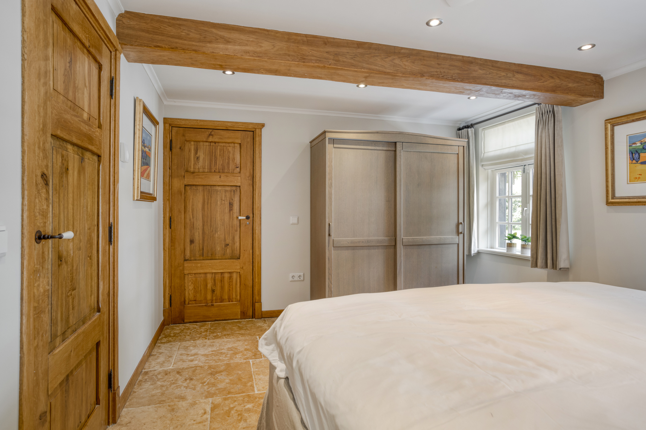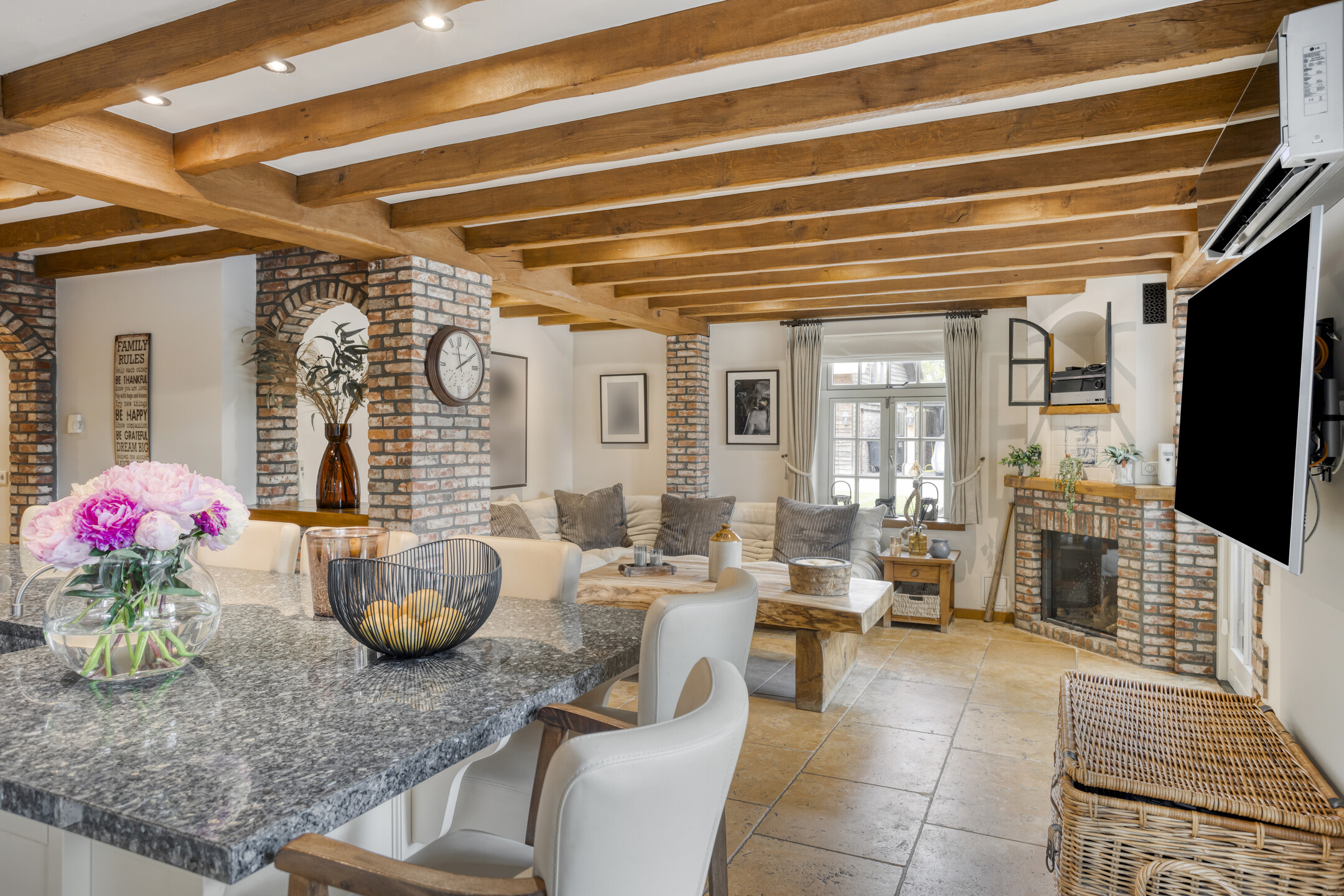 Toiletruimte met marmeren vloer- en wandbetegeling, vrij hangend closet en fonteintje. Royale, sfeervolle woon-/eetkamer met natuurstenen vloerbetegeling, karakteristiek balkenplafond met inbouwspots, open keuken, open haardpartij (gas) en drie dubbele openslaande deuren naar de terrassen. De grote open keuken heeft een U-vormige keukeninrichting. De keukeninrichting is voorzien van een marmeren aanrechtblad met anderhalve gootsteen, vaatwasmachine, koelkast, vriezer met ijsblokjesfunctie, koffiemachine, combi-oven/magnetron, gasfornuis (Boretti) met grillplaat en afzuigkap, servieskast en diverse andere kasten en lades. De royale slaapkamer 1 is voorzien van een houten vloer, karakteristiek balkenplafond met inbouwspots, grote ingebouwde kast, deur naar badkamer 1 en dubbele openslaande deuren naar het terras.