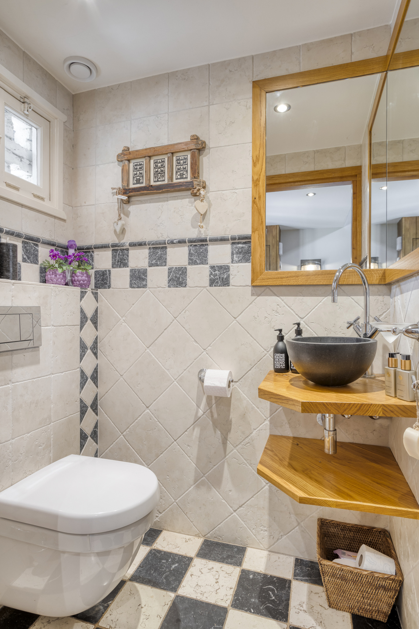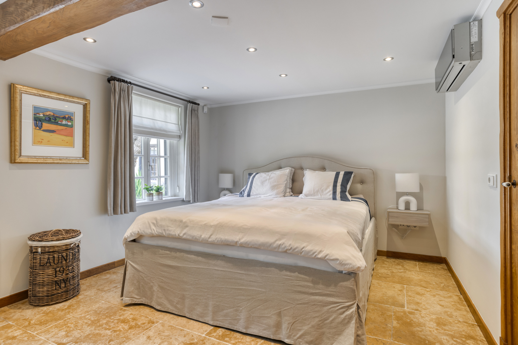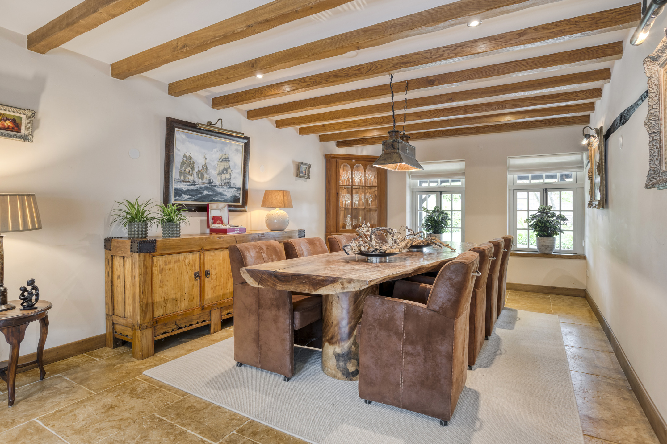 Toiletruimte met marmeren vloer- en wandbetegeling, vrij hangend closet en fonteintje. Royale, sfeervolle woon-/eetkamer met natuurstenen vloerbetegeling, karakteristiek balkenplafond met inbouwspots, open keuken, open haardpartij (gas) en drie dubbele openslaande deuren naar de terrassen. De grote open keuken heeft een U-vormige keukeninrichting. De keukeninrichting is voorzien van een marmeren aanrechtblad met anderhalve gootsteen, vaatwasmachine, koelkast, vriezer met ijsblokjesfunctie, koffiemachine, combi-oven/magnetron, gasfornuis (Boretti) met grillplaat en afzuigkap, servieskast en diverse andere kasten en lades. De royale slaapkamer 1 is voorzien van een houten vloer, karakteristiek balkenplafond met inbouwspots, grote ingebouwde kast, deur naar badkamer 1 en dubbele openslaande deuren naar het terras.