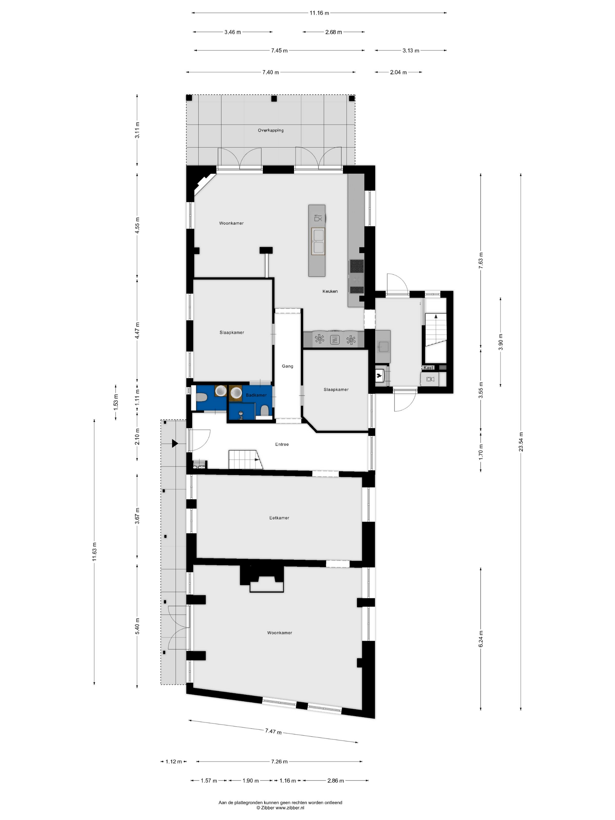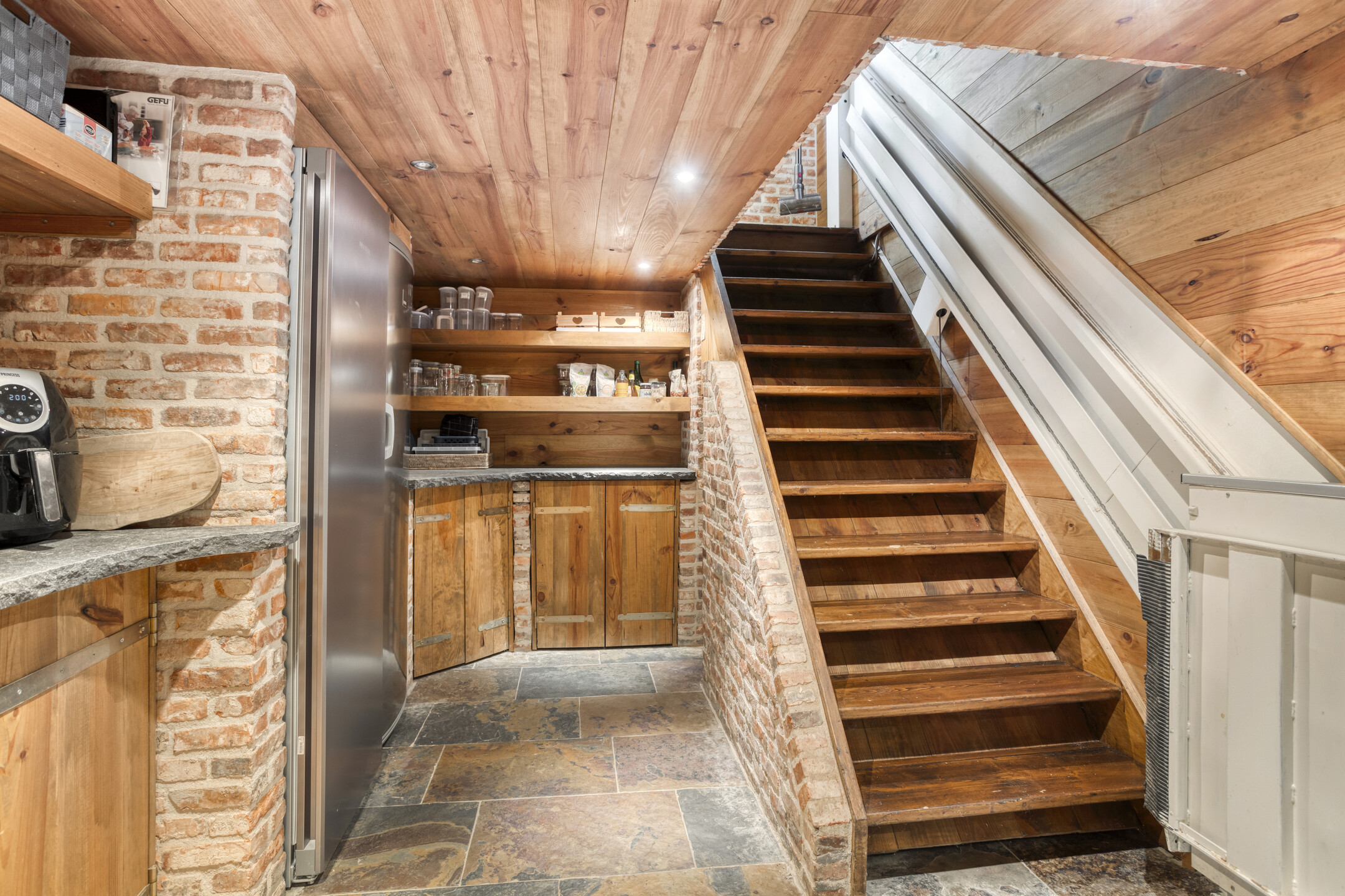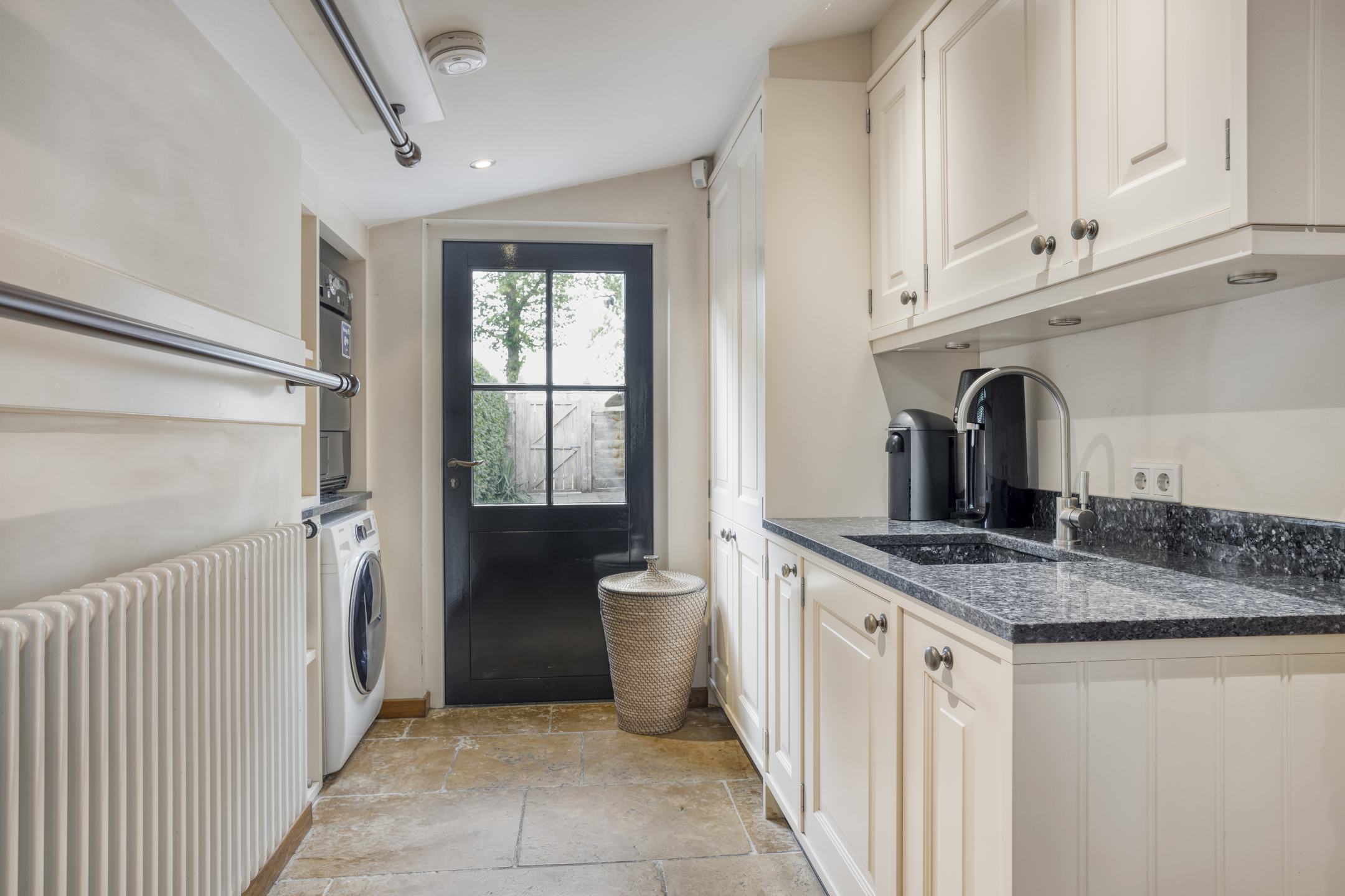 Royale bijkeuken met marmeren vloer, aanrechtblad met spoelbak en diverse kasten, meterkast, aansluitingen voor de wasapparatuur, deur naar de tuin en een trap naar de grote manshoge kelder. De kelder is verdeeld in een grote wijnkelder en een ruimte met een hardstenen blad met daaronder volop kastruimte. Vanuit de hal leidt een gang naar de twee slaapkamers en de badkamer. Slaapkamer 1 is ruim en voorzien van een marmeren vloer, inbouwspots en biedt direct toegang tot de badkamer. Slaapkamer 2 is voorzien van een marmeren vloer en inbouwspots. De sfeervolle badkamer 1 is voorzien van een marmeren vloer, wandbetegeling, inbouwspots, vrij hangend toilet, inloopdouche, designradiator en wastafel in meubel.