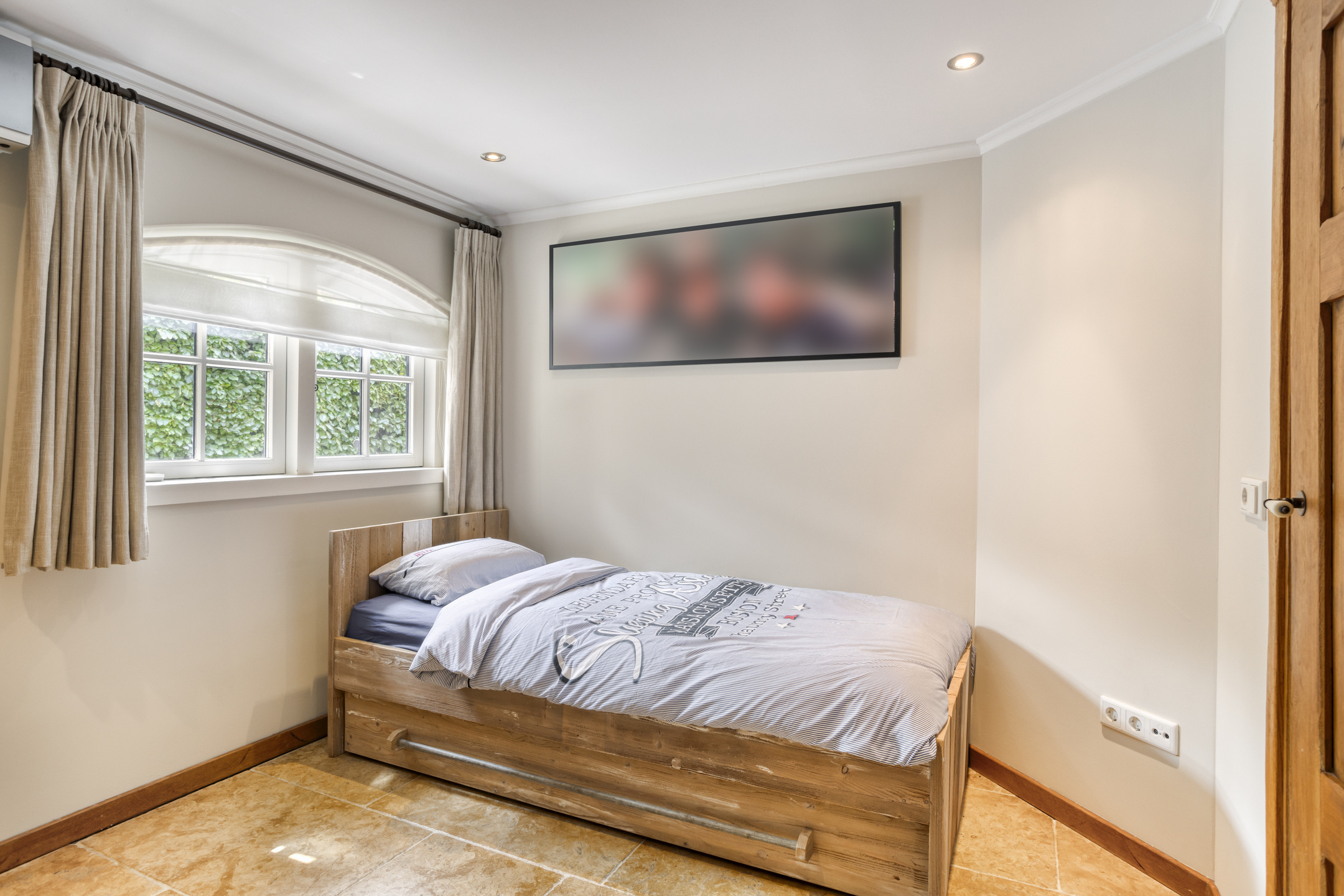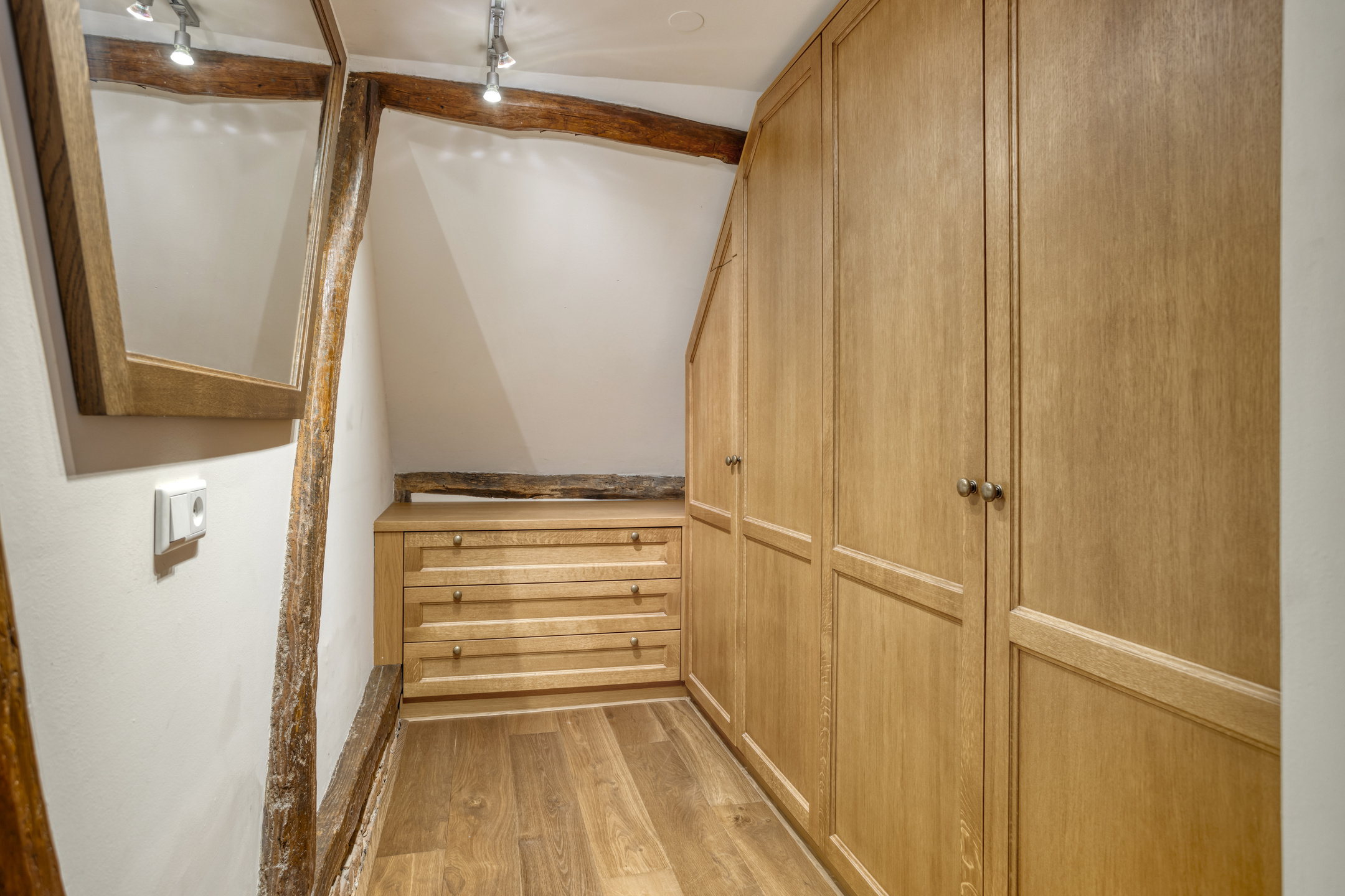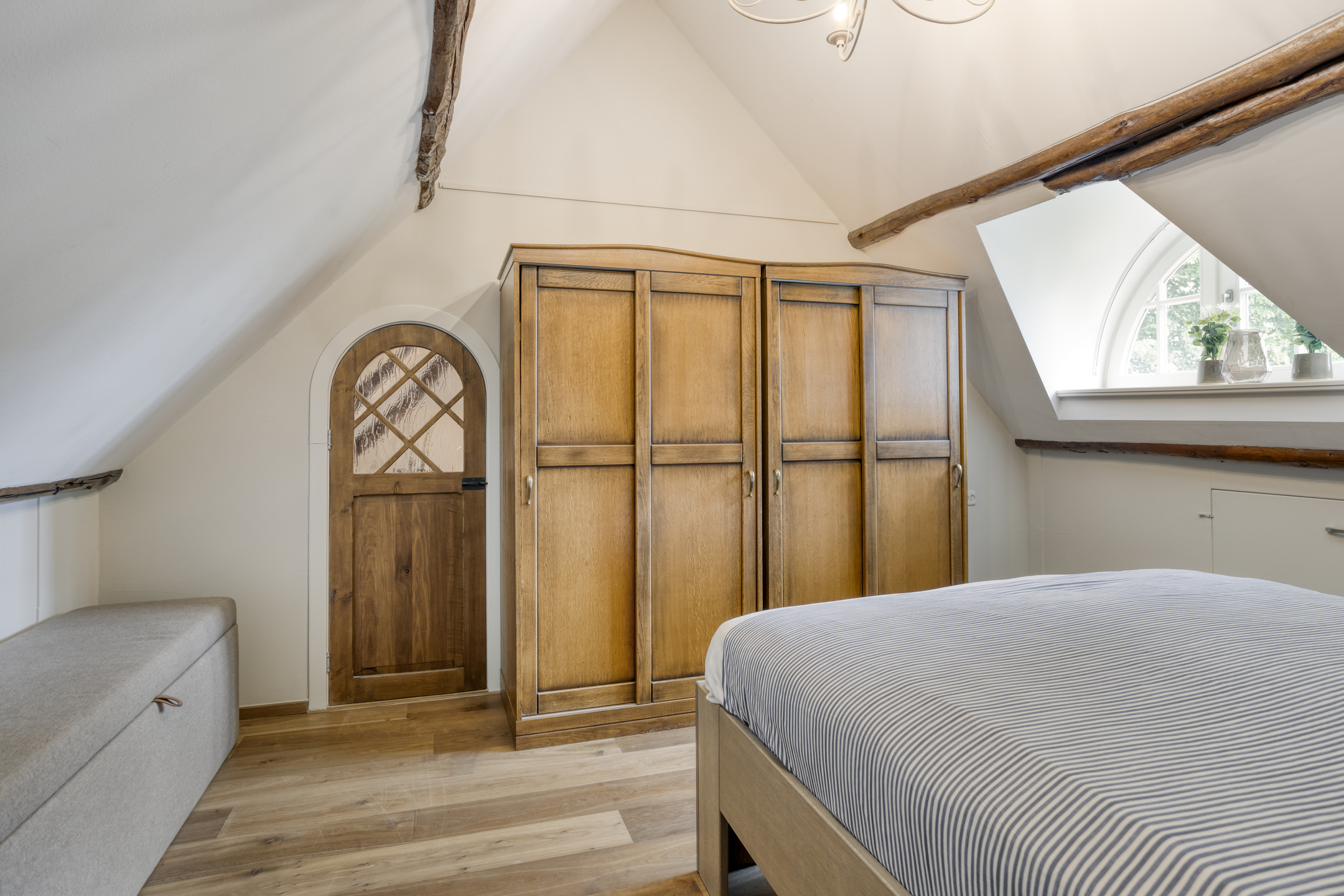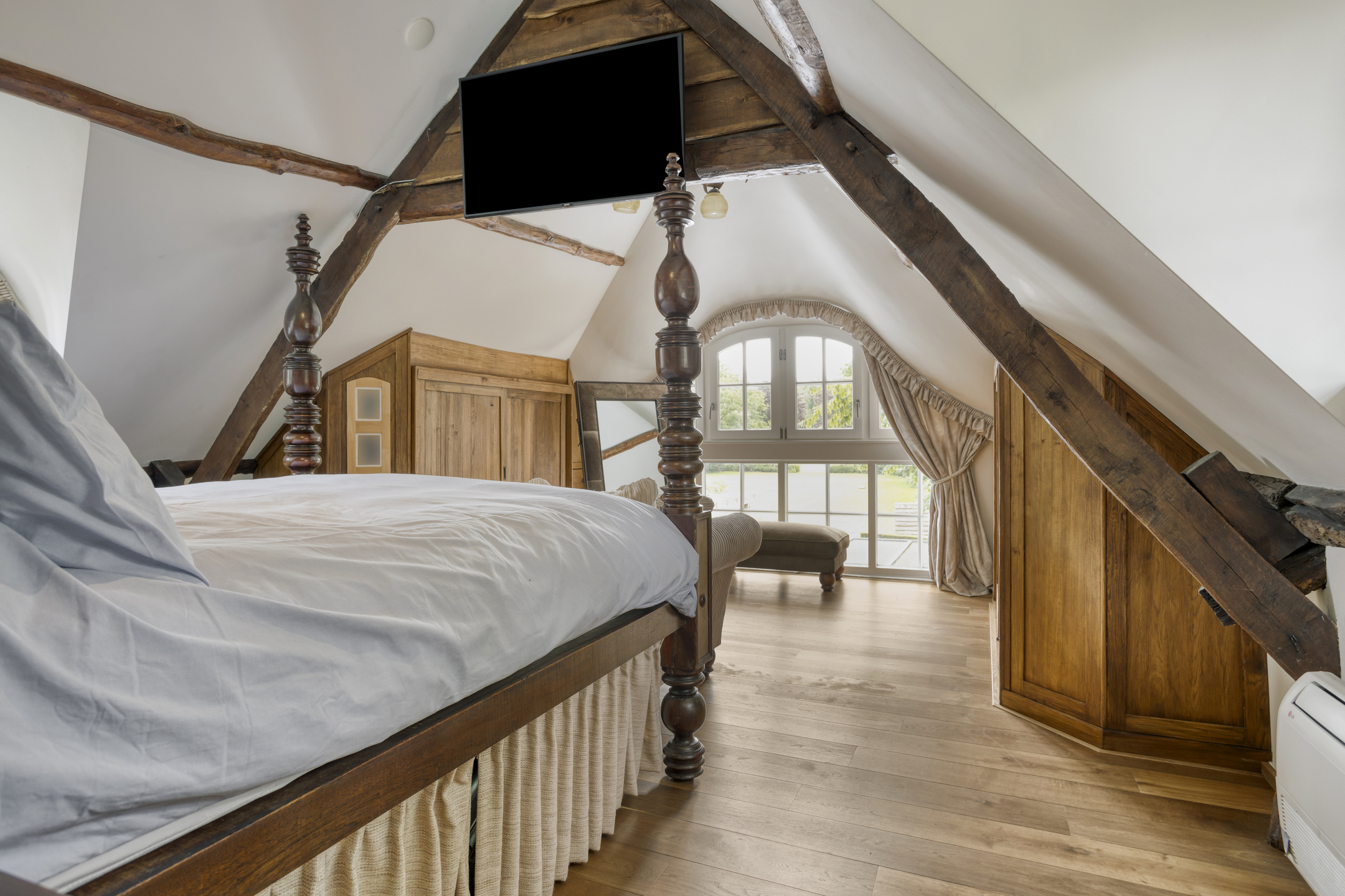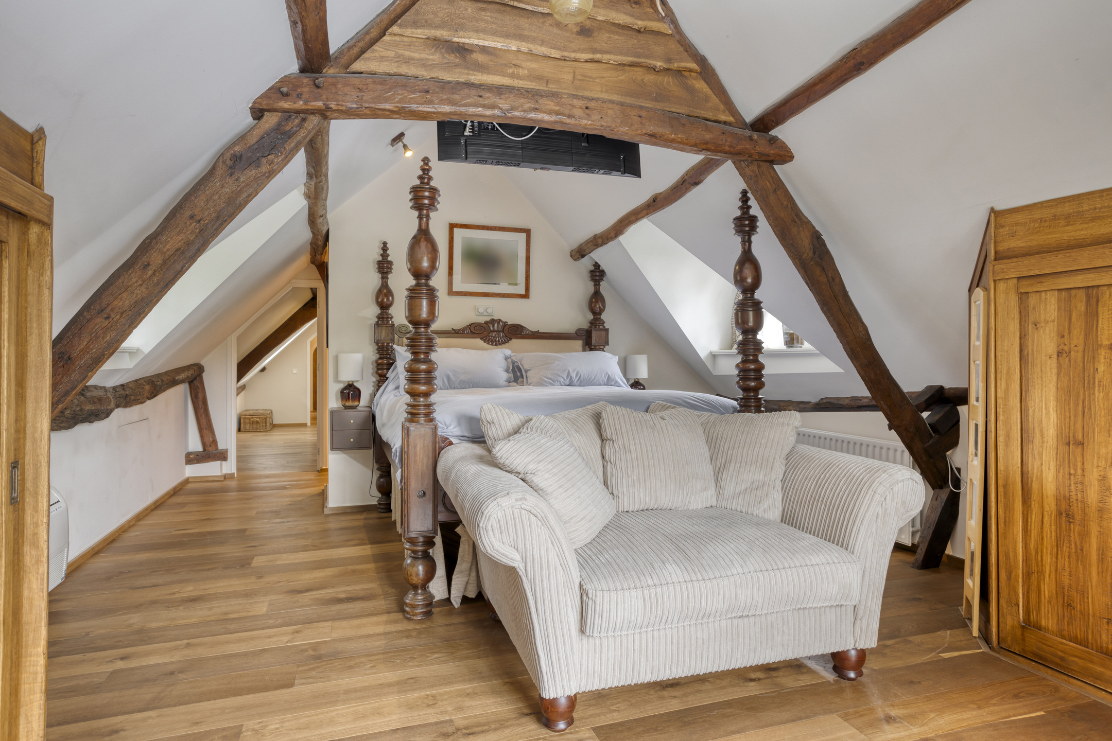 De zeer ruime slaapkamer 4 is voorzien van een houten vloer, een plafond met een zeer bijzondere balkenconstructie, twee dakkapellen en een grote walk in closet. Een grote karakteristieke raampartij biedt een prachtig uitzicht over de parkachtige tuin. Badkamer 2 is voorzien van marmeren vloer- en wandbetegeling, een dakkapel, sierradiator, wandcloset, ligbad, douche en dubbele wastafel in meubel.