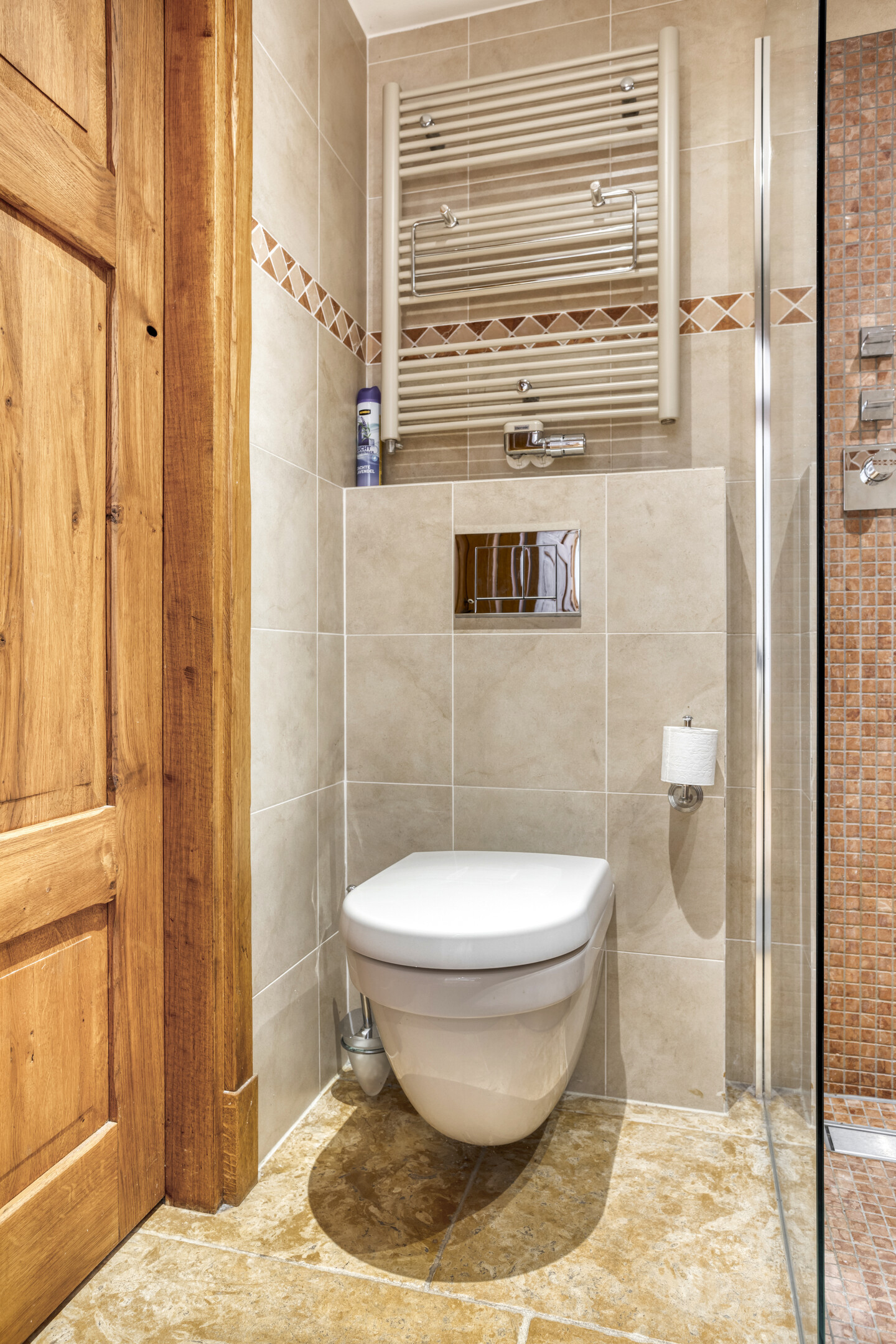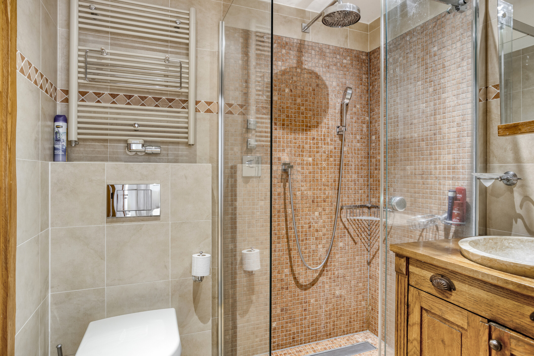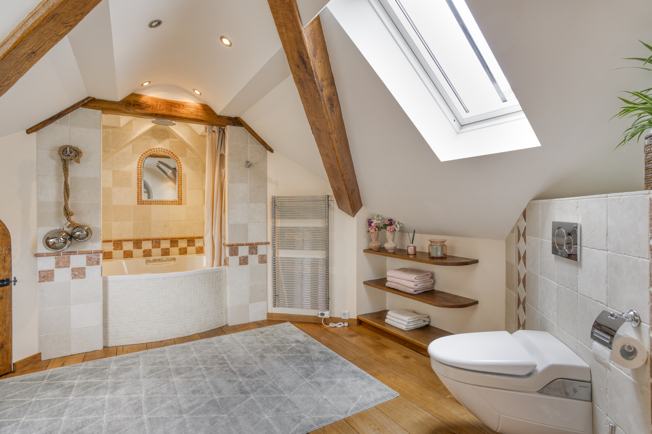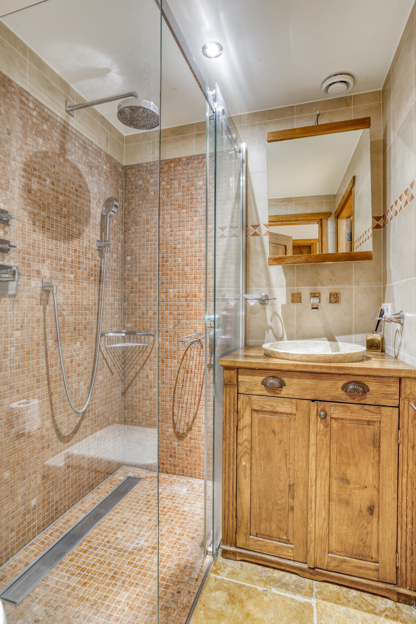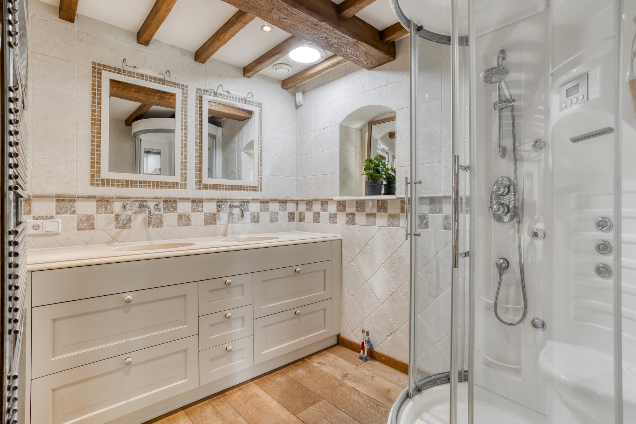 Ruime badkamer 1 met natuurstenen vloerbetegeling en wandbetegeling, balkenplafond met inbouwspots, douchecabine en een dubbele wastafel in meubel.