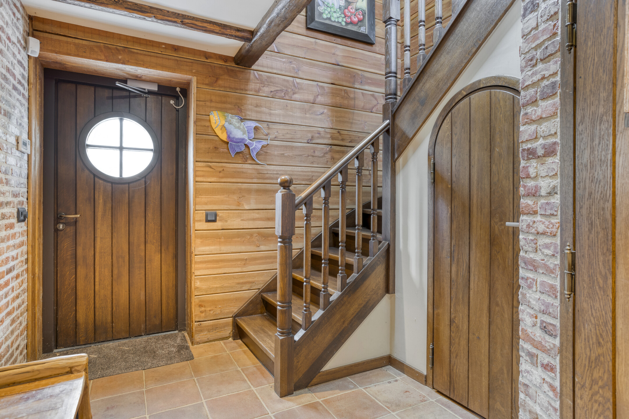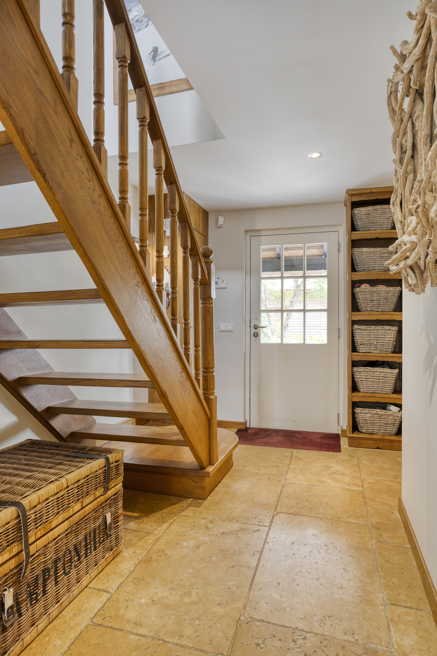 Het vrijstaande, royale gastenverblijf is voorzien van een rieten kap en een eigen privacy biedend zonneterras. De entree bevindt zich aan de zijkant van de woning. De hal is voorzien van natuurstenen vloerbetegeling en een grote kast met daarin de aansluitingen voor de wasapparatuur. In de hal bevinden zich ook de toiletruimte en een fraaie hardhouten trapopgang naar de eerste verdieping. Vanuit de hal is er toegang de woon-/eetkamer, slaapkamer 1 en badkamer 1.