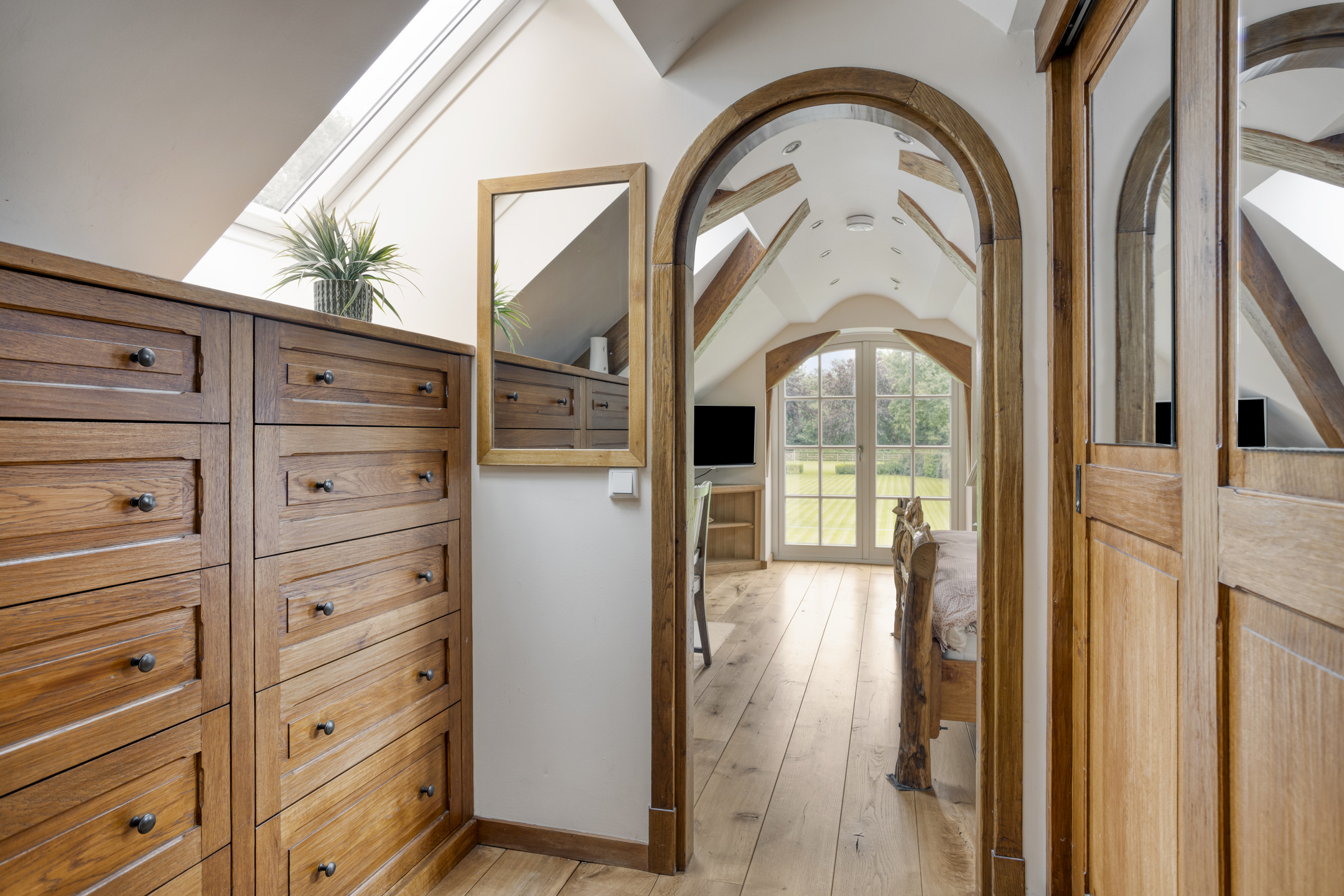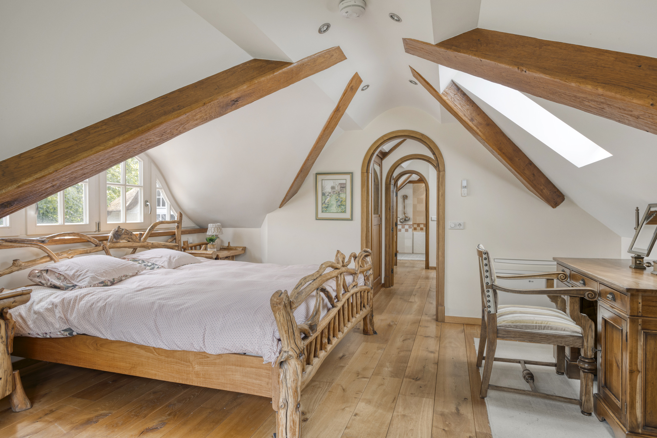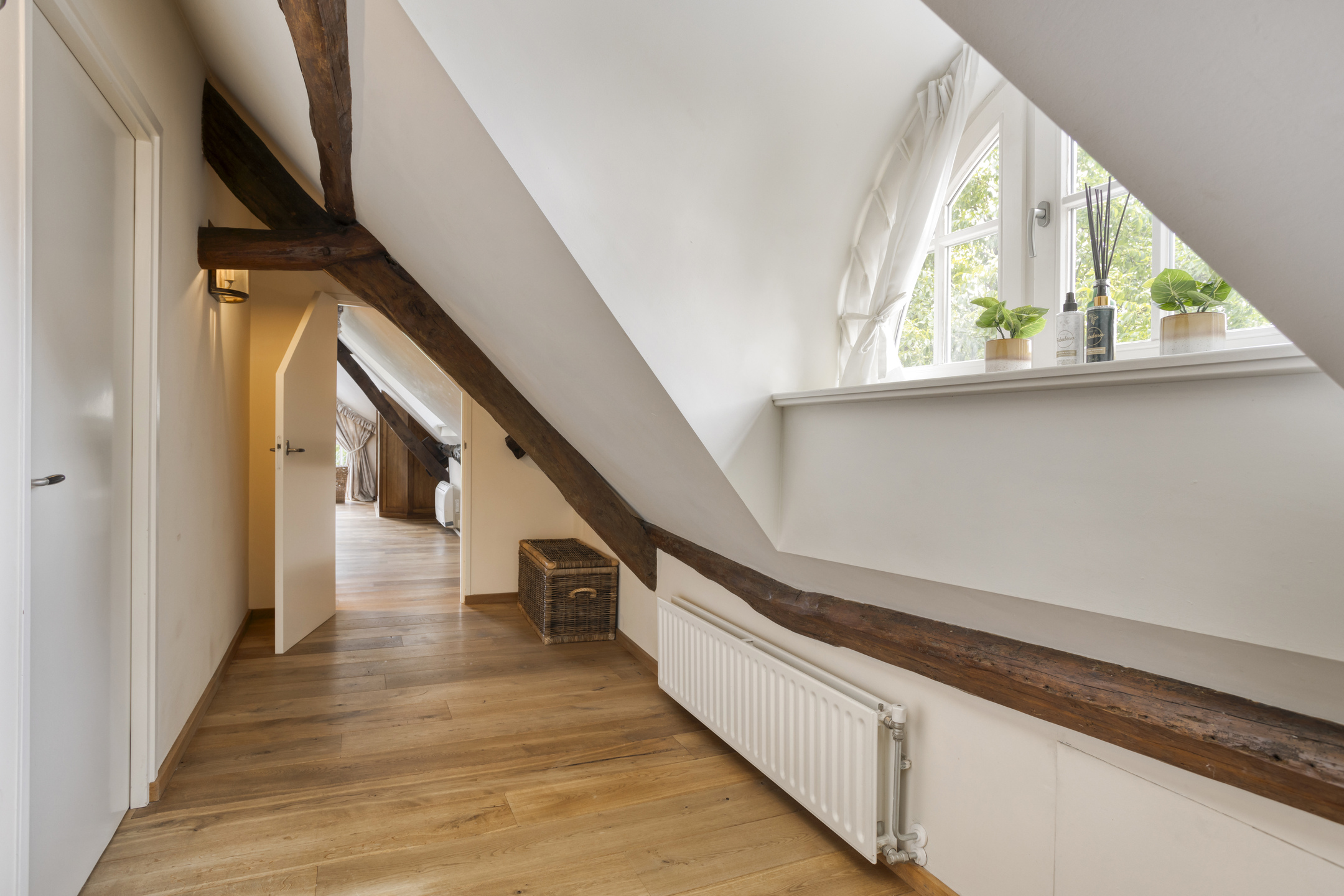 Royale overloop voorzien van een houten vloer en dakraam. Vanuit de overloop is badkamer 2 en de hal naar slaapkamer 2 bereikbaar. Deze hal is voorzien van twee grote inbouwkasten. De ruime slaapkamer 2 is voorzien van een houten vloer, een plafond met een karakteristieke balkenconstructie en inbouwspots, dakraam en dakkapel. Vanuit deze slaapkamer bieden openslaande deuren toegang tot een groot balkon dat een prachtig uitzicht biedt op de parkachtige tuin. De riante badkamer 2 heeft een houten vloer, wandbetegeling, een plafond met karakteristieke balkenconstructie en inbouwspots, dakraam en dakkapel. De badkamer is verder voorzien van een groot badkamermeubel met marmeren blad en dubbele wastafel, sierradiator, wandcloset en ligbad met douche functie. Vanuit de badkamer is de ruimte bereikbaar waarin zich de opstelling van de CV-combiketel bevindt.