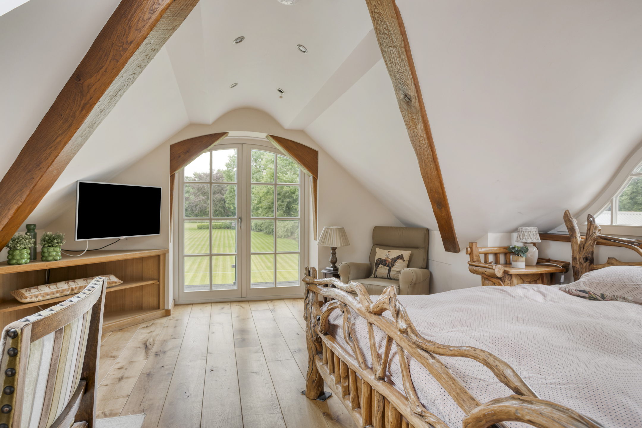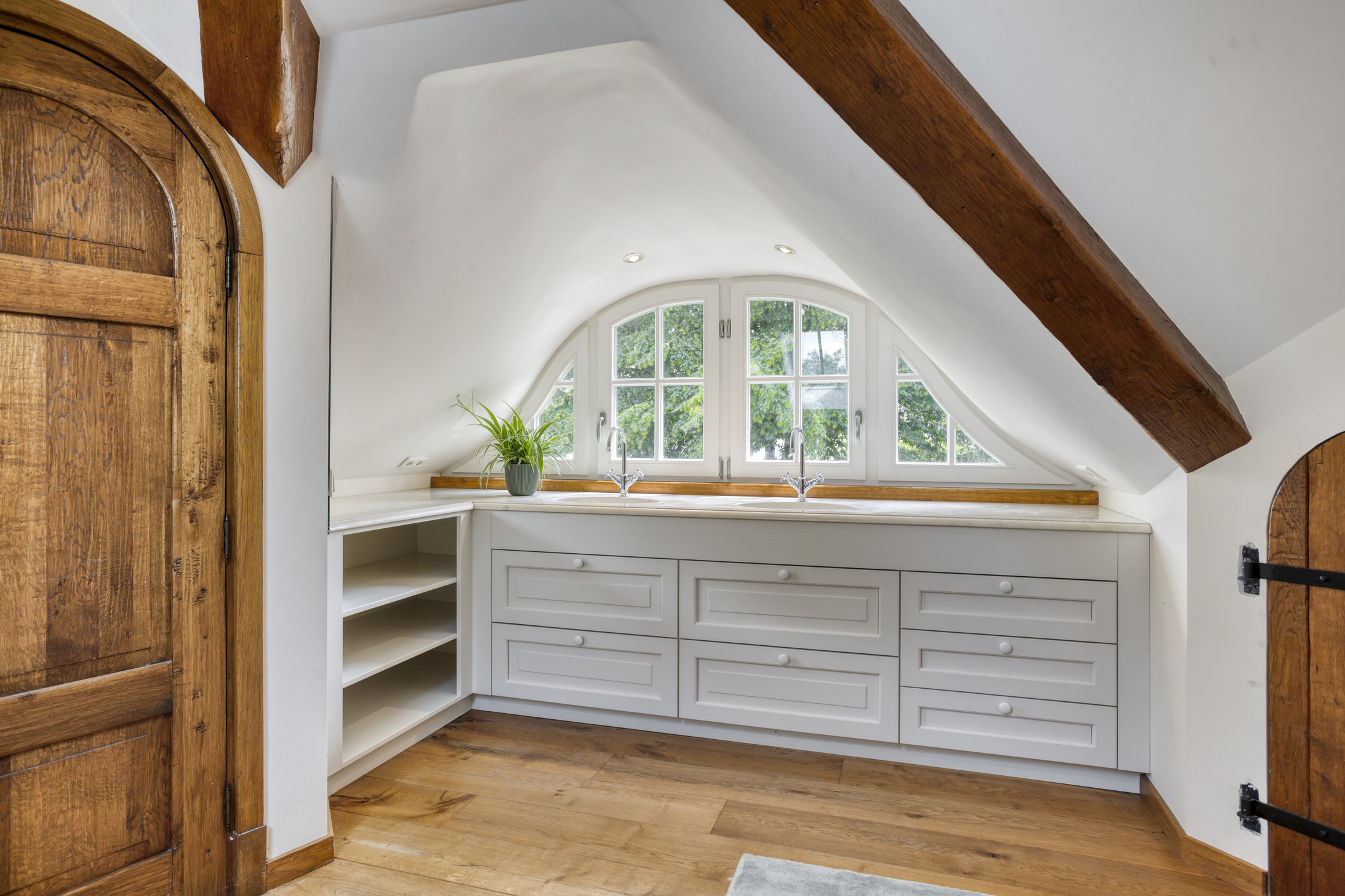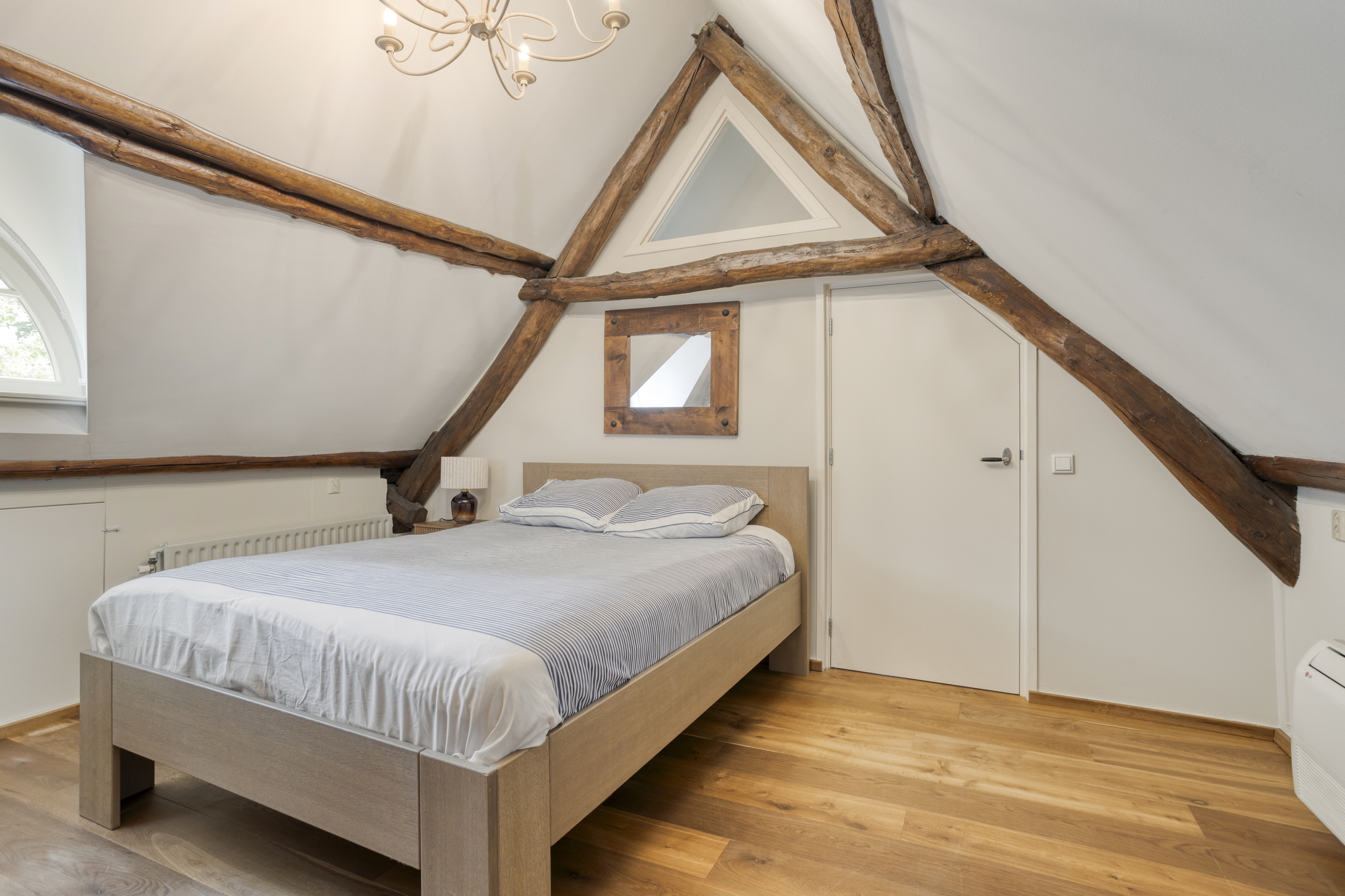 Royale overloop voorzien van een houten vloer en dakraam. Vanuit de overloop is badkamer 2 en de hal naar slaapkamer 2 bereikbaar. Deze hal is voorzien van twee grote inbouwkasten. De ruime slaapkamer 2 is voorzien van een houten vloer, een plafond met een karakteristieke balkenconstructie en inbouwspots, dakraam en dakkapel. Vanuit deze slaapkamer bieden openslaande deuren toegang tot een groot balkon dat een prachtig uitzicht biedt op de parkachtige tuin. De riante badkamer 2 heeft een houten vloer, wandbetegeling, een plafond met karakteristieke balkenconstructie en inbouwspots, dakraam en dakkapel. De badkamer is verder voorzien van een groot badkamermeubel met marmeren blad en dubbele wastafel, sierradiator, wandcloset en ligbad met douche functie. Vanuit de badkamer is de ruimte bereikbaar waarin zich de opstelling van de CV-combiketel bevindt.