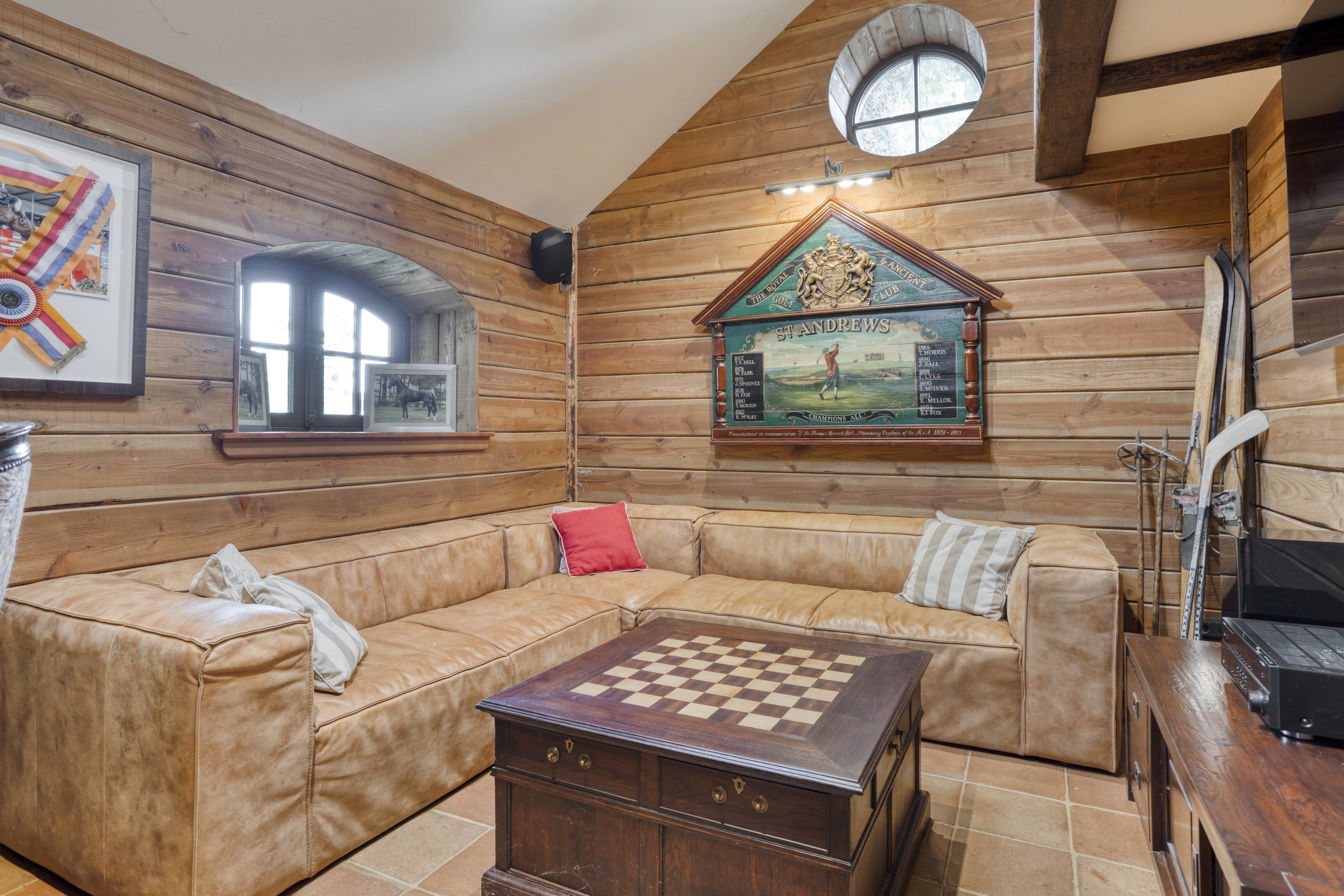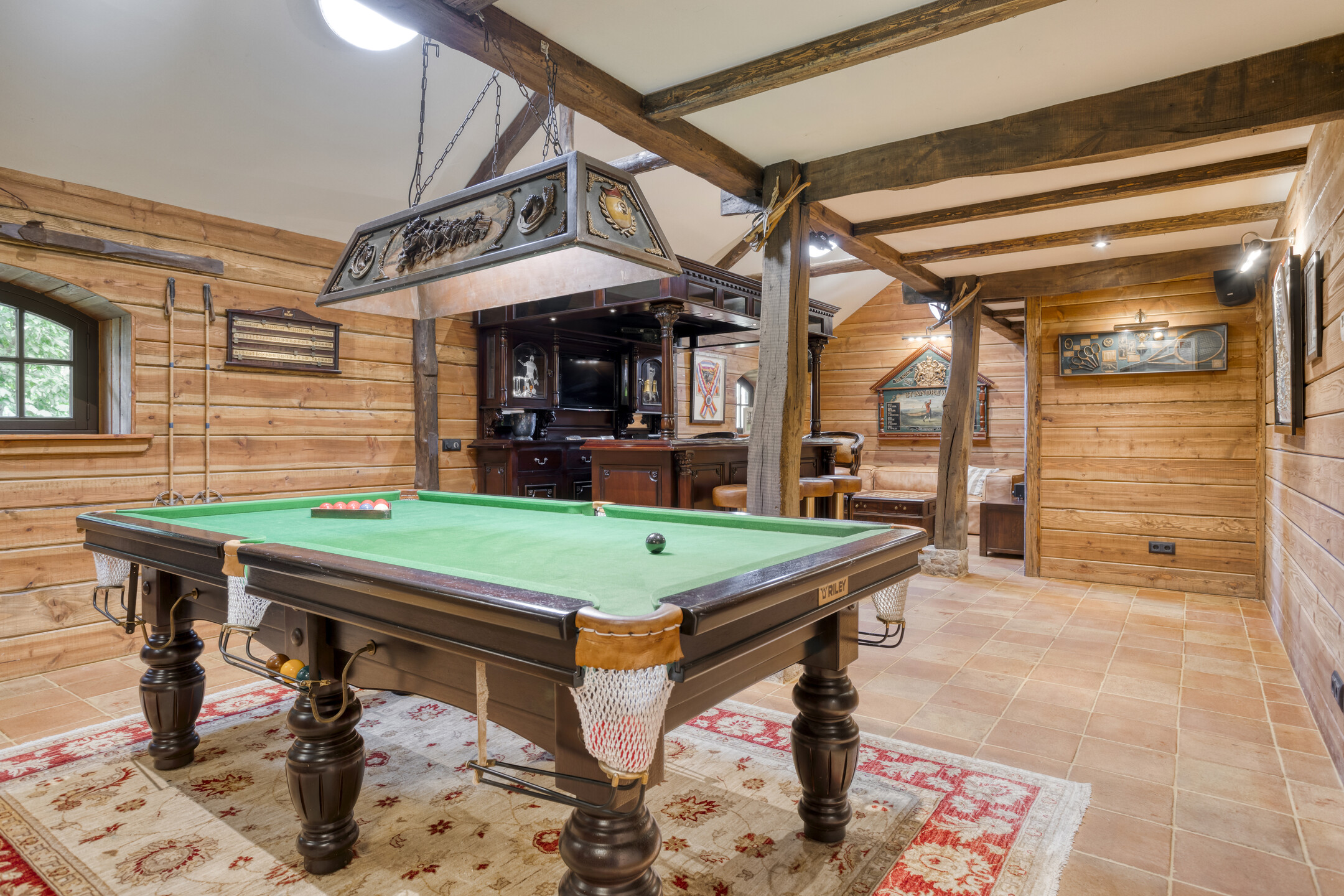 De voormalige garage is volledig verbouwd en voorzien van een rieten dak. Een deel van dit 'gepotdekselde' bijgebouw is in gebruik als berging. Deze is toegankelijk via een deur bij de carport. Op de begane grond bevindt zich verder een grote ontspanningsruimte. De hal is voorzien van natuurstenen vloerbetegeling, een grote kast met daarin de meterkast, de toiletruimte en een fraaie hardhouten trapopgang naar de eerste verdieping. Vanuit de hal is ook de ontspanningsruimte bereikbaar. Toiletruimte met natuurstenen vloerbetegeling, vrij hangend closet, urinoir en een designmeubel met fonteintje. Grote, sfeervolle ontspanningsruimte met natuurstenen vloerbetegeling, balkenplafond met inbouwspots en een glazen doorkijkje naar de erboven gelegen fitnessruimte/gym. Deze ontspanningsruimte is voorzien van een grote stijlvolle bar met ‘drankkast’, gezellige zithoek en een ingebouwd geluidssysteem. Op dit moment is deze ruimte deels in gebruik als ‘biljartkamer’. De toegangsdeur van de berging bevindt zich bij de carport. De berging biedt volop ruimte en is voorzien van een ingebouwde kastenwand. In de berging bevinden zich ook de installatie van de vloerverwarming en de aansluitingen voor de CV- en beregeningsinstallatie.
