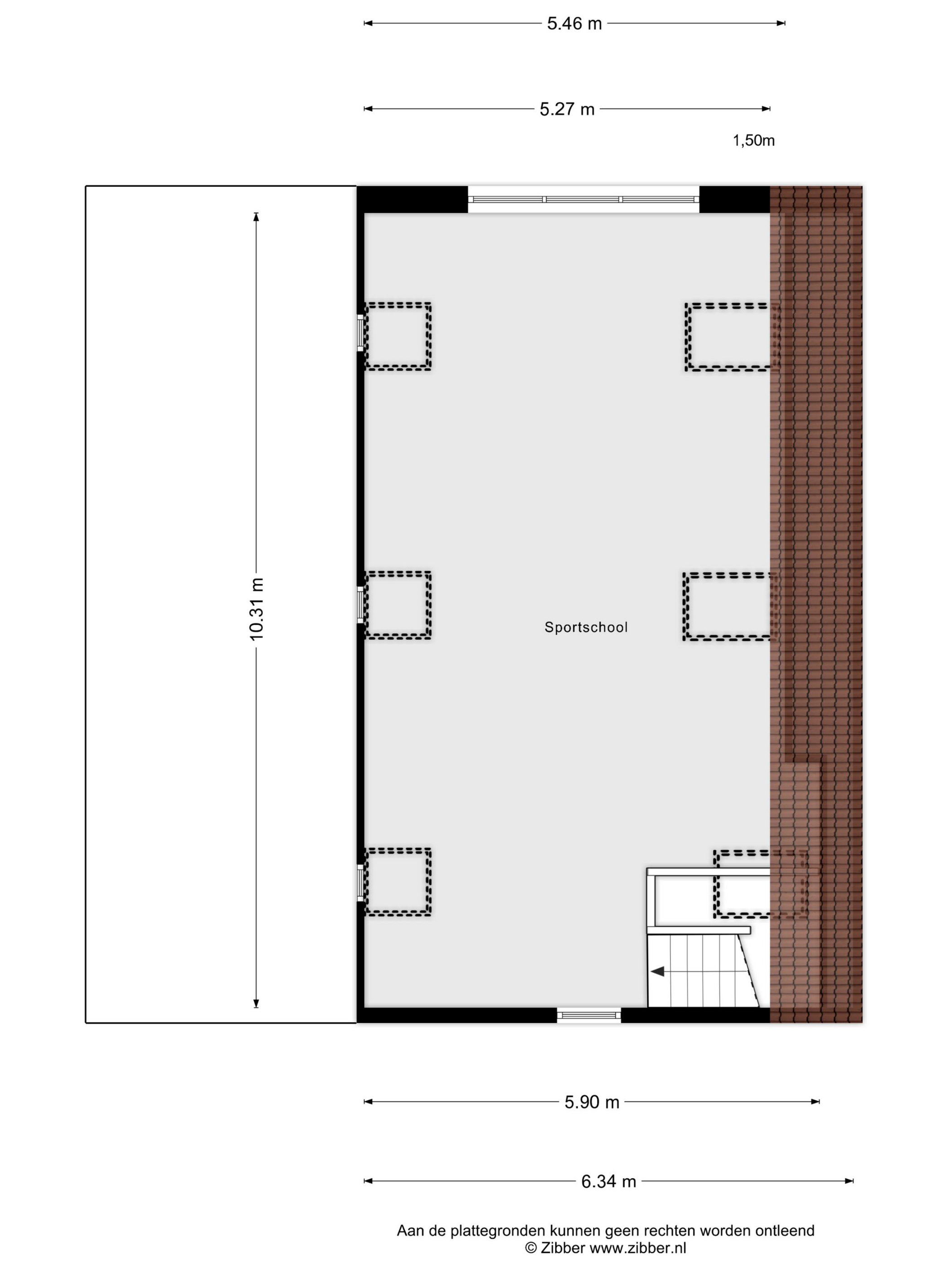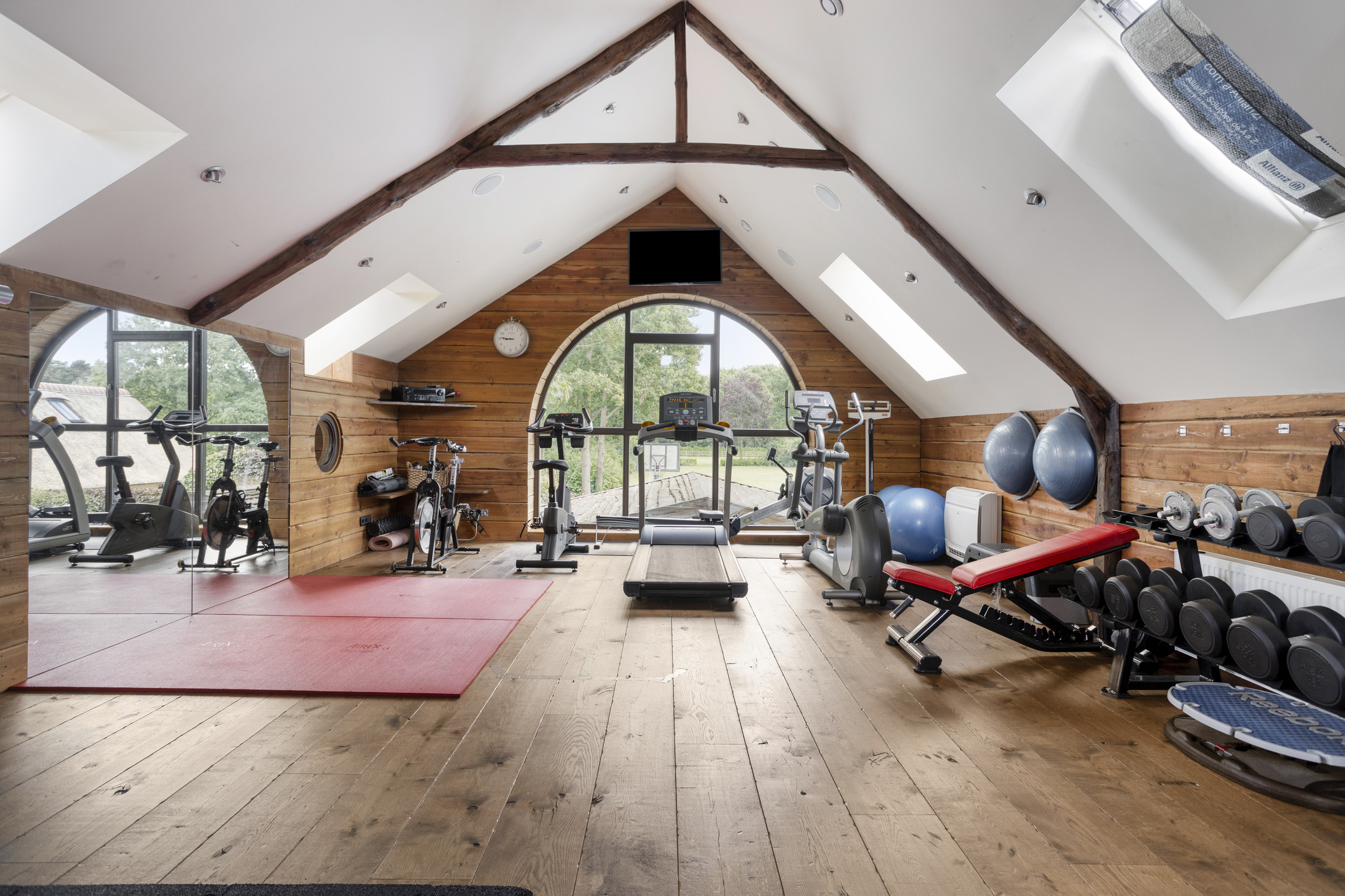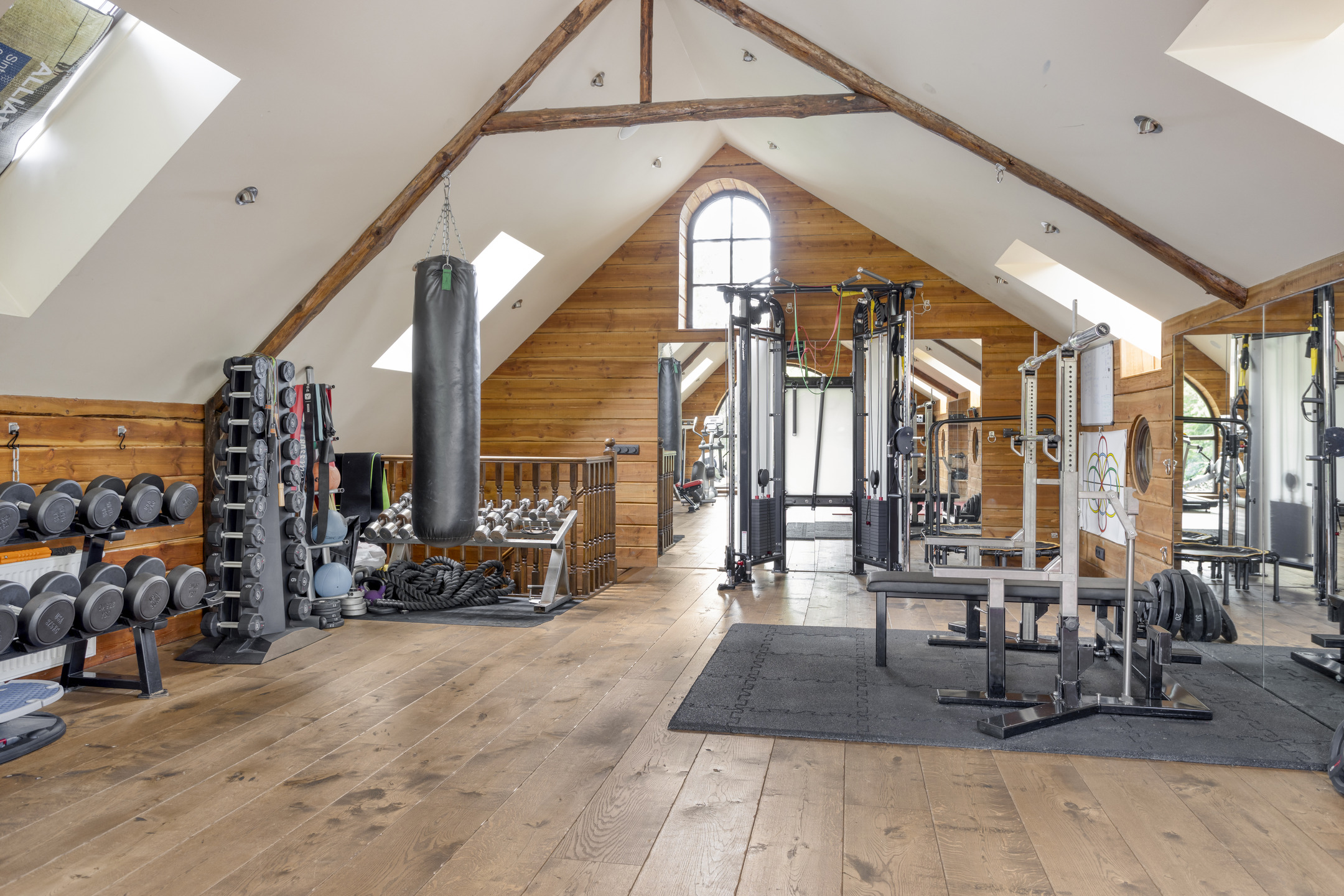 Over de gehele eerste verdieping gelegen grote, sfeervolle ruimte met houten vloer, balkenplafond met inbouwspots, diverse dakramen, grote raampartijen, spiegelwanden en een glazen doorkijkje naar de ontspanningsruimte op de begane grond. Deze zeer royale ruimte is momenteel in gebruik als gym/fitnessruimte.