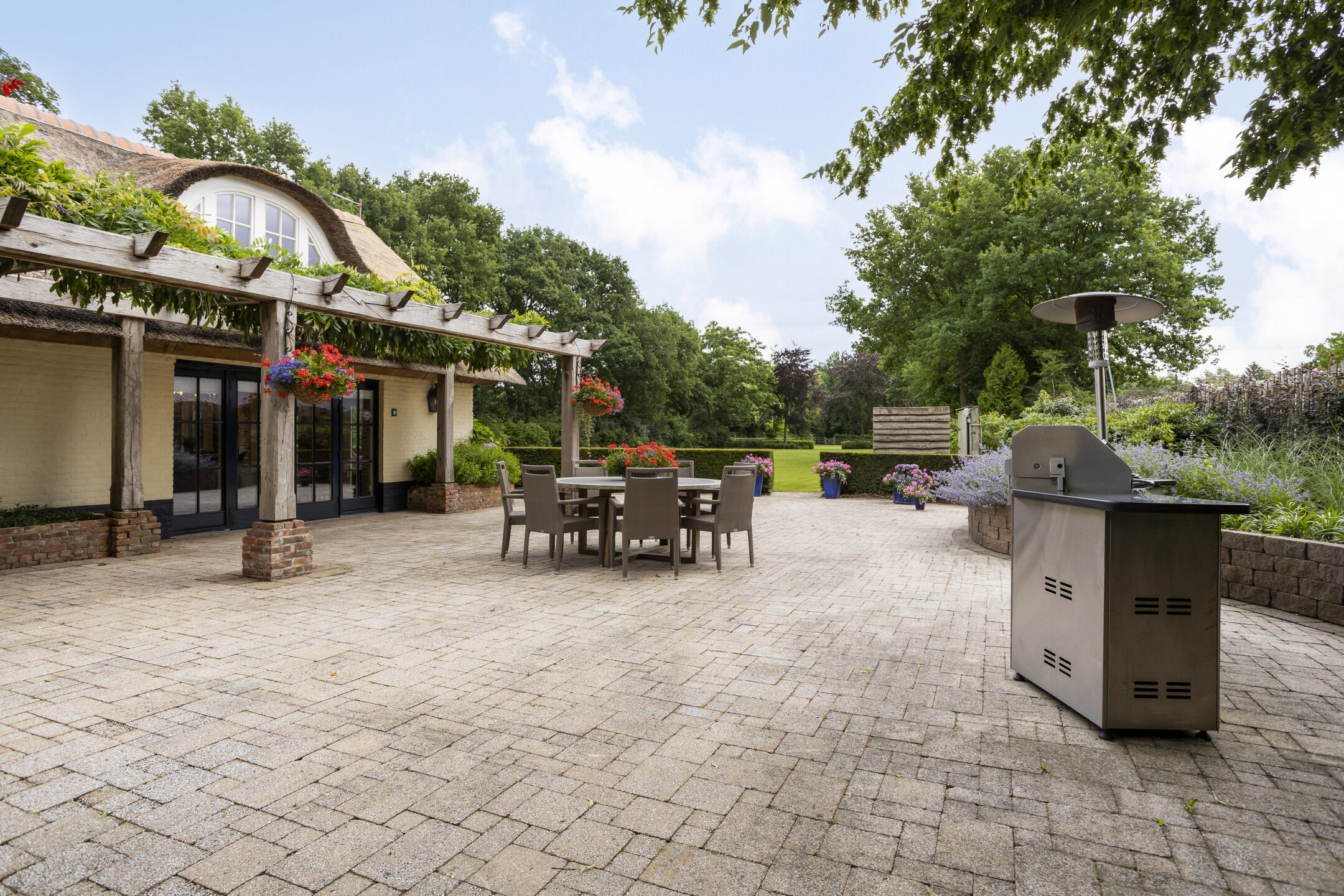 De fraai aangelegde zeer royale tuin ligt op het oosten en beschikt over meerdere grote zonneterrassen. De terrassen zijn dusdanig gesitueerd dat zowel de woonboerderij als het gastenverblijf kunnen rekenen op voldoende privacy en een prachtig uitzicht bieden op de parkachtige achtertuin. Het terras grenzend aan de woonboerderij is voorzien van een grote glazen overkapping en een fraaie pergola.
