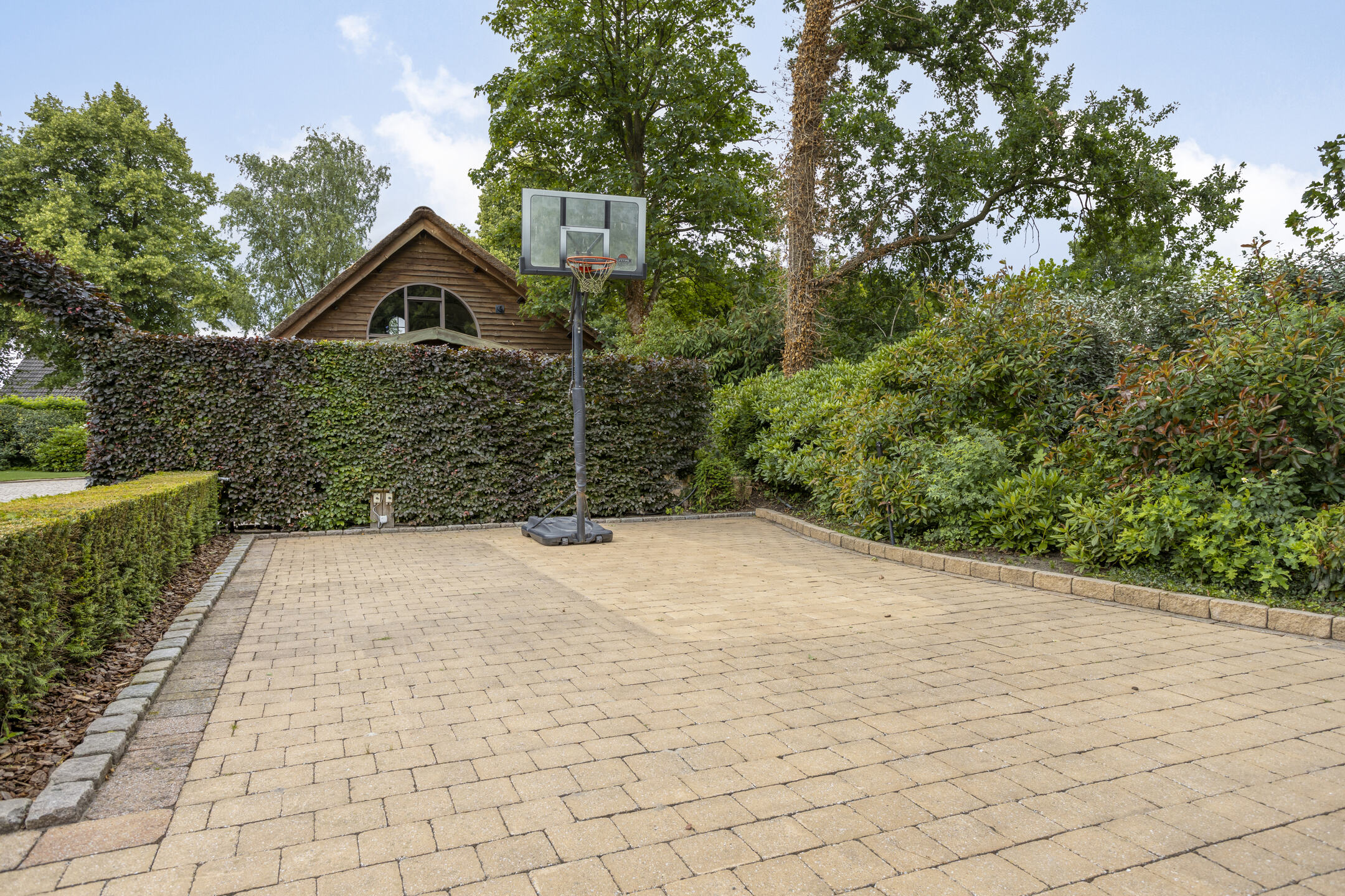 De carport bevindt zich aan de zijkant van het bijgebouw en biedt plaats aan meerdere auto’s. Hier bevindt zich ook een elektrisch oplaadpunt. Naast de carport is een door heggen afgeschermd basketbalveld.