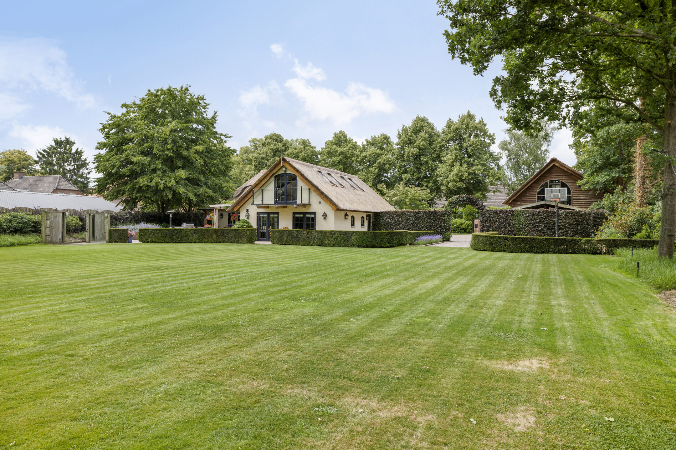 In een rustige straat aan de rand van Riethoven op een magnifiek perceel van 6.755 m² gelegen prachtige in oude stijl gerenoveerde woonboerderij met rieten kap. De woning is smaakvol verbouwd en beschikt over een groot, vrijstaand gastenverblijf, een royaal bijgebouw met ontspanningsruimte en fitnessruimte/gym, een ruime carport voor meerdere auto's en een prachtig aangelegde parkachtige tuin op het westen.
