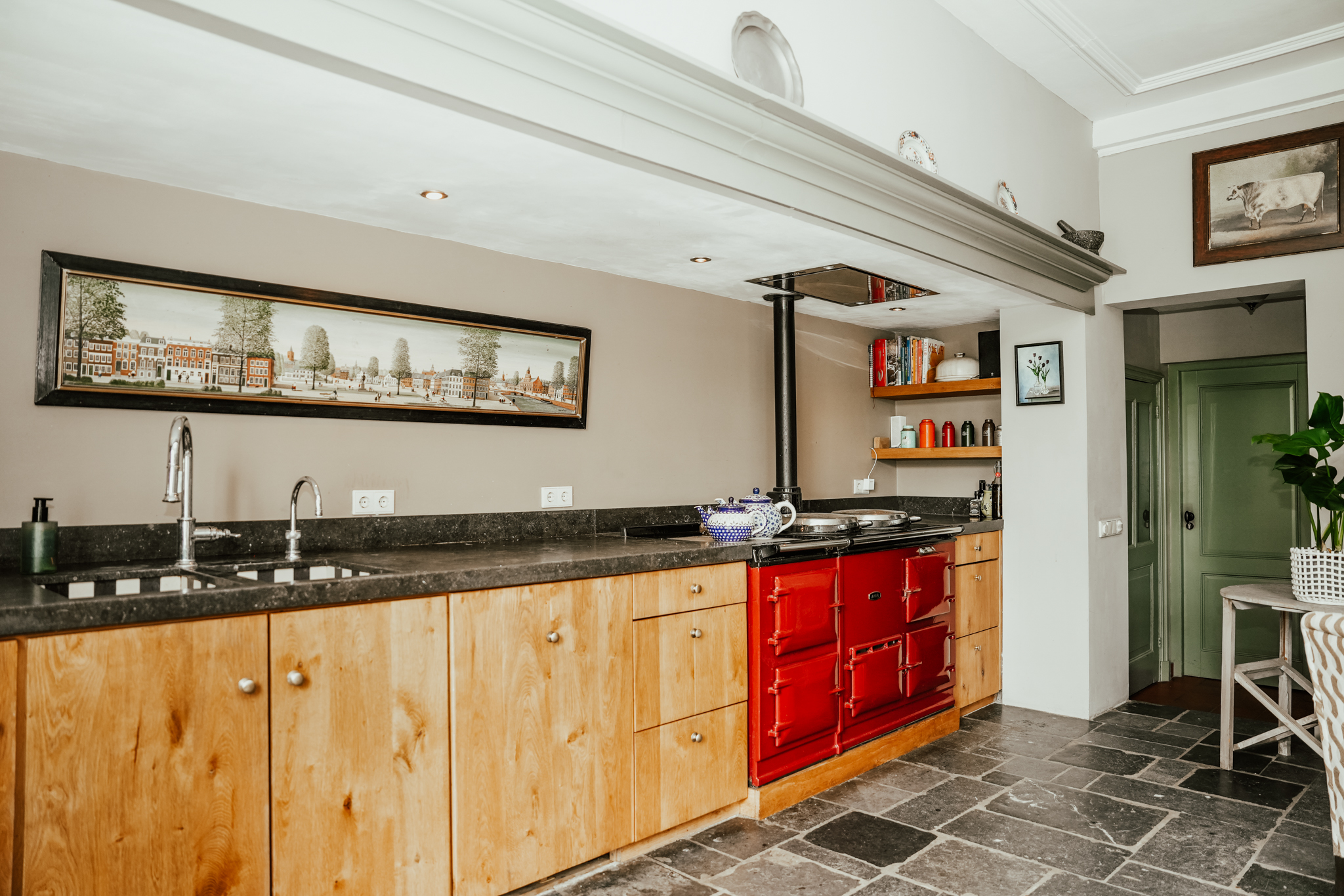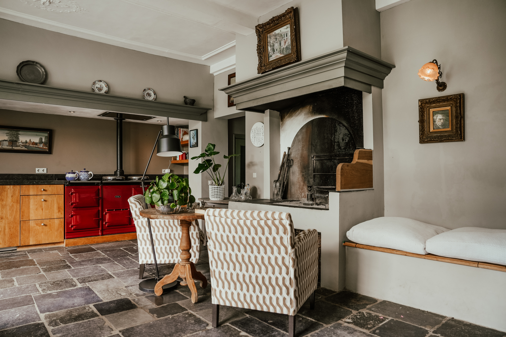 De grote woonkeuken vormt het hart van de woning en geeft zicht op de tuin. Er is een antieke hardstenen vloer met vloerverwarming en onder de brede schouw staat een dubbel AGA-fornuis. De eiken maatwerkkeuken voorzien van hardstenen werkblad past perfect in de sfeer van deze leefruimte. Bonus in de woonkeuken is de verhoogde vuurplaats die als openhaard maar ook als grill gebruikt kan worden.
