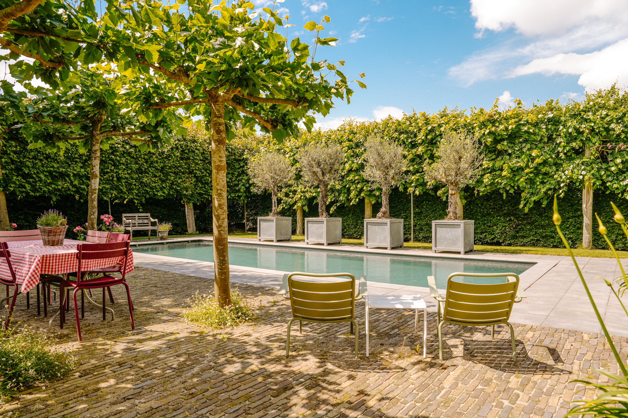 Het verwarmde zwembad van ruim 10 meter lang heeft een fraaie grijze liner, solardeck en een volautomatische regeling. Bij het zwembad is het heerlijk toeven op het grote zonneterras dat omgeven is door grote dakplatanen voor natuurlijke schaduwplekken. In de tuin staat een keur aan fruitbomen, waaronder diverse appelrassen, peren, pruimen, kersen, kweeperen en walnoten. Vanaf één van de terrassen leidt een rozenberceau naar de achteruitgang.