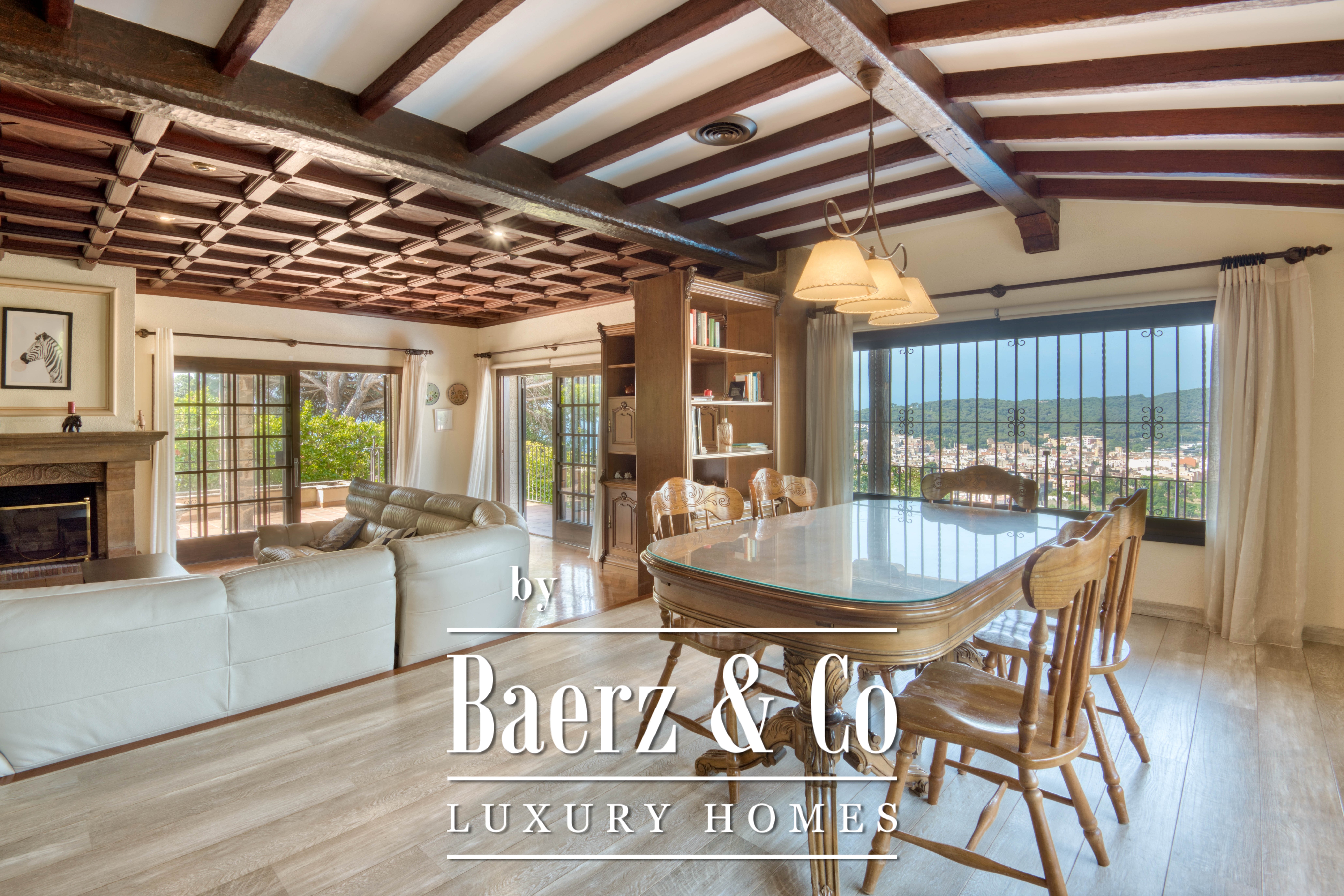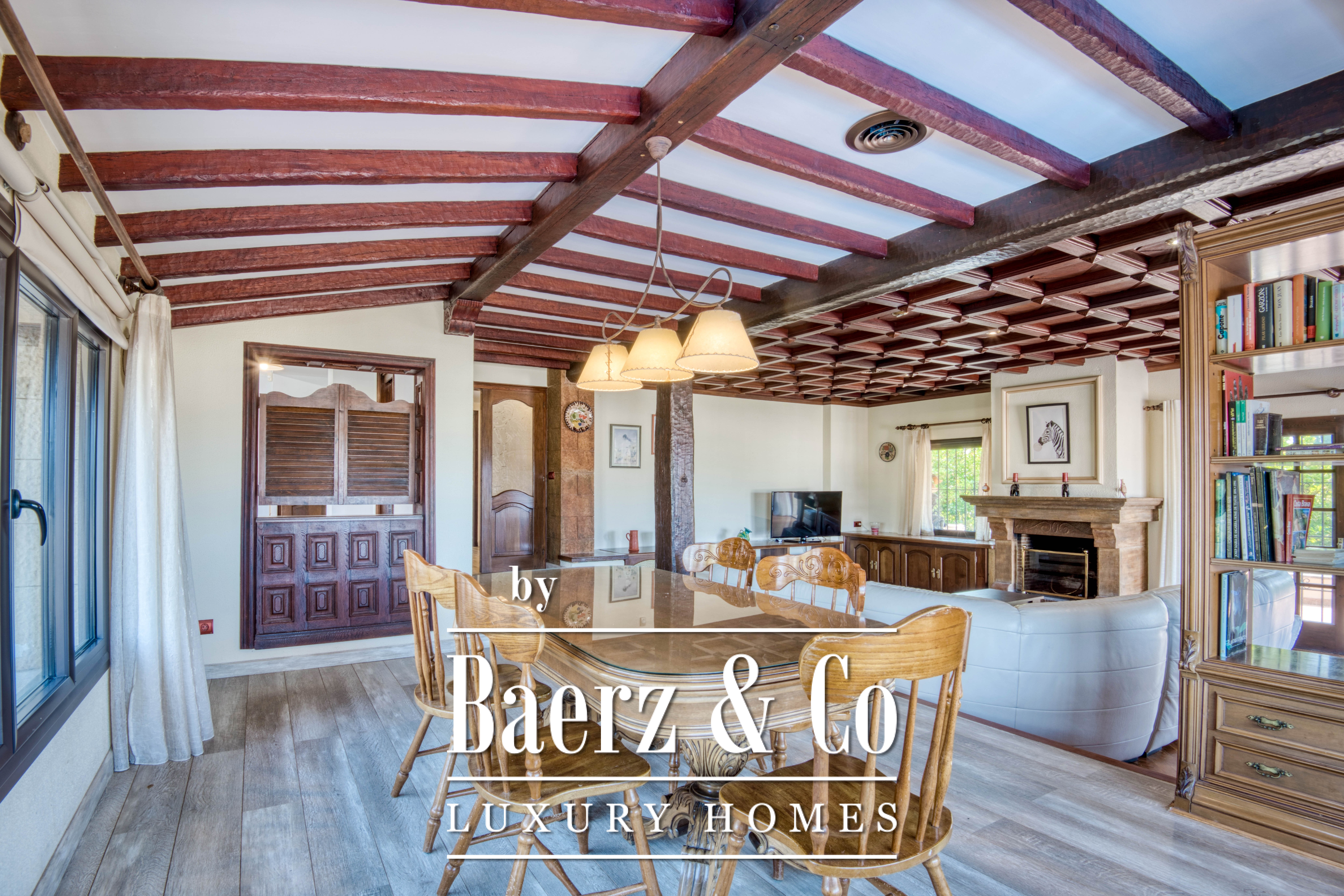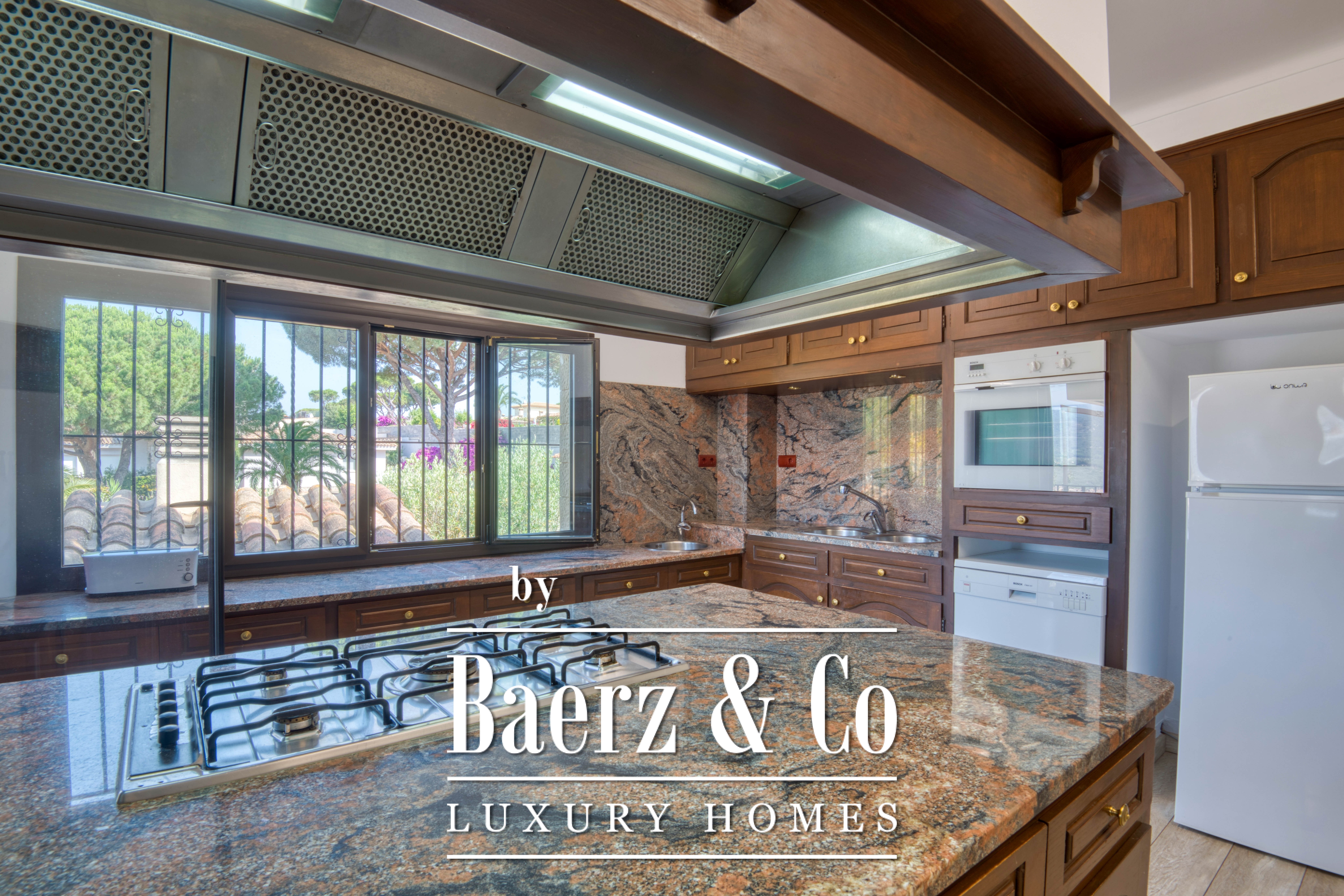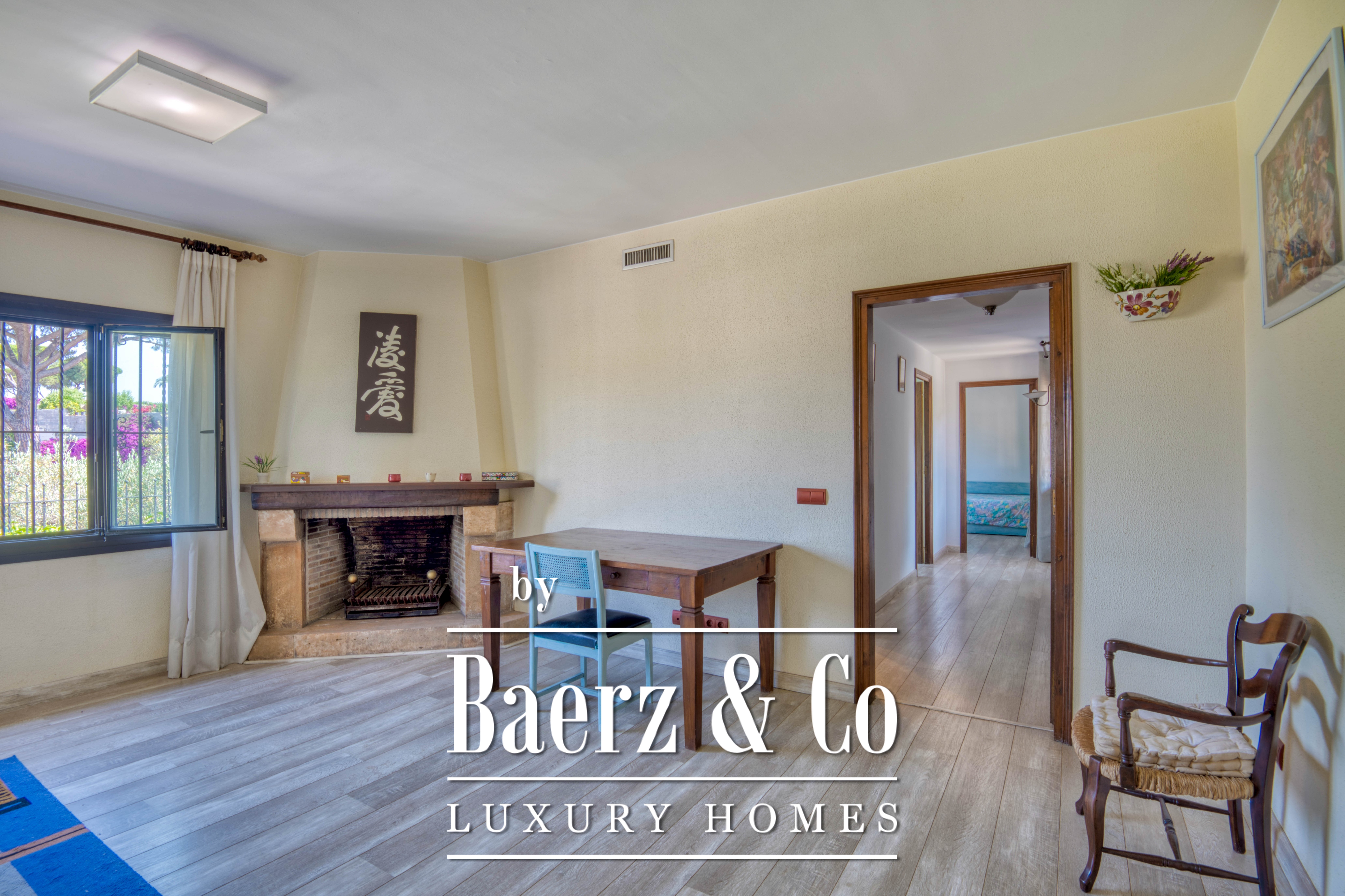 Het hart van de woning bestaat uit een royale woonkamer met open haard die doorloopt in een ruime eetkamer—een natuurlijke plek voor samenzijn maar ook voor rust. De aparte, volledig uitgeruste keuken biedt alle faciliteiten voor culinaire creativiteit en kijkt uit op levendige tuinen. Overdekte veranda’s en terrassen, ideaal gesitueerd voor de zonsondergang, vormen uitnodigende plekken om te genieten van het buitenleven en reflectie, terwijl de privétuin met mediterrane beplanting het huis omringt met rust.