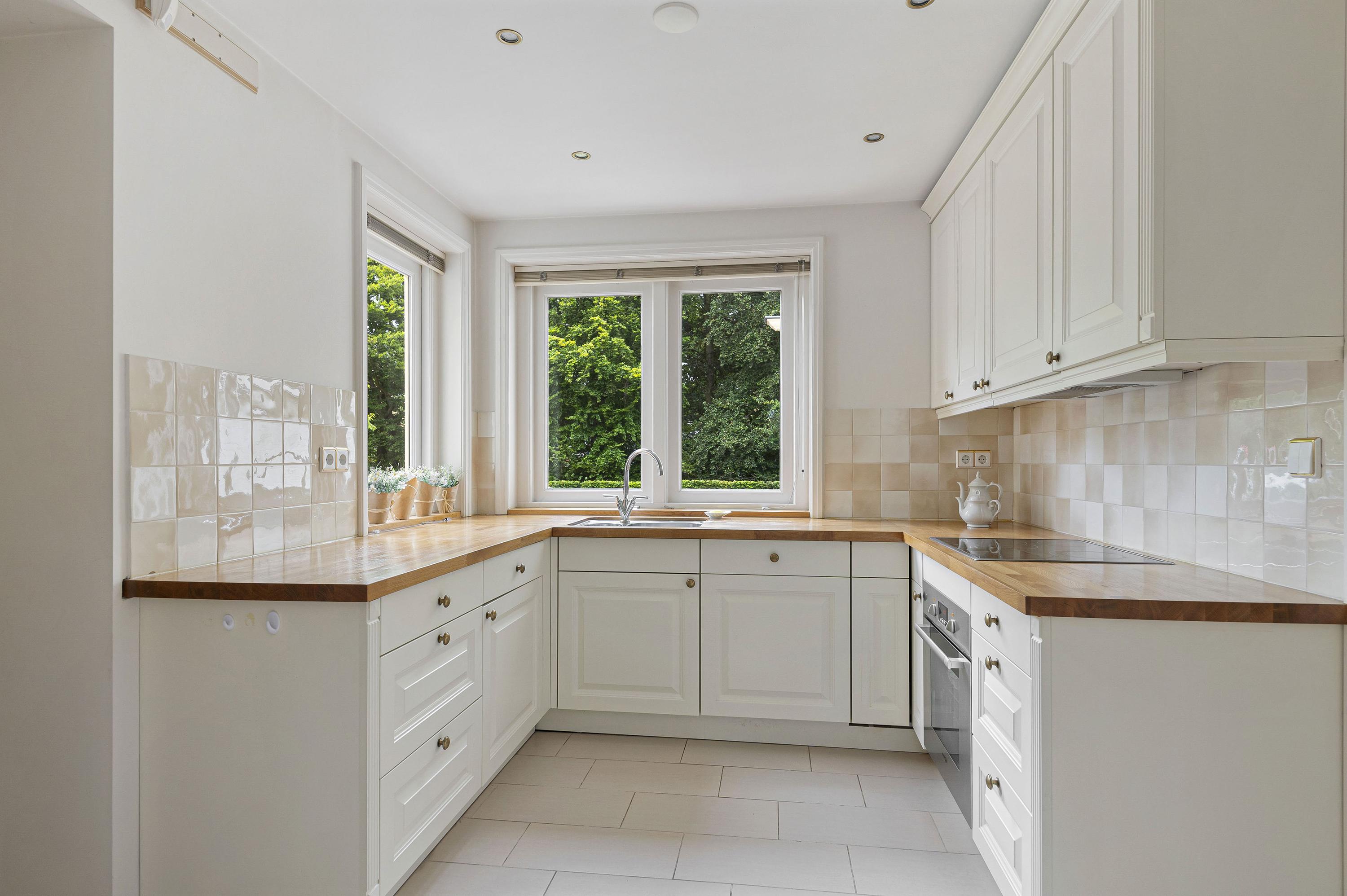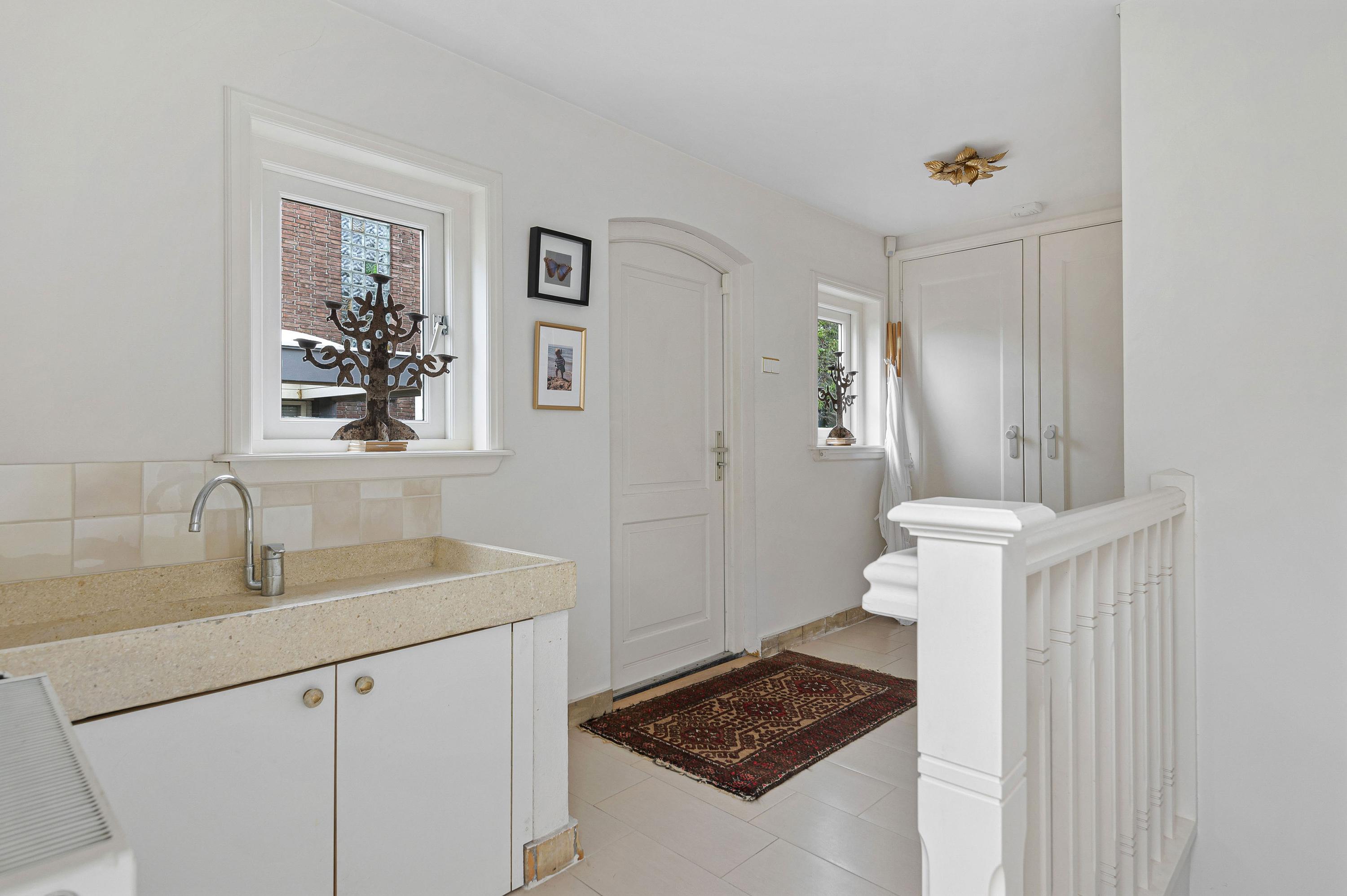 Entree in zeer ruime hal, sfeervolle glas in lood ramen, toilet en verdiepte garderobe. De woonkamer is opgesteld in L-vorm, heeft veel lichtinval, sfeervolle gashaard en is voorzien van een prachtige houten parketvloer. De serre en tweede woonkamer zijn later aangebouwd waardoor er veel extra ruimte is gecreëerd welke meerdere mogelijkheden geven. De serre en tweede woonkamer zijn voorzien van een nette tegelvloer met vloerverwarming. De keuken is gelegen aan de voorzijde van de woning welke tevens toegang biedt tot de ruime bijkeuken.