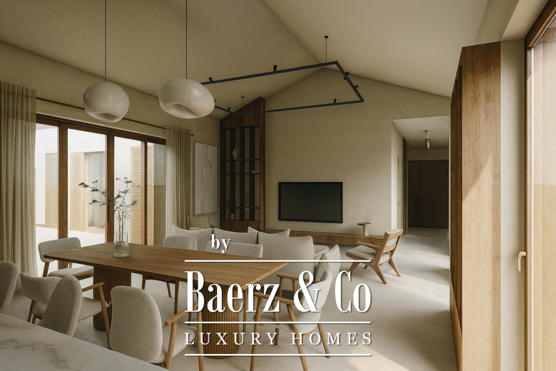 Binnen beschikt de villa over drie slaapkamers en drie ingetogen badkamers. De moderne keuken loopt naadloos over in de open eet- en leefruimte, waardoor een sfeer ontstaat die wordt gekenmerkt door strakke lijnen, veel daglicht en ruimtelijke helderheid. Daarnaast voorzien een privéfitness en gastfaciliteiten in verfijnd dagelijks comfort. Nauwkeurig geselecteerde materialen benadrukken de kwaliteit en ingetogen elegantie in het hele huis.