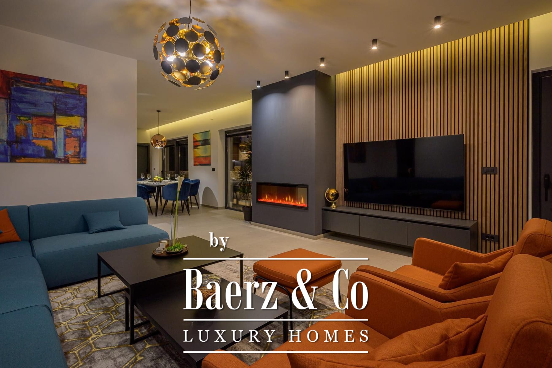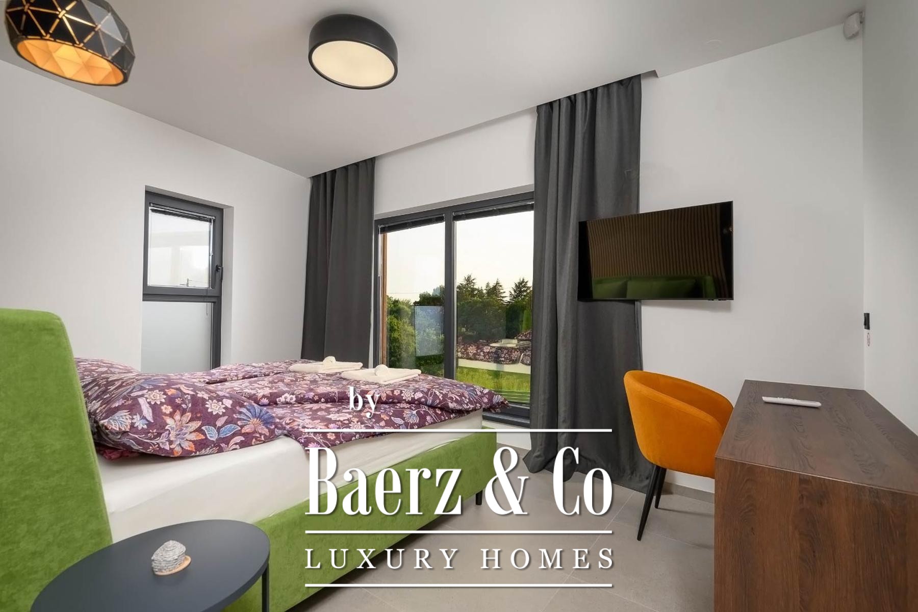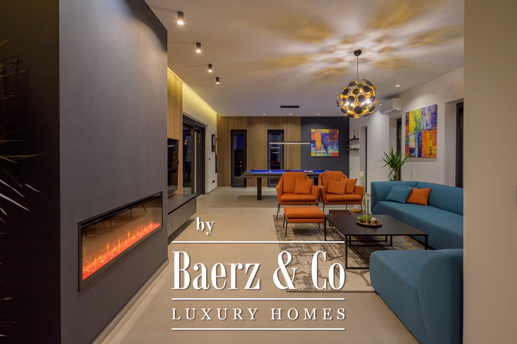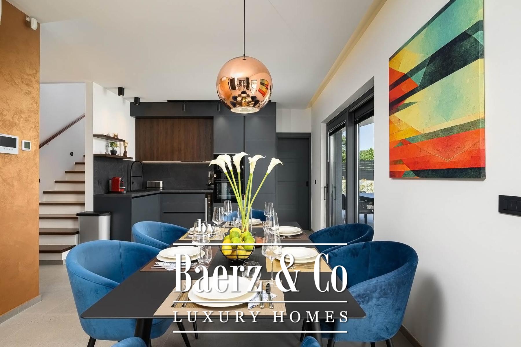 Op de verdieping beschikken drie slaapkamers elk over een eigen badkamer, waarmee rust en privacy voor bewoners of gasten gewaarborgd zijn. Precieze klimaatbeheersing is mogelijk dankzij elektrische vloerverwarming, airconditioning in iedere kamer en een elektrische haard; Modul-designmeubels en Samsung Smart TV’s versterken het gevoel van rust door het hele huis.