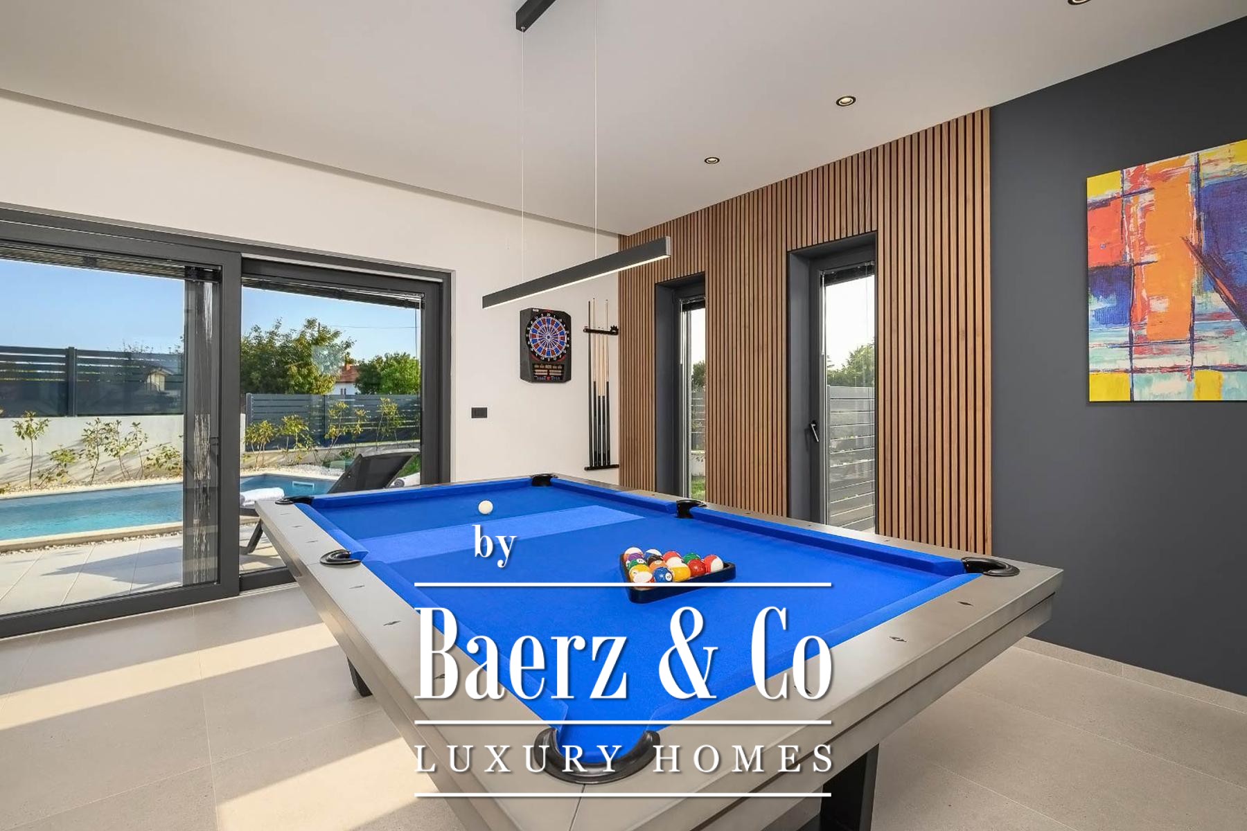 Aanvullende pluspunten zijn een Duits vervaardigde pooltafel, alarmsysteem, camerabewaking, LED-verlichting binnen en buiten, en infrastructuur voor zonneboiler. De energiezuinigheid wordt versterkt door een gevel van 15–20 cm dikte en schuifwanden die de woonruimtes verbinden met buiten. Deze villa te koop in Svetvinčenat is volledig gemeubileerd, geclassificeerd met vier sterren en presteert uitstekend als toeristische verhuur. De locatie biedt rust en verfijnd woongenot, met praktische vergunningen en gegarandeerd eigendom.