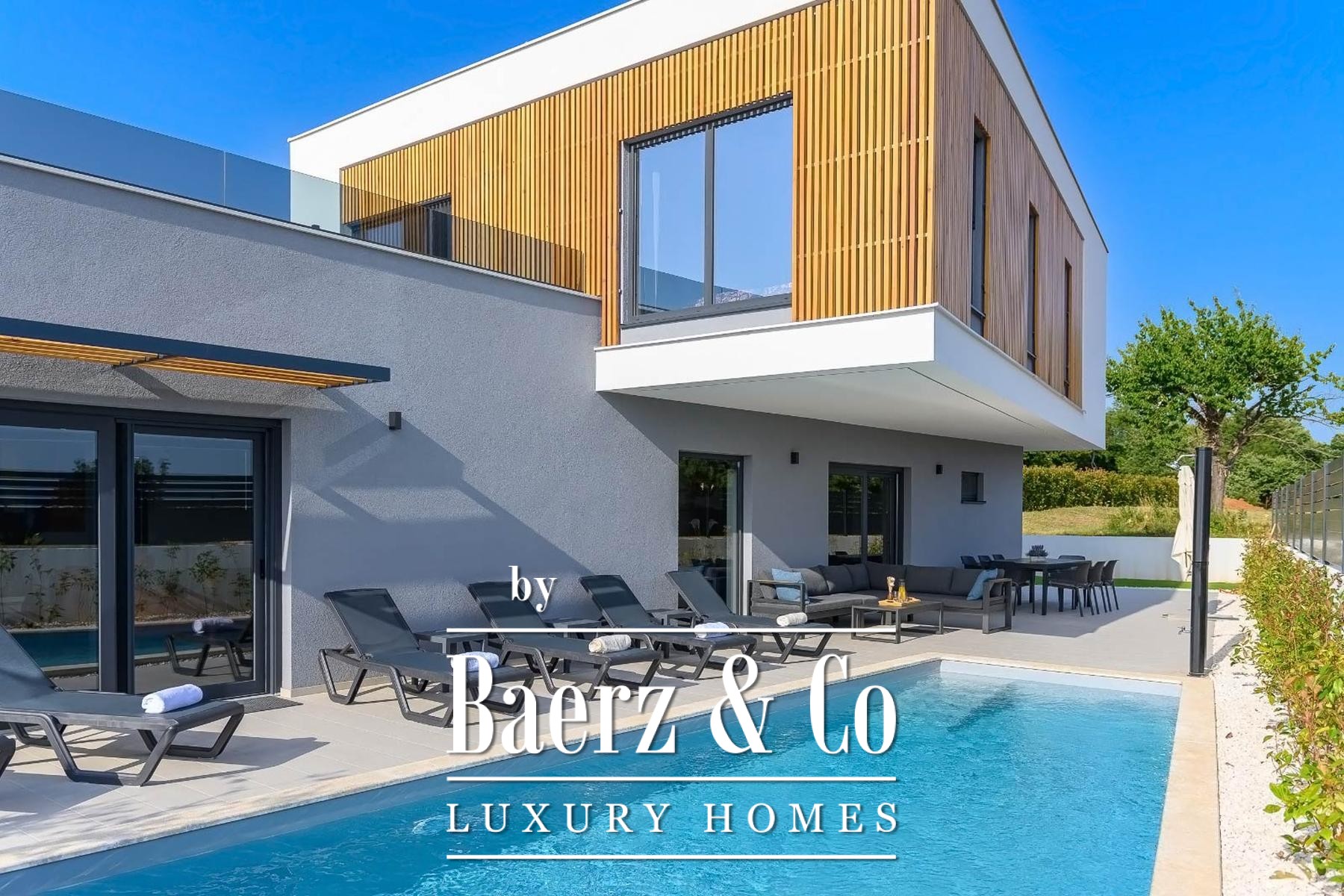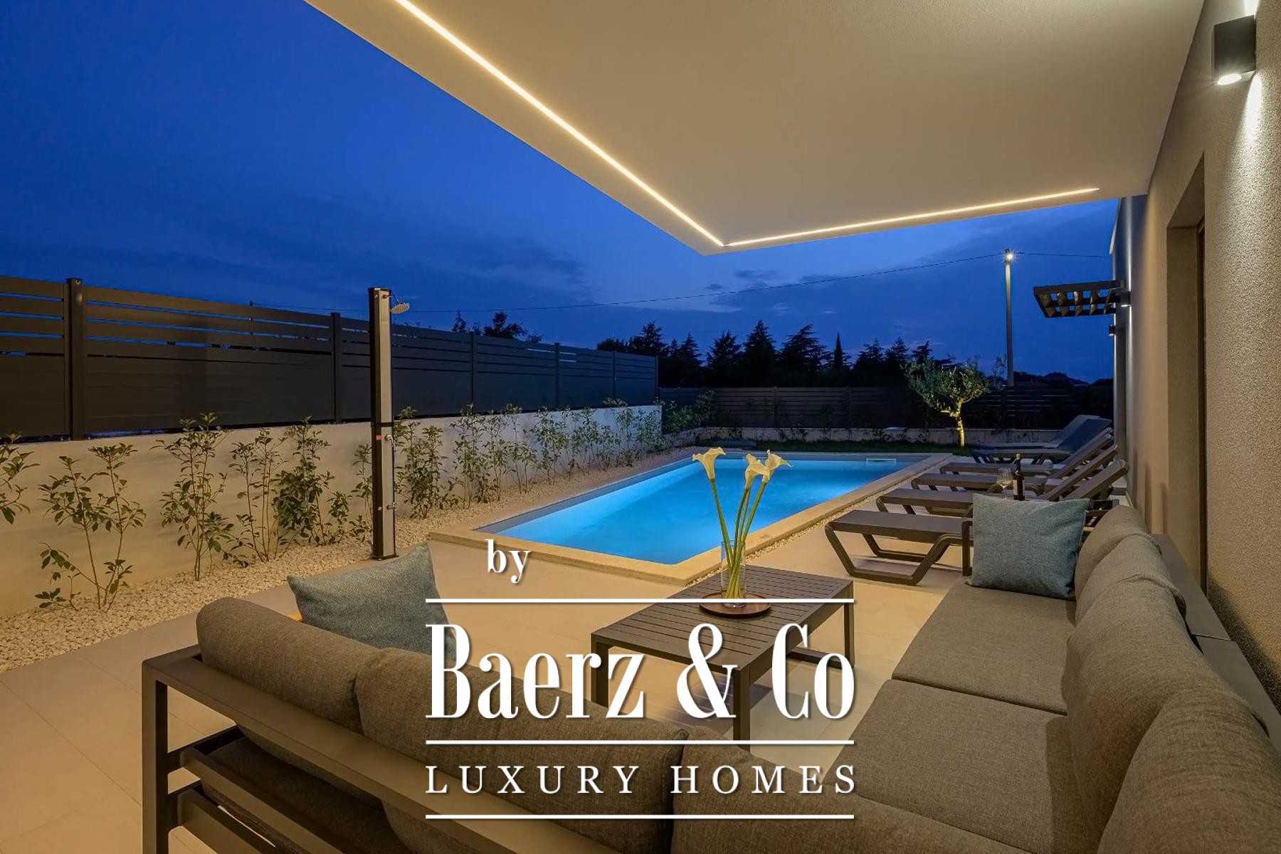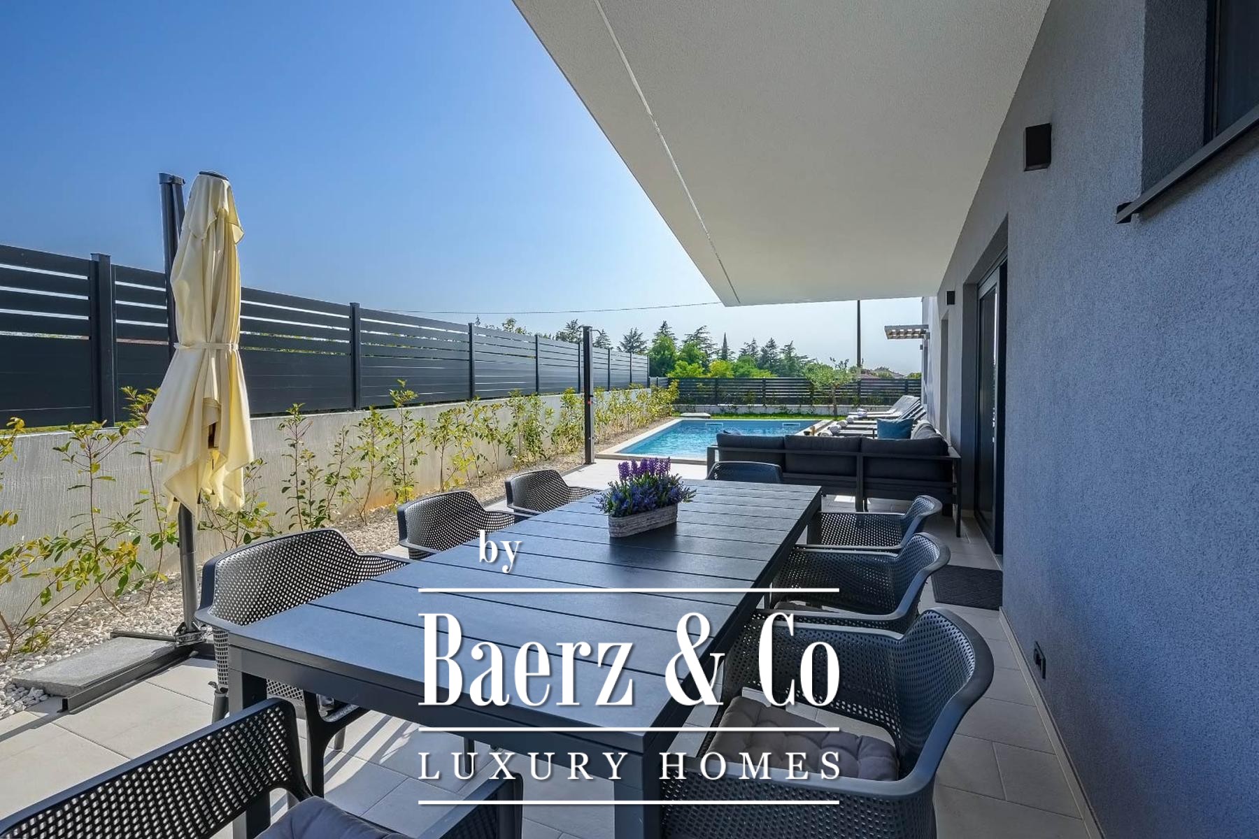 Villa Svetvinčenat bevindt zich discreet in het hart van het dorp en biedt 215 m² zorgvuldig ingedeelde leefruimte op een perceel van 460 m². Deze villa te koop in Svetvinčenat staat voor ingetogen comfort en een naadloze overgang tussen binnen en buiten. De centrale leefruimte is verbonden met een open keuken, eetgedeelte en zitkamer, allemaal rijkelijk voorzien van daglicht door glazen wanden die uitkomen op een overdekt terras met uitzicht op een zoutwaterzwembad van 32 m². Op de begane grond zorgen een gastentoilet en berging voor extra dagelijks gemak.
