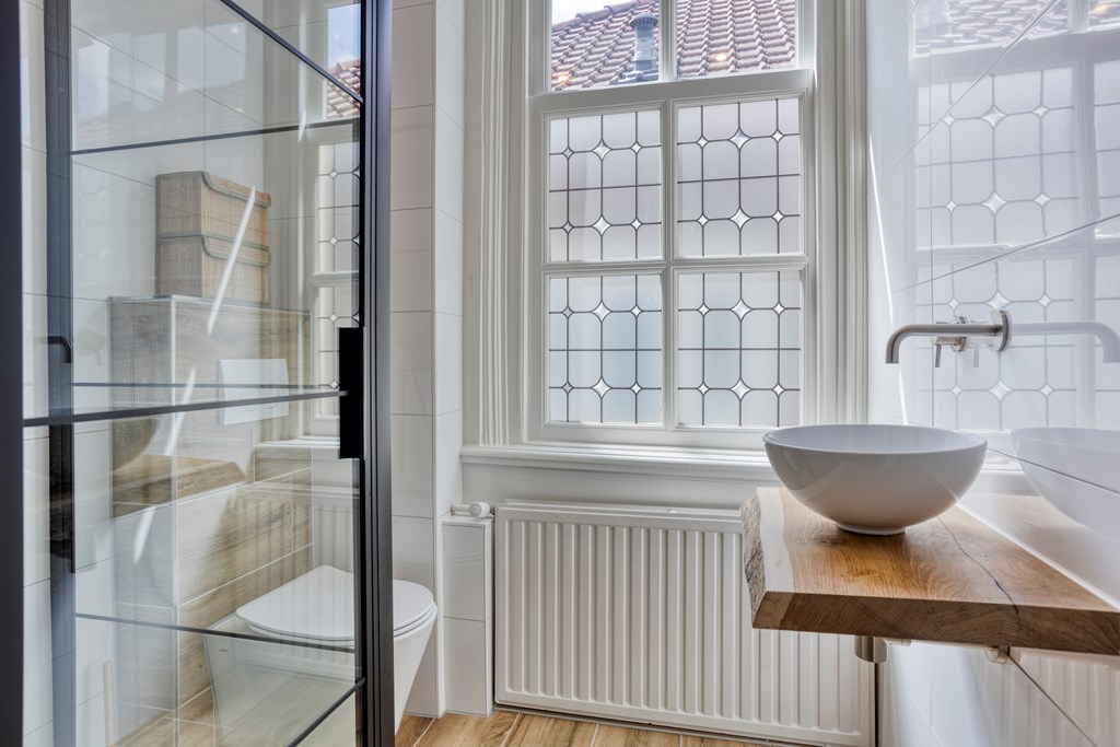 De kamer heeft een rustige uitstraling, perfect om u terug te trekken na een lange dag. Ook de andere kamers worden heerlijk verlicht door de grote raampartijen en hebben nog de prachtige originele houten vloer. De badkamer is stijlvol betegeld en uitgerust met een regendouche, een robuust eiken meubel met waskom, geïntegreerde kraan en een tweede toilet. Alles is in lichte, natuurlijke tinten uitgevoerd, wat zorgt voor een frisse en luxe uitstraling.