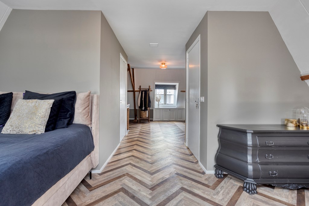 Op de tweede verdieping wordt u verrast door een royale, open ruimte met een bijzondere indeling. Meteen valt de warme uitstraling op dankzij de fraaie vloer en de zichtbare houten spanten die deze etage een bijzonder karakter en aangename sfeer geven. De verdieping is zo ingedeeld dat het slaapgedeelte, de loungehoek en werk/studeerplek met elkaar in verbinding staan. Deze verdieping beschikt tevens over een eigen pantry met origineel granito aanrechtblad , een eigen badkamer, stijlvol afgewerkt met houtlook tegelwerk, witte wandtegels en zwarte balkdetails. De badkamer is uitgerust met een inloop regendouche, een wandcloset en ook hier vindt u een waskom op een robuust eiken blad en geïntegreerde kraan. Een heerlijke luxe toevoeging, waardoor deze verdieping uitstekend kan functioneren als thuiskantoor, zelfstandig (gasten)verblijf , loft voor één van uw kinderen, of uw royale master suite!