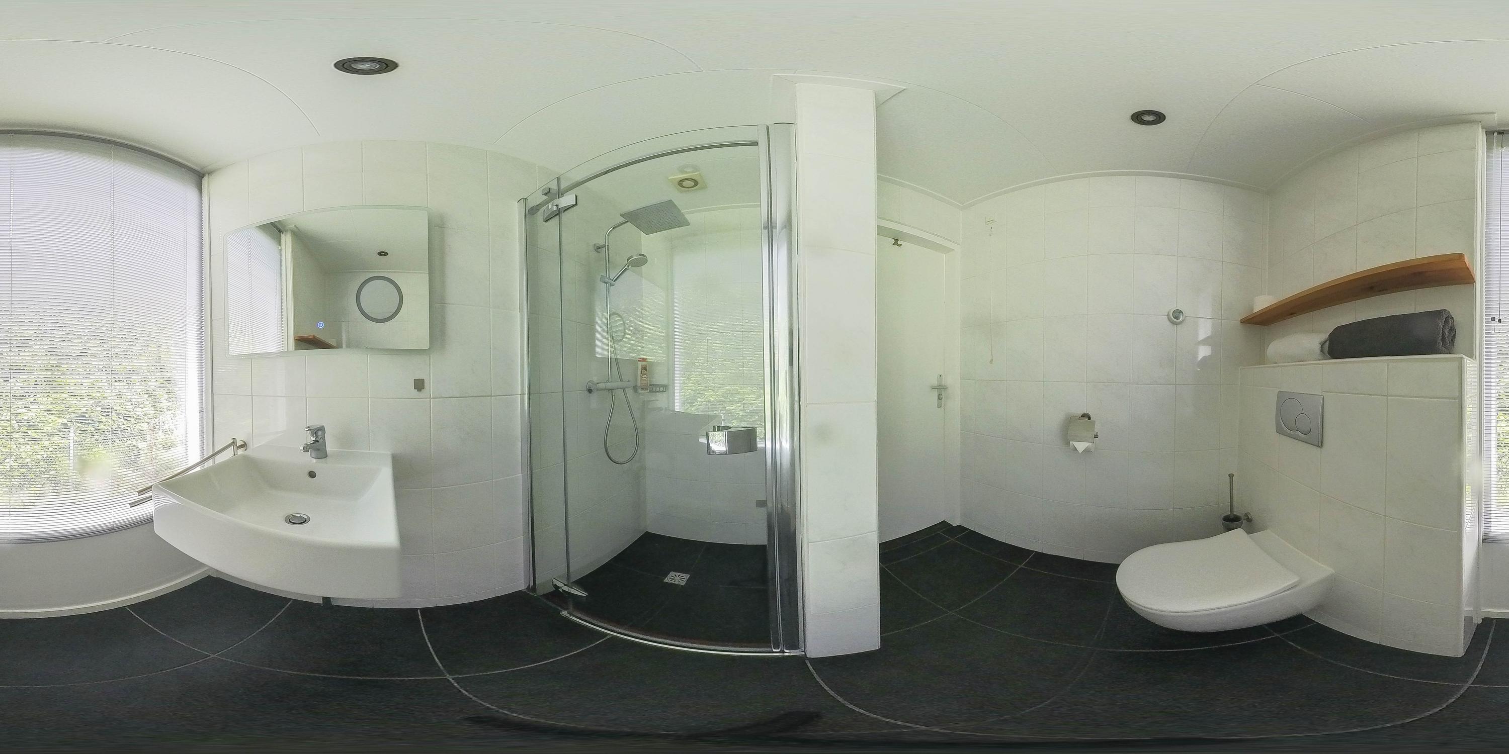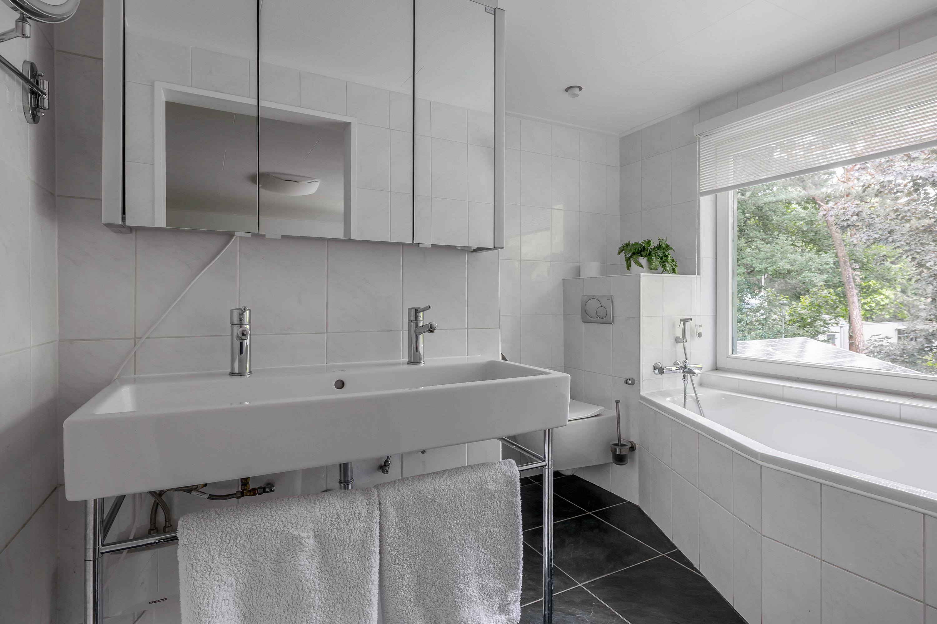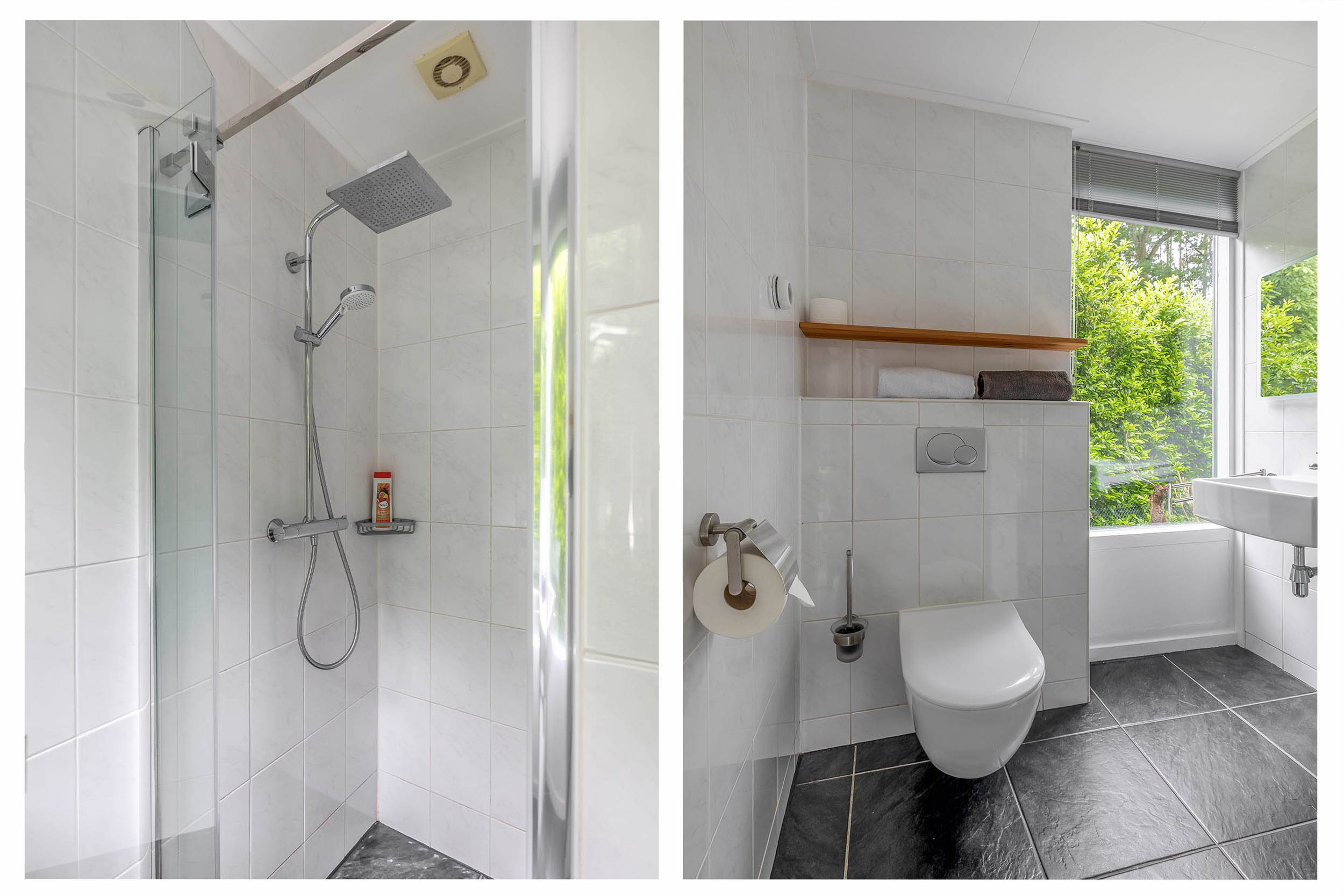 Aansluitend is er de geheel betegelde badkamer. Hier geniet je van een ruime doucheruimte met glasdeur, regendouche met thermostaatkraan, mechanische afzuiging, wastafel met verlichte en verwarmde spiegel en een toilet.