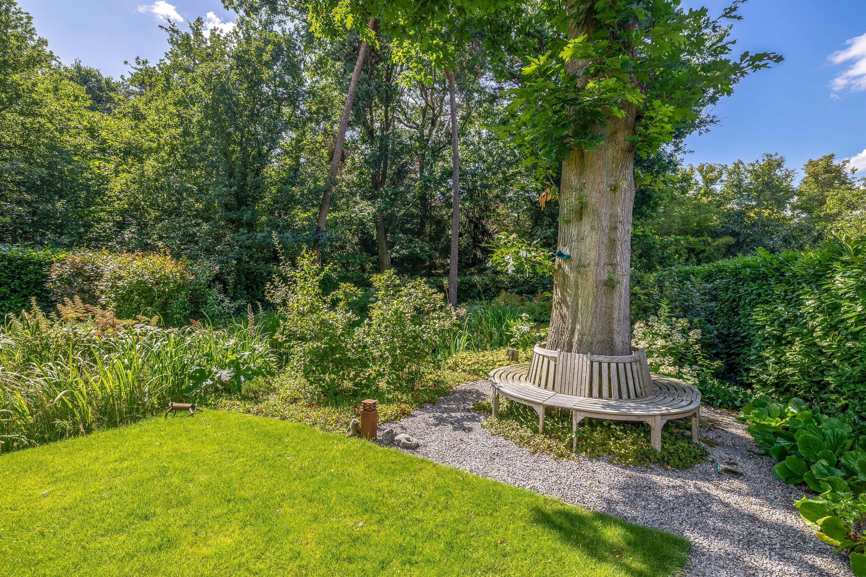 De achtertuin is een ware oase van privacy en rust. Je waant je hier letterlijk in een park omringd door volwassen groen en midden in de natuur. De tuin is rondom afgeschermd door een laurierhaag.. Hier zijn meerdere stroompunten en buitenkraantjes aanwezig, en voor gezellige avonden is er een buitenhaard te vinden! Het geheel is prachtig aangelegd met groot gazon, beplanting en een fraaie vijver. Natuurlijk mag een computergestuurde beregeningsinstallatie hier niet ontbreken. Een prachtige aangelegde tuin met walnotenboom, magnolia's en ook veel bosvruchten: blauwe bessen (25 kg per jaar), bramen en frambozen.