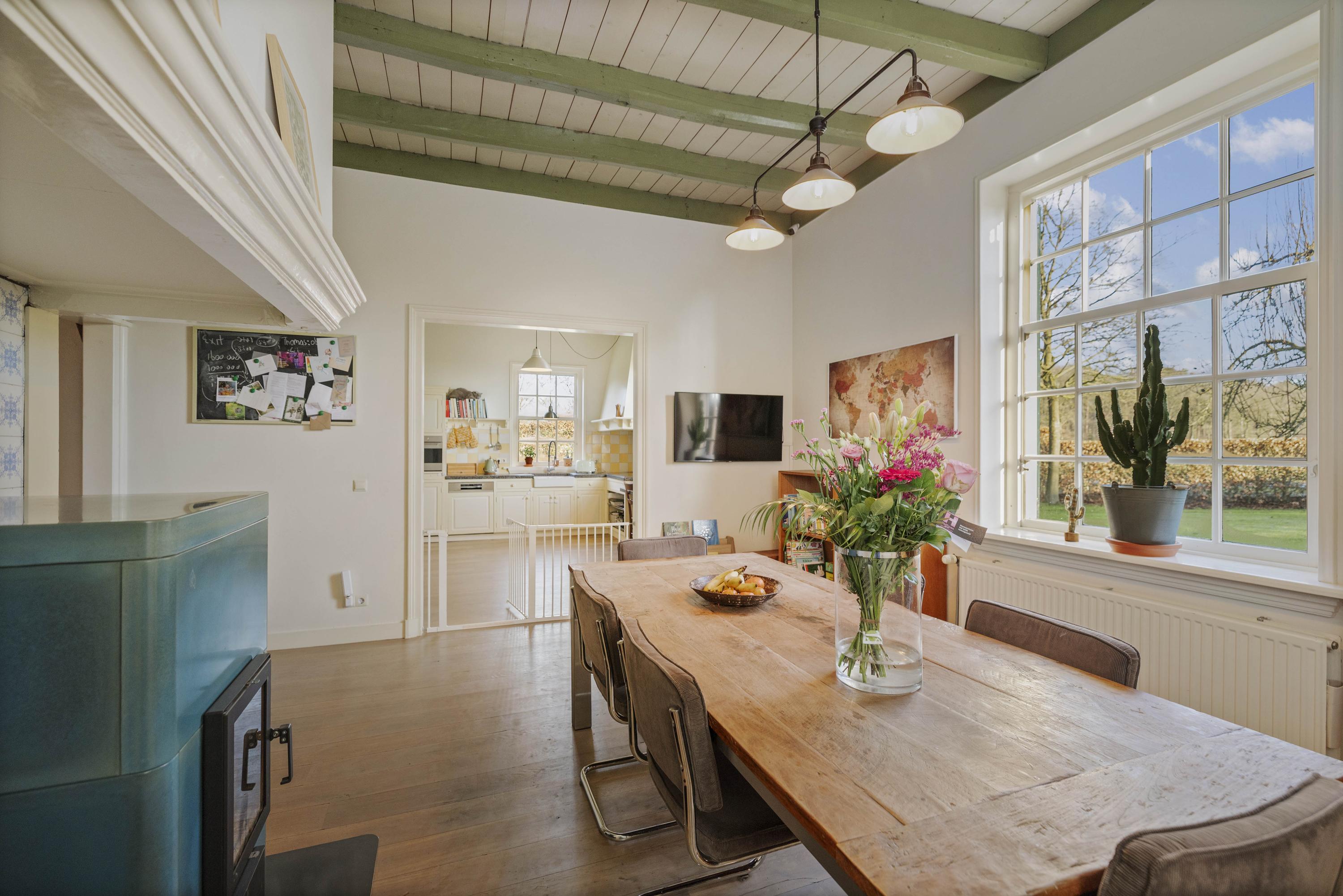 Aan de tuinzijde, in het voorhuis, bevinden zich de gezellige eetkamer en keuken. Ook hier ligt weer de fraaie eiken vloer. Een moderne tigchelkachel met aquablauw geglazuurde tegels houdt deze ruimte met gemak warm.