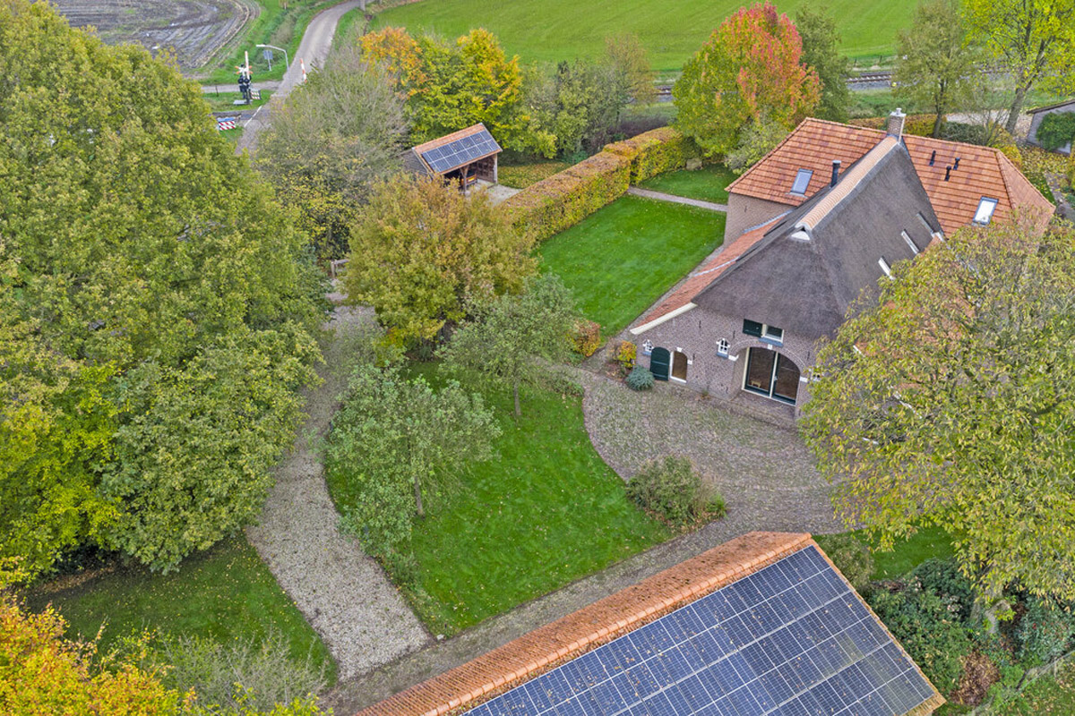 Het huis wordt omringd door een beeldige tuin. Er is een schuur met carport en aan de achterkant een afsluitbare tuingereedschapsberging (met op het dak 39 zonnepanelen - mooi uit het zicht), dus de auto’s staan droog, evenals de tuinspullen. Daarnaast is er een tweede houten bijgebouw (met op het dak 6 zonnepanelen) aanwezig, uitgevoerd in een landelijke stijl met potdekselwerk, Oud-Hollandse dakpannen en robuuste gebinten. Het bijgebouw biedt ruimte aan het parkeren van twee auto’s. Door de oriëntatie van het huis ligt er achter de woning een fijn zonneterras. Zowel aan de voor- als achterzijde zijn er grote gazons en de privacy wordt gewaarborgd door de manshoge beukenhagen. Naast de beukenhagen beschikt de tuin eveneens over volwassen geboomte, waaronder vier appelbomen, een perenboom, een monumentale tamme kastanje alsmede een monumentale walnotenboom.